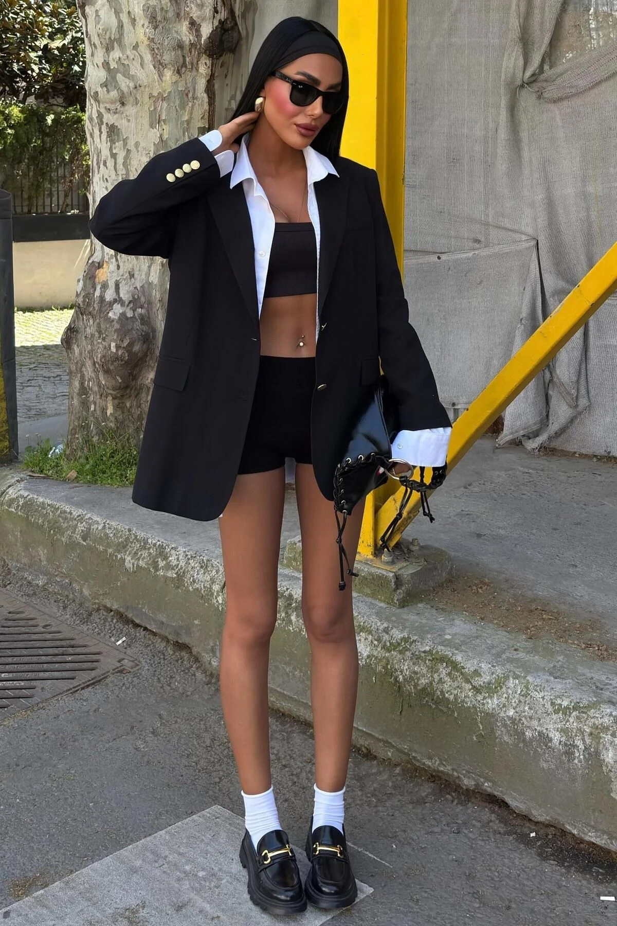 Kadın Siyah Dokuma Kruvaze Uzun Ceket