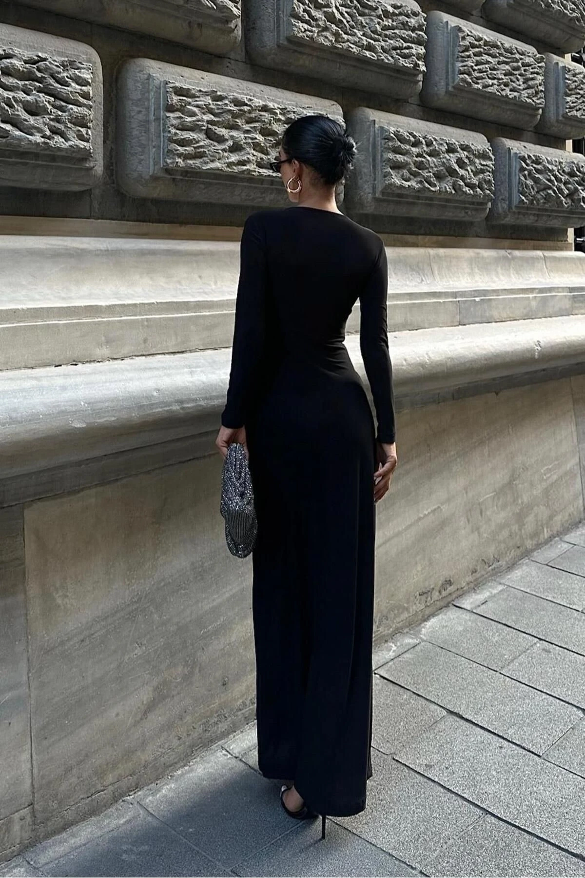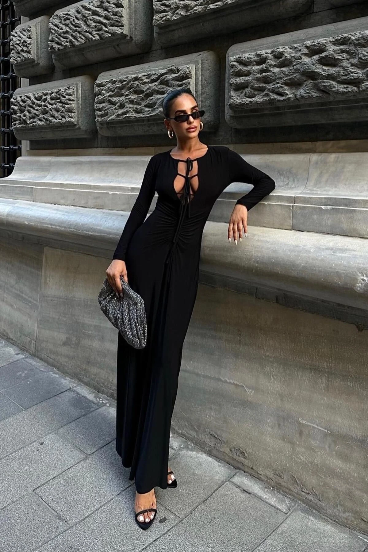 Kadın Siyah Dokuma Uzun Bisiklet Yaka Elbise