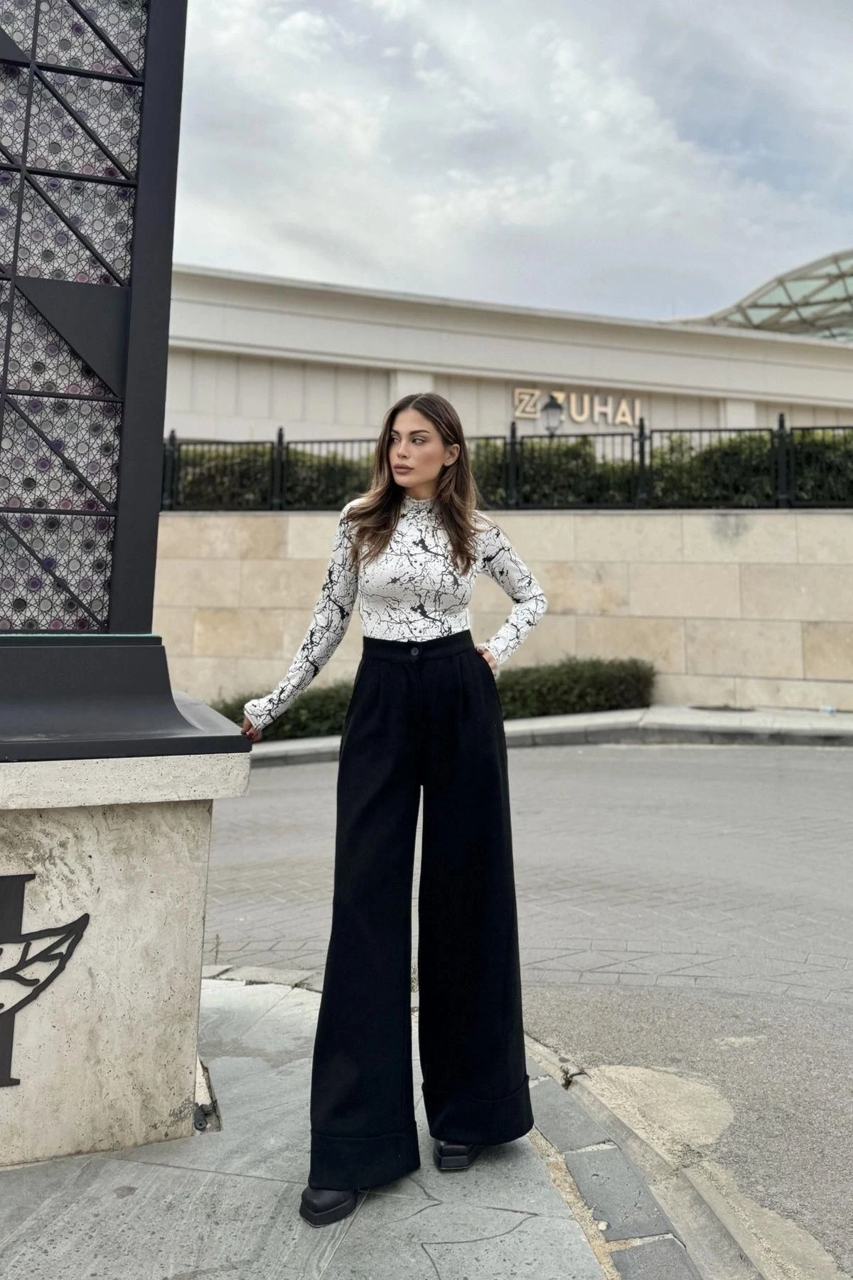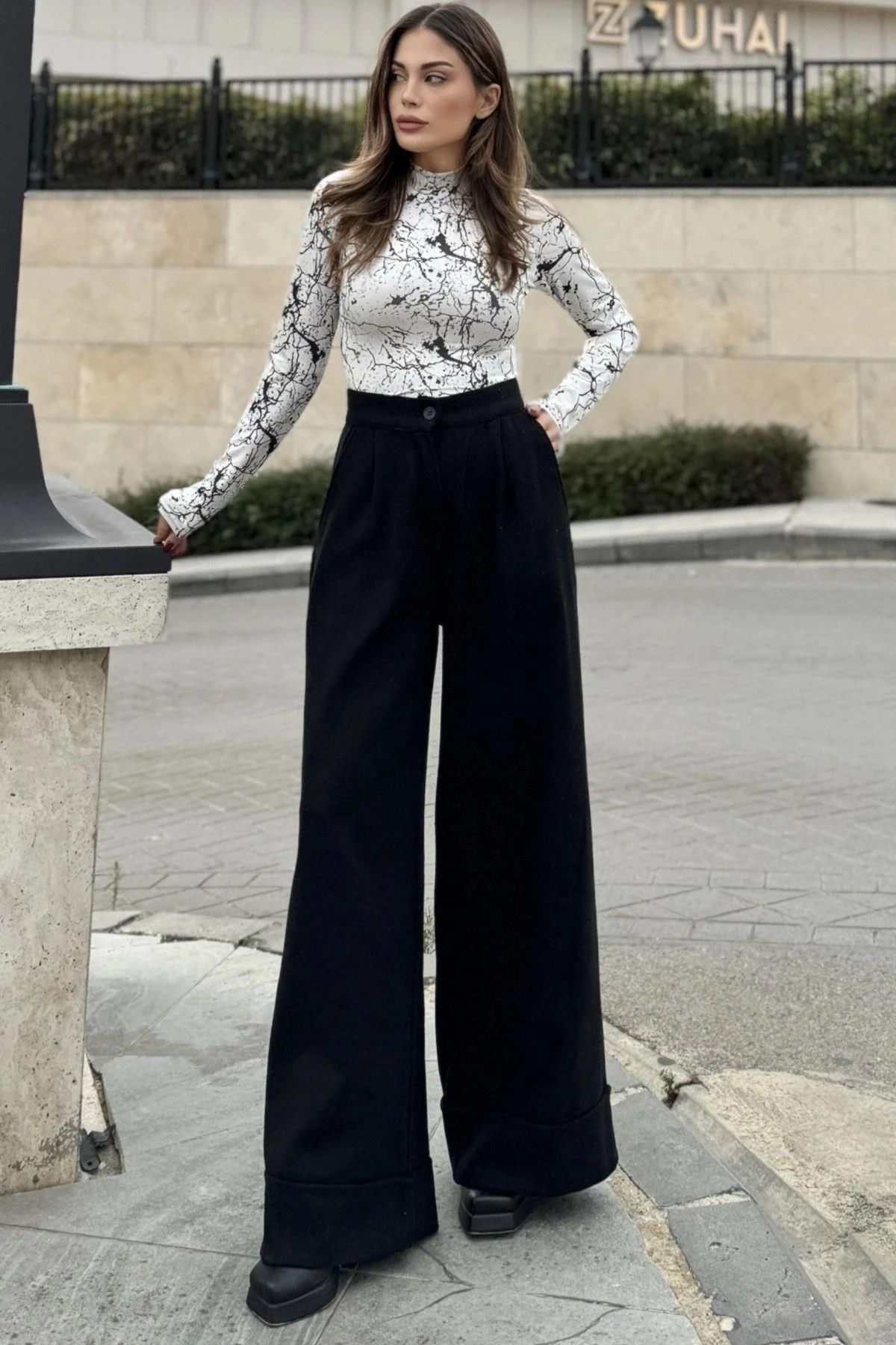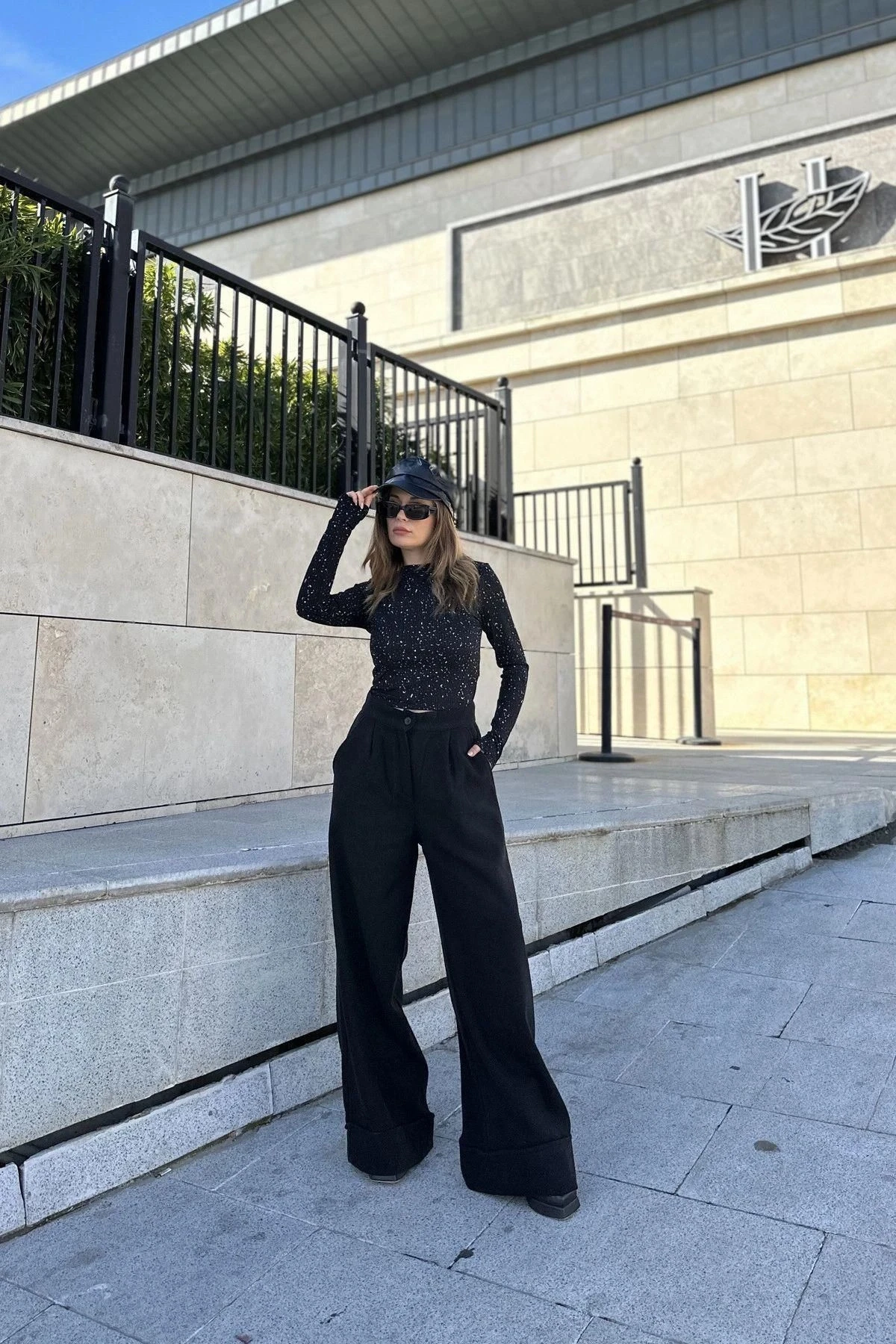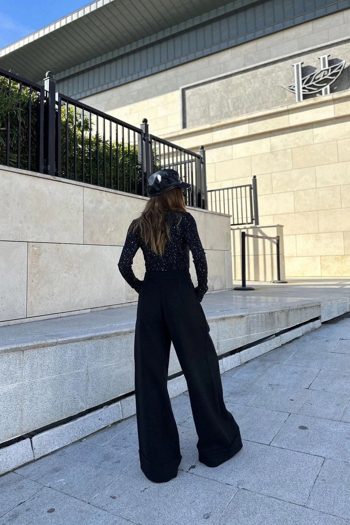 Kadın Siyah Duble Paça, Beli Pliseli, Fitilli Kaşe Kumaş, İspanyol Pantolon