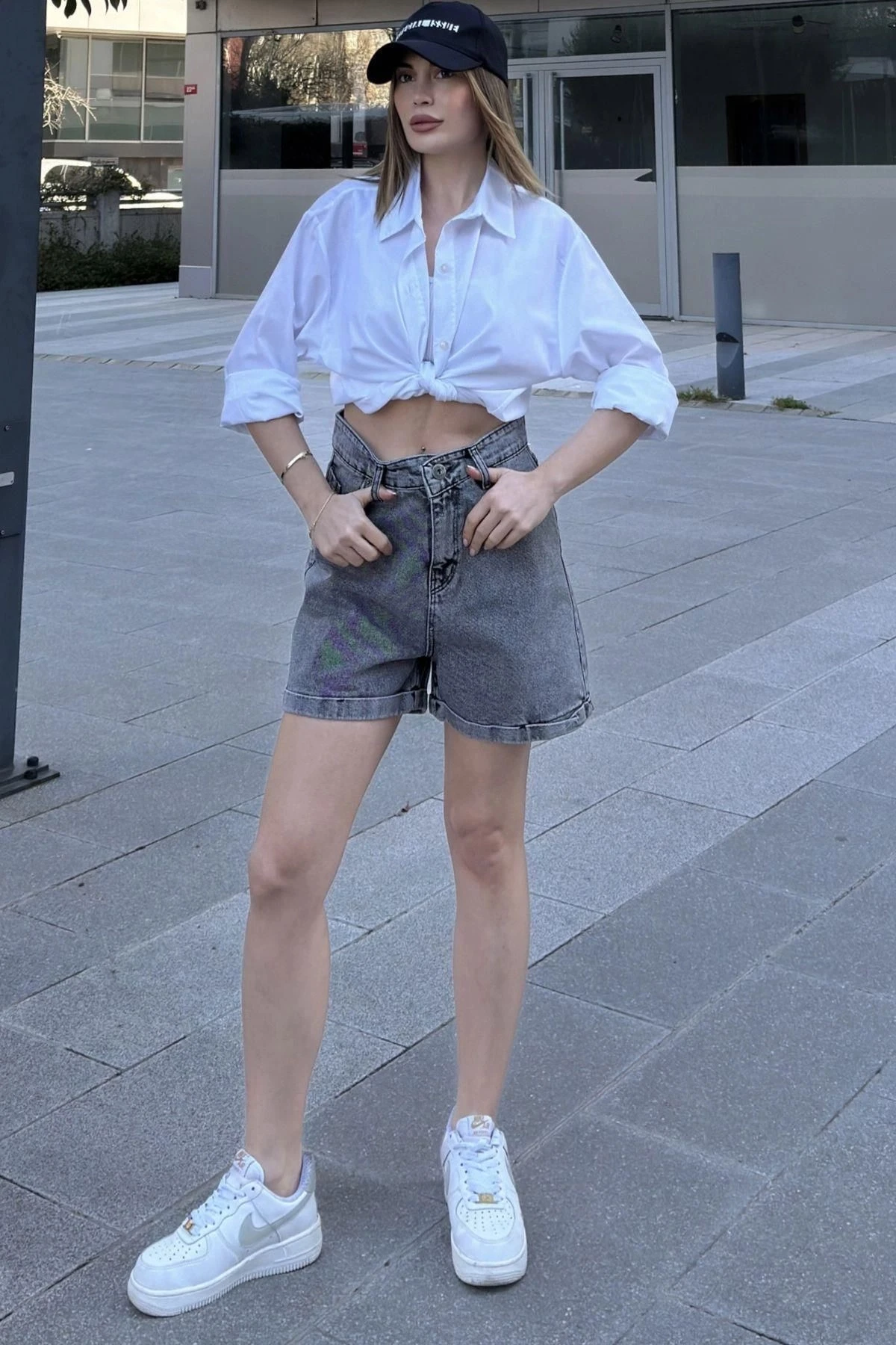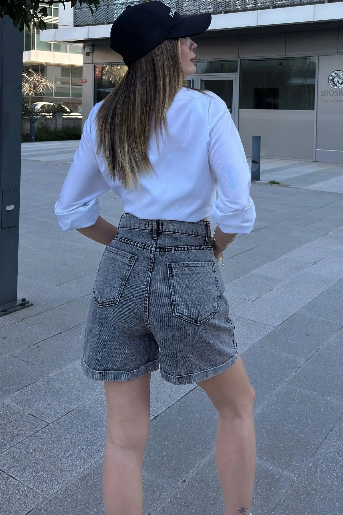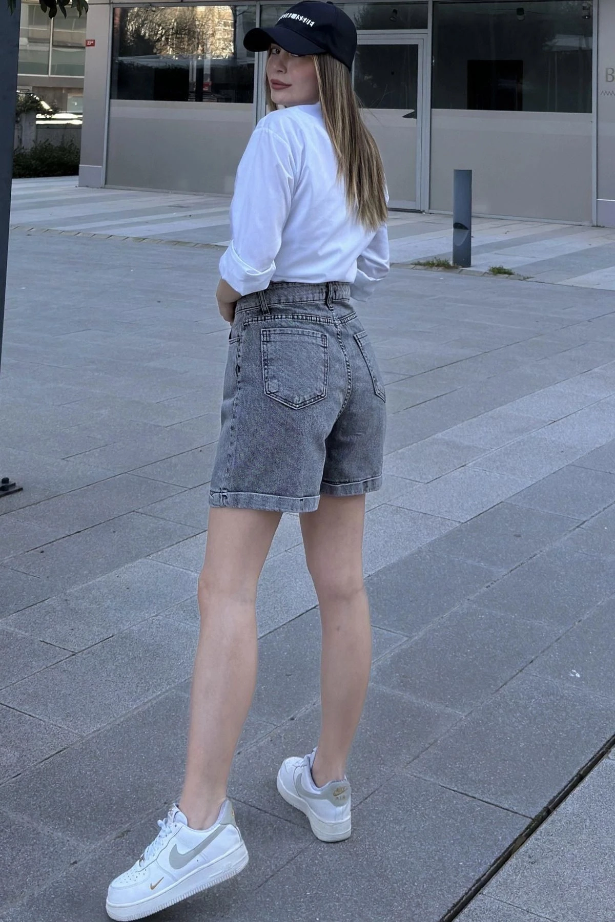 Kadın Siyah Duble Paça, Yüksek Bel, Rahat Denim-Kot Şort