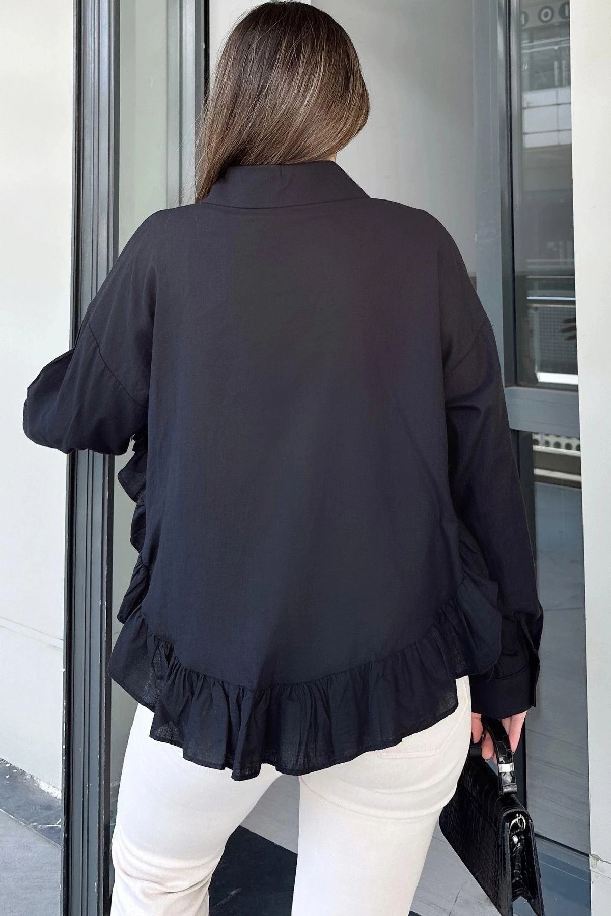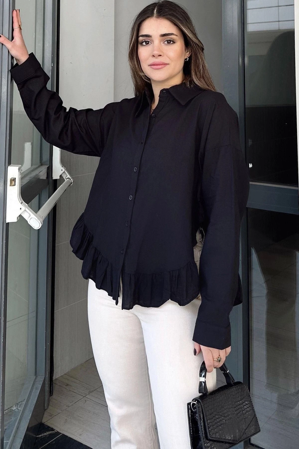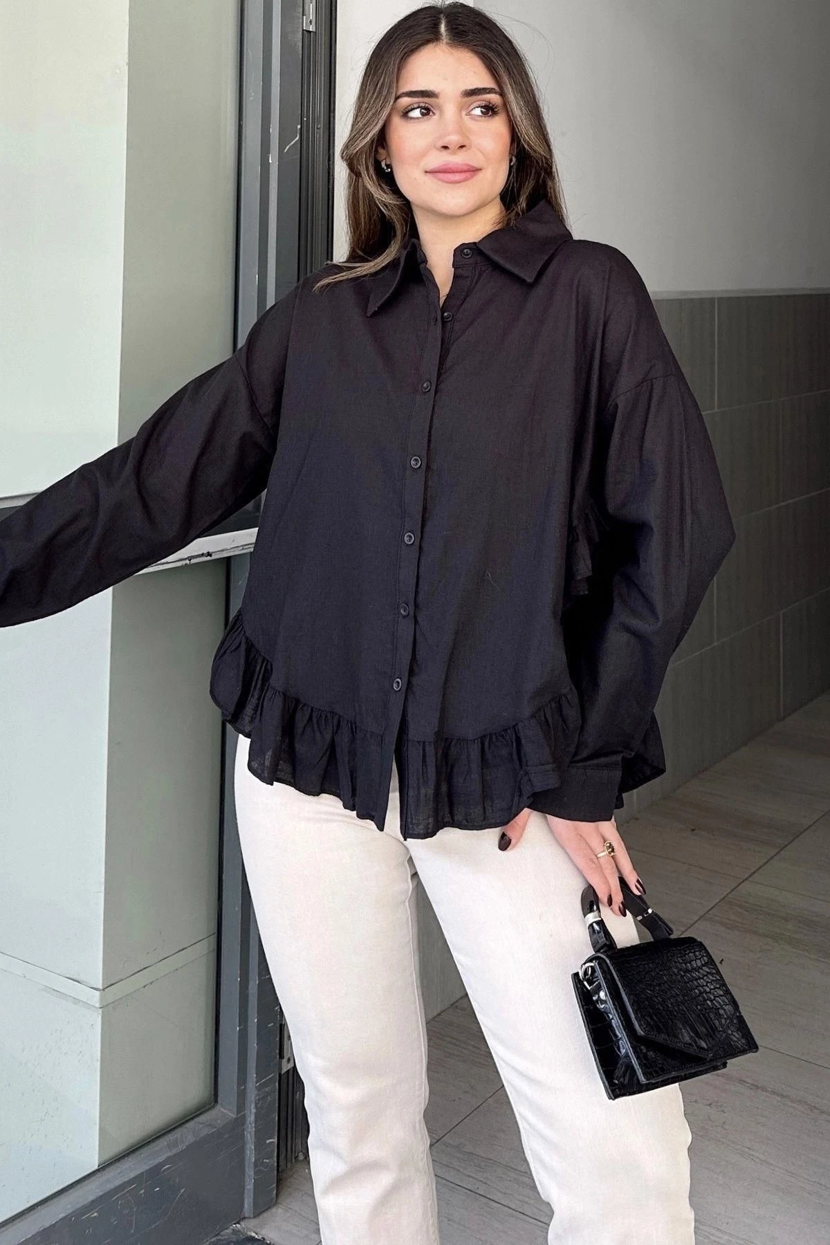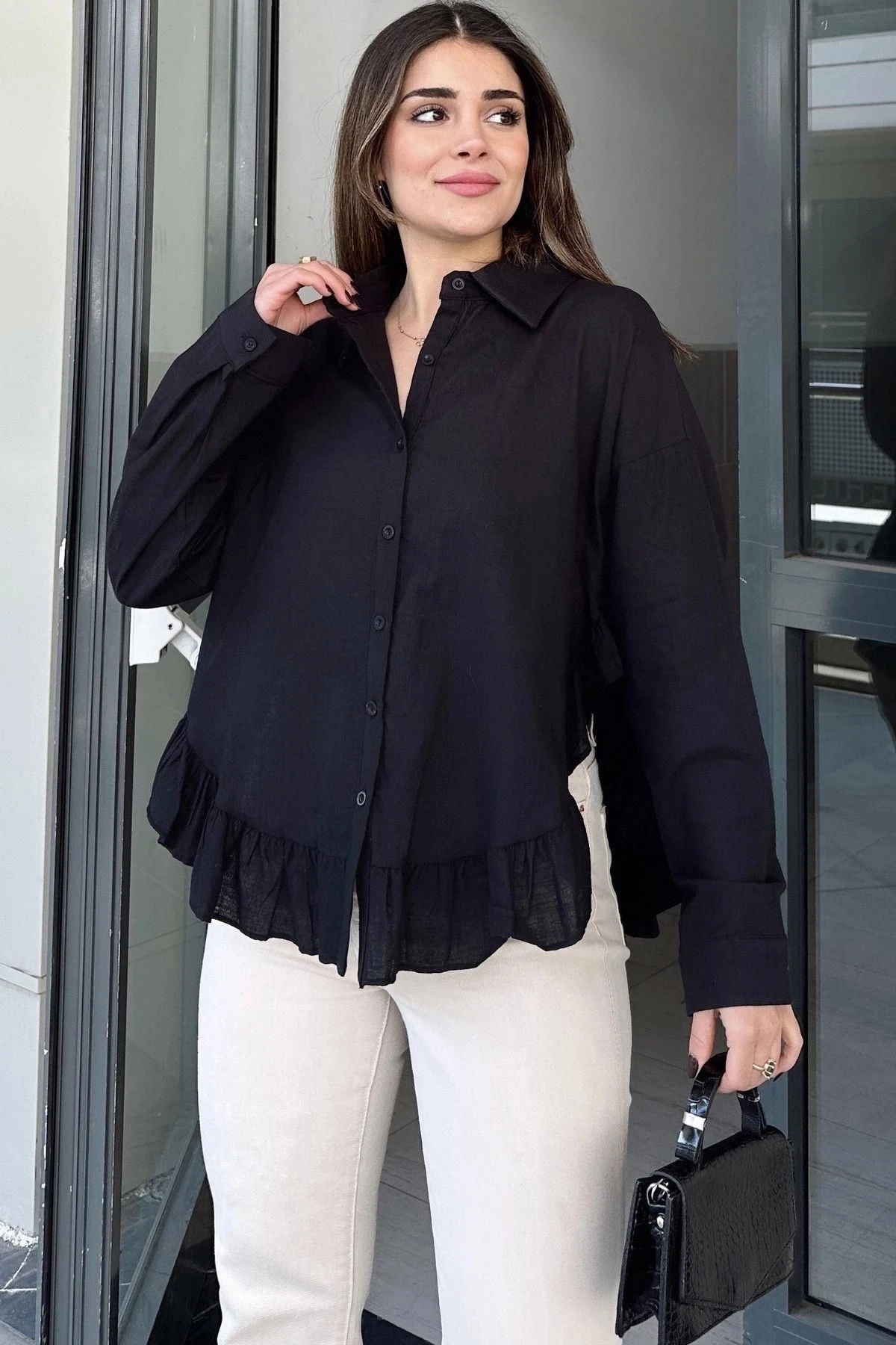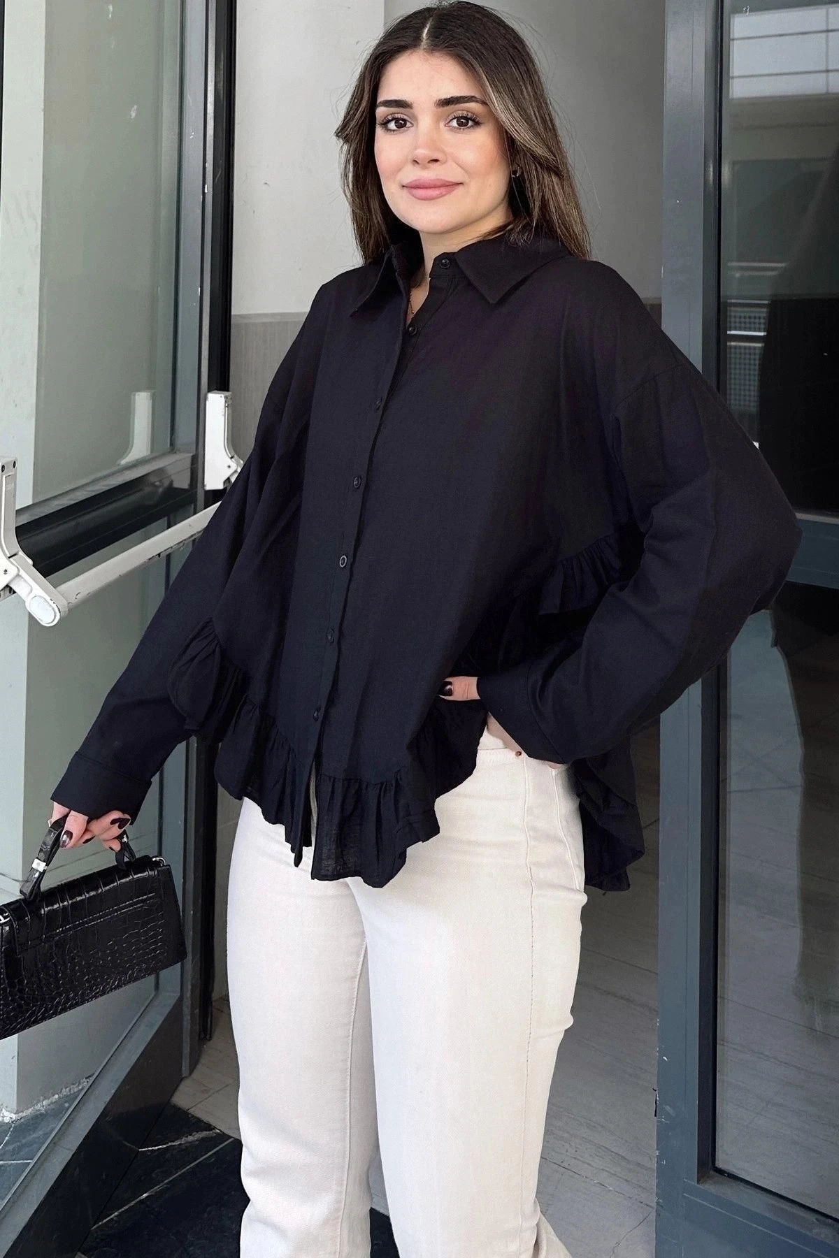 Kadın Siyah Eteği Fırfır Ve Yırtmaç Detaylı, Terletmez Rahat Kumaş, Salaş Gömlek ( Pamuklu Keten)