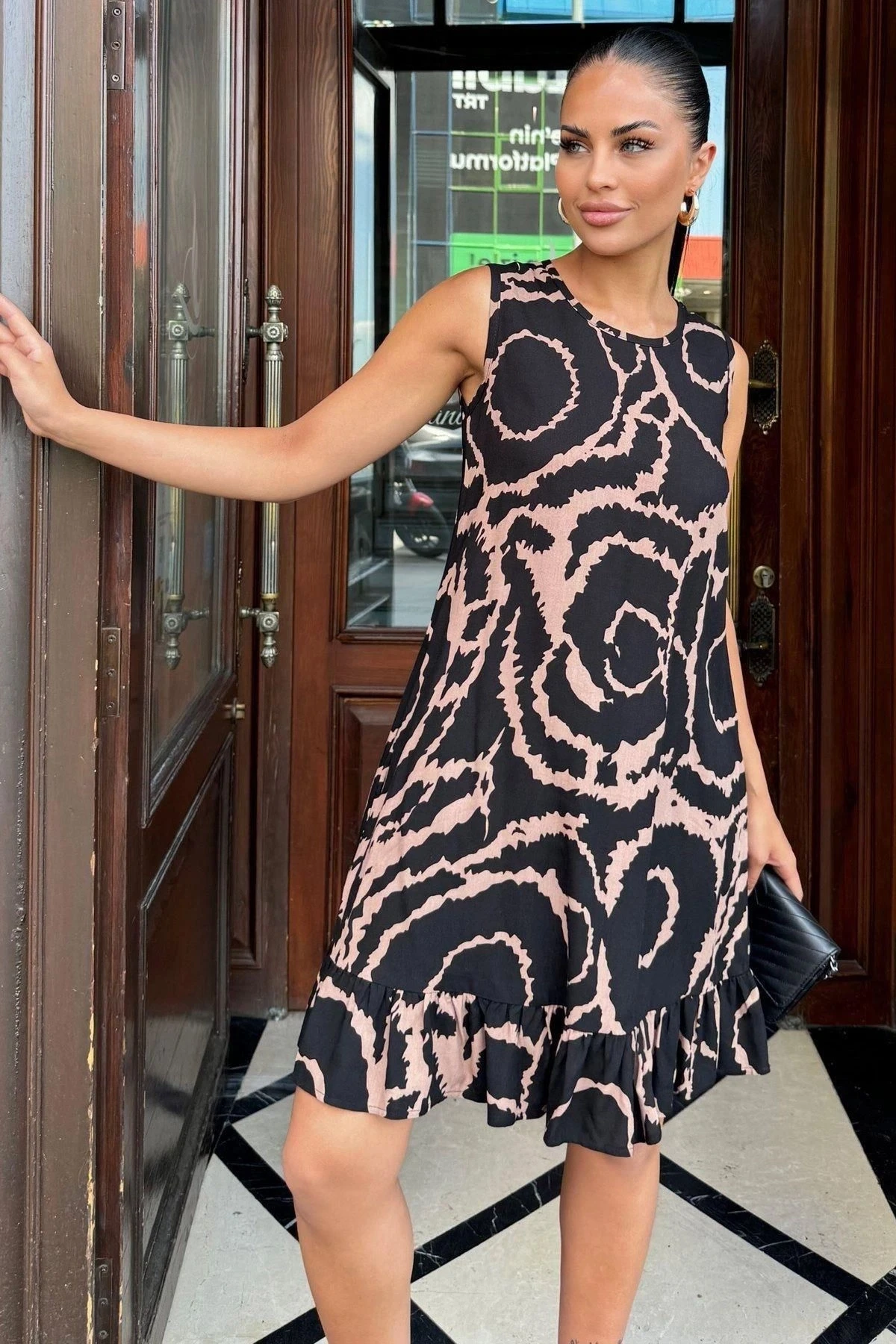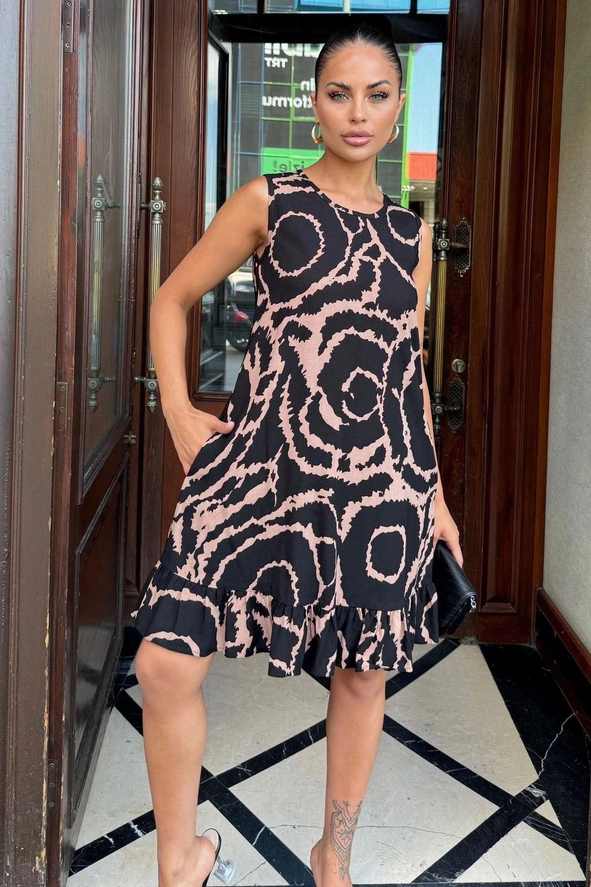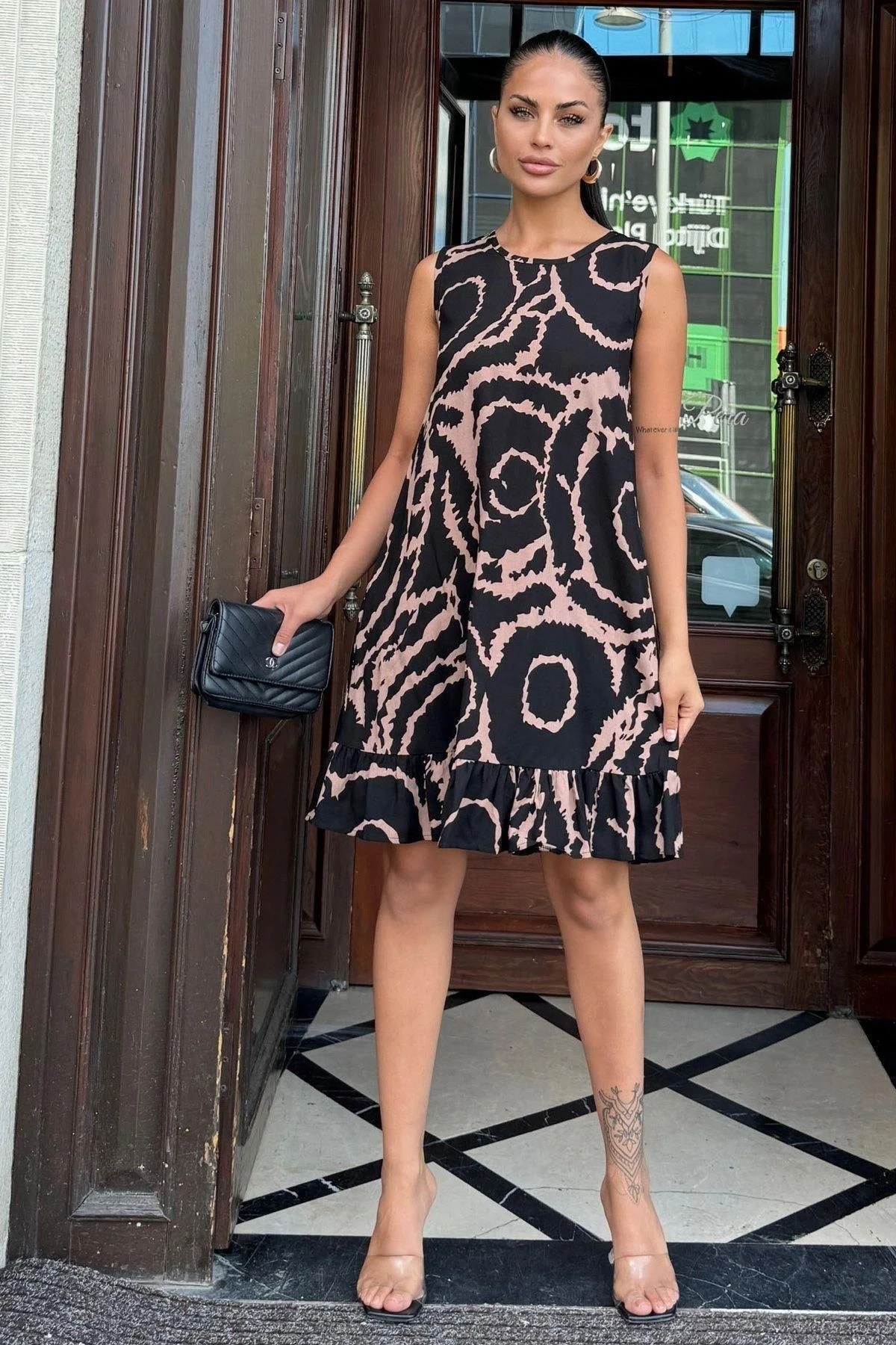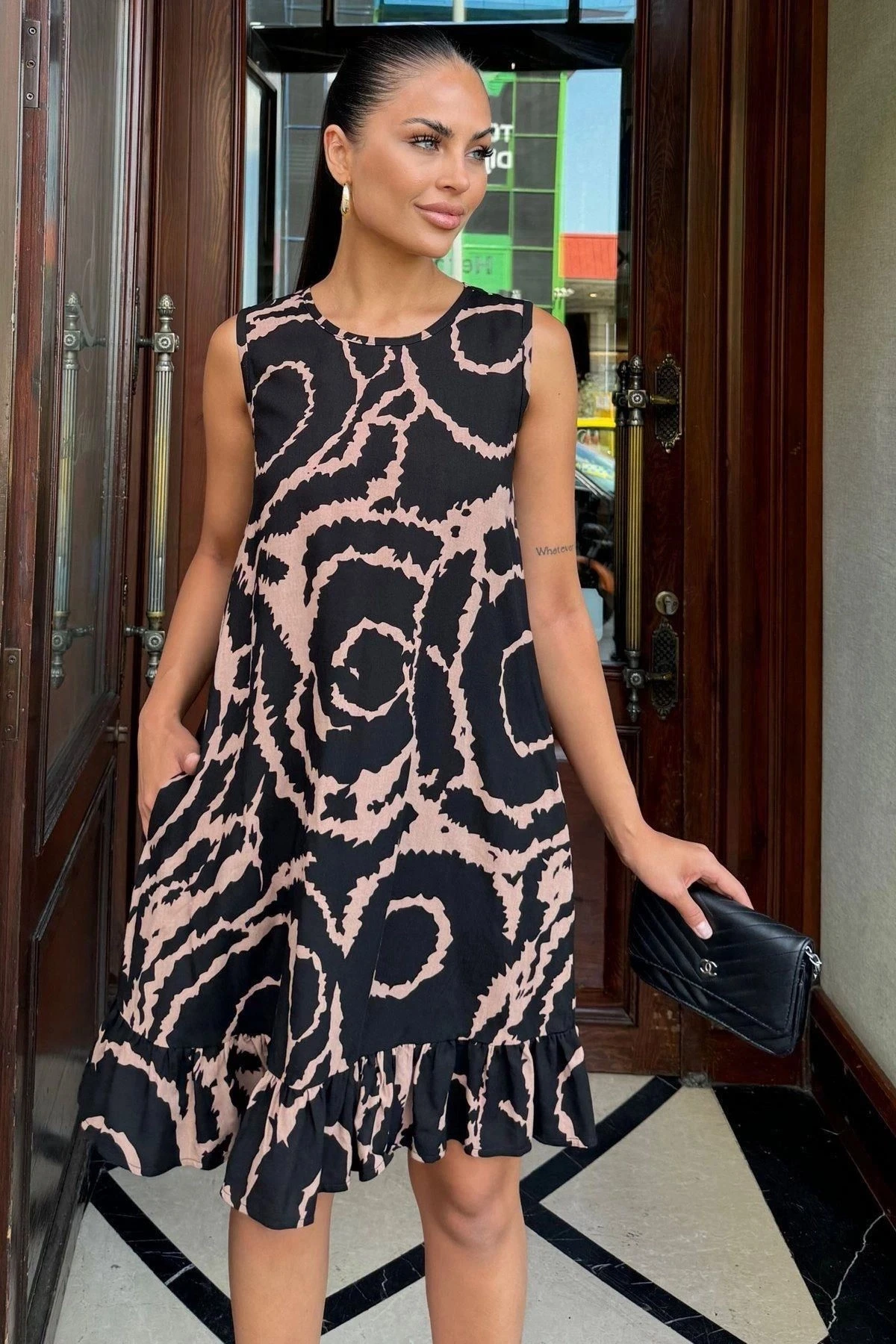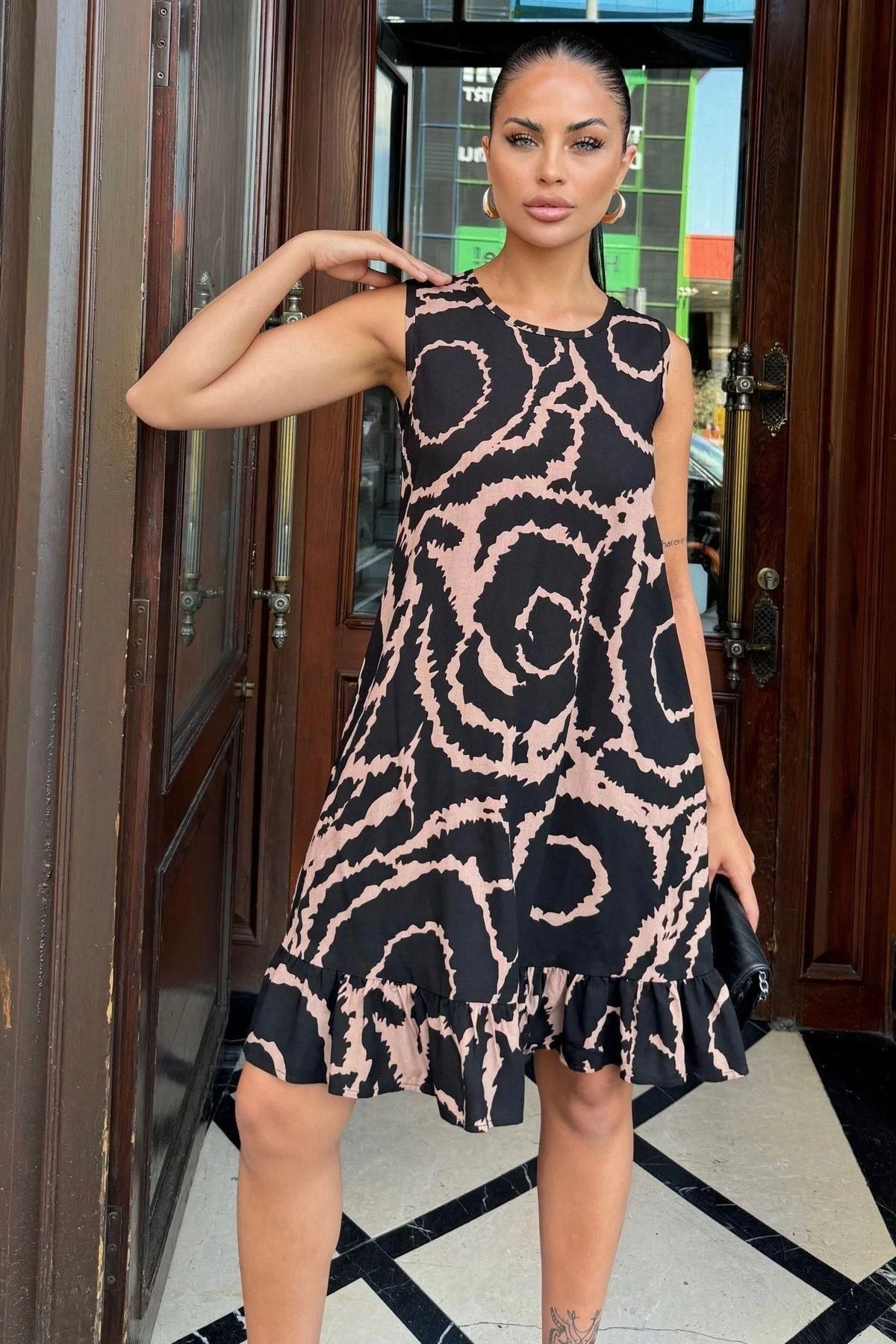 Kadın Siyah Fırfır Etek Detaylı, Şık Ve Rahat, Kolsuz Midi Elbise