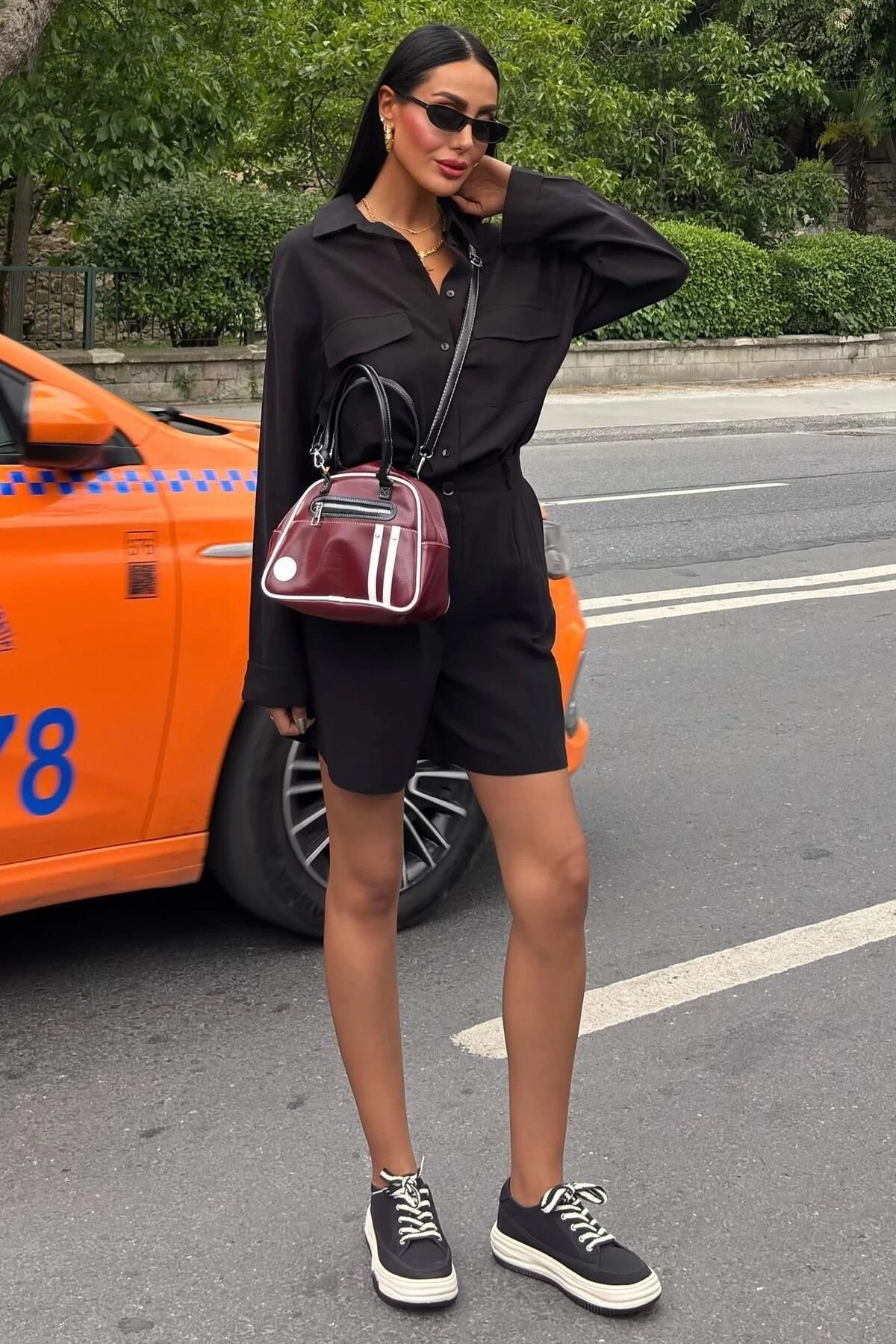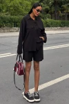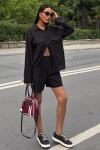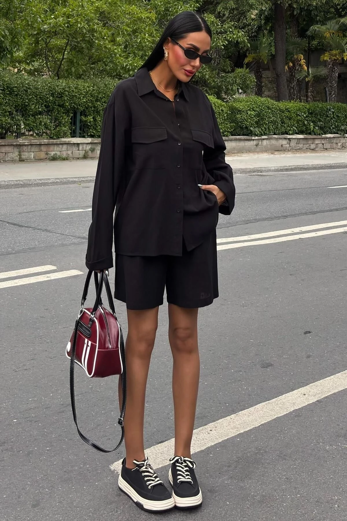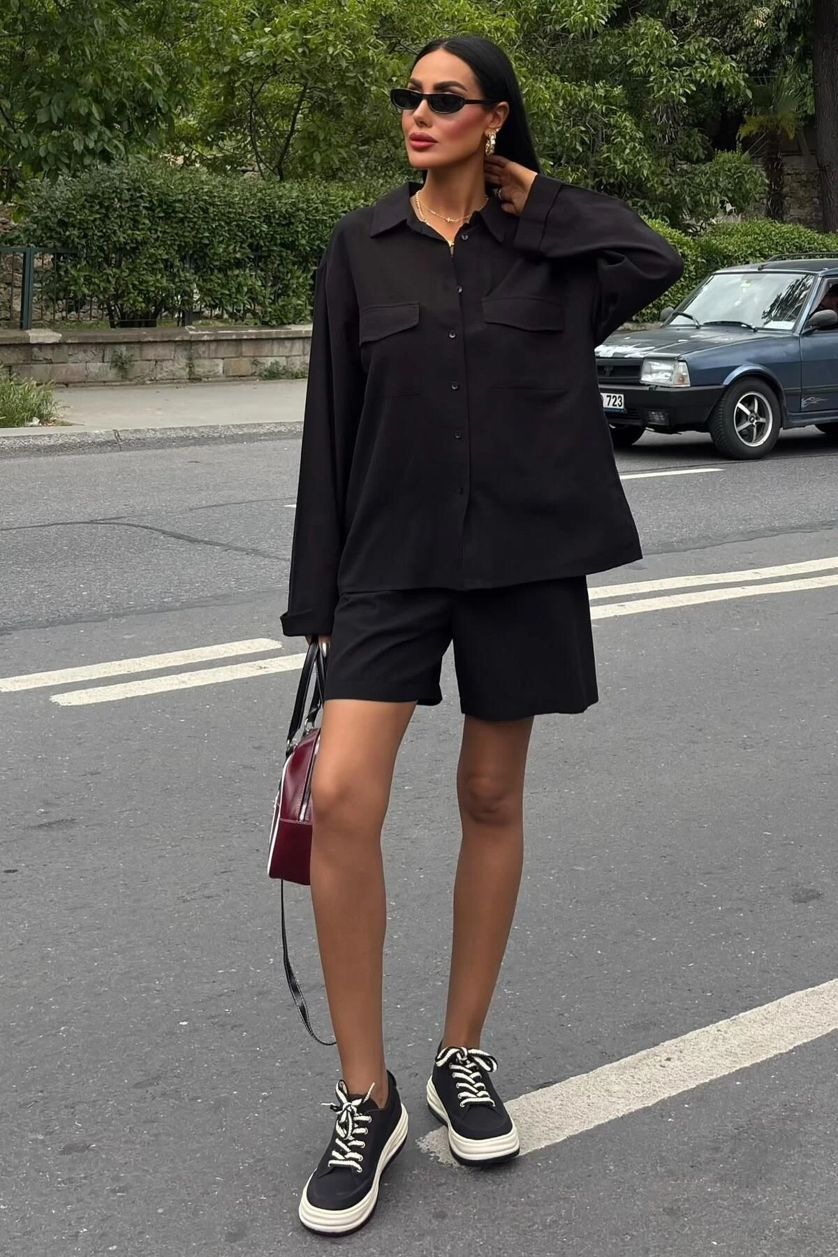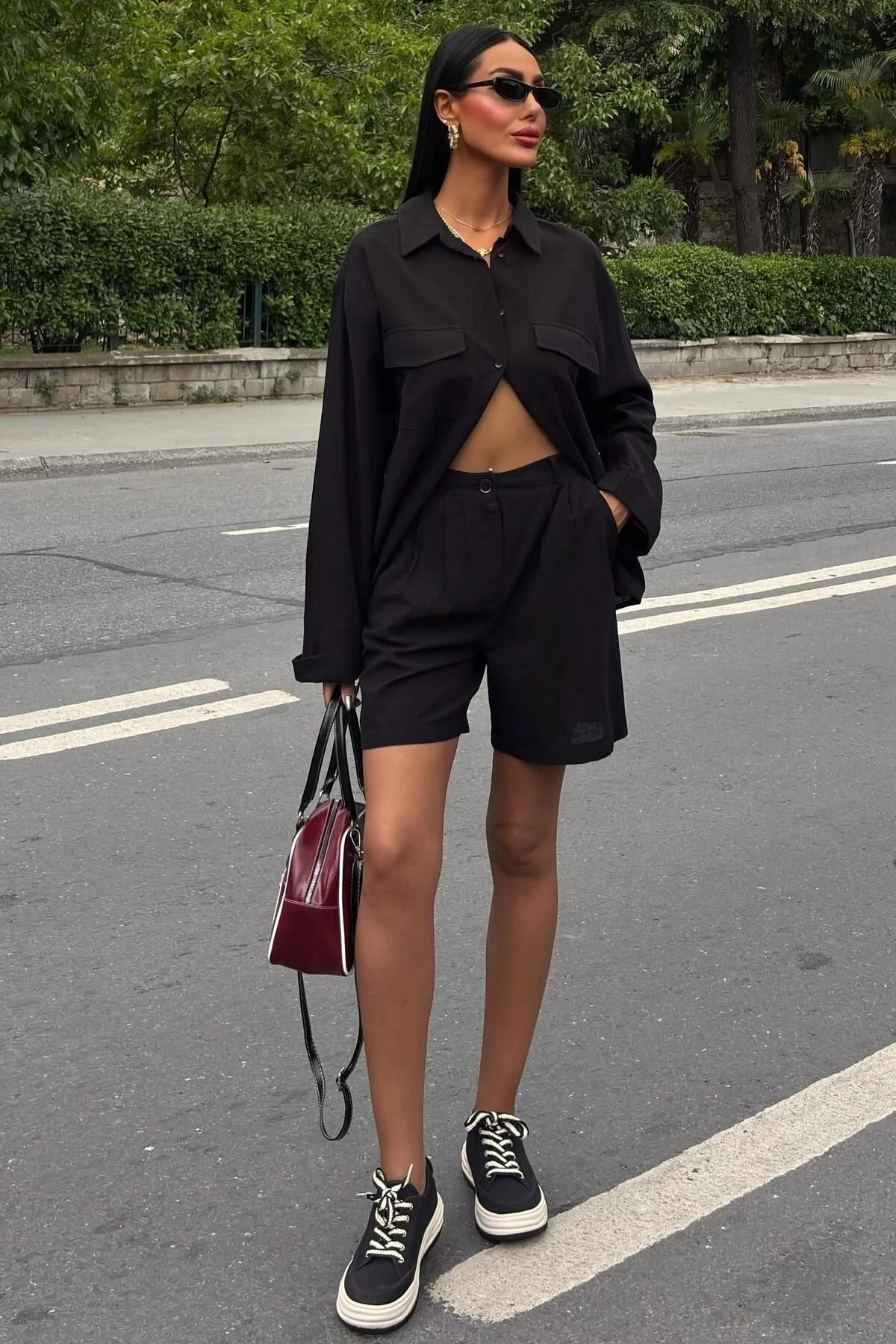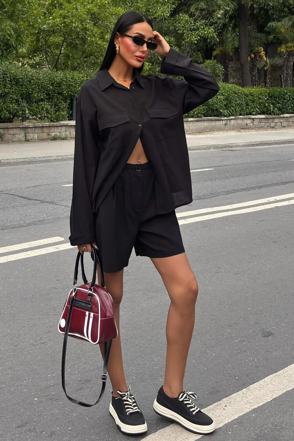 Kadın Siyah Flamlı Keten Düz Gömlek ve Şort Takım