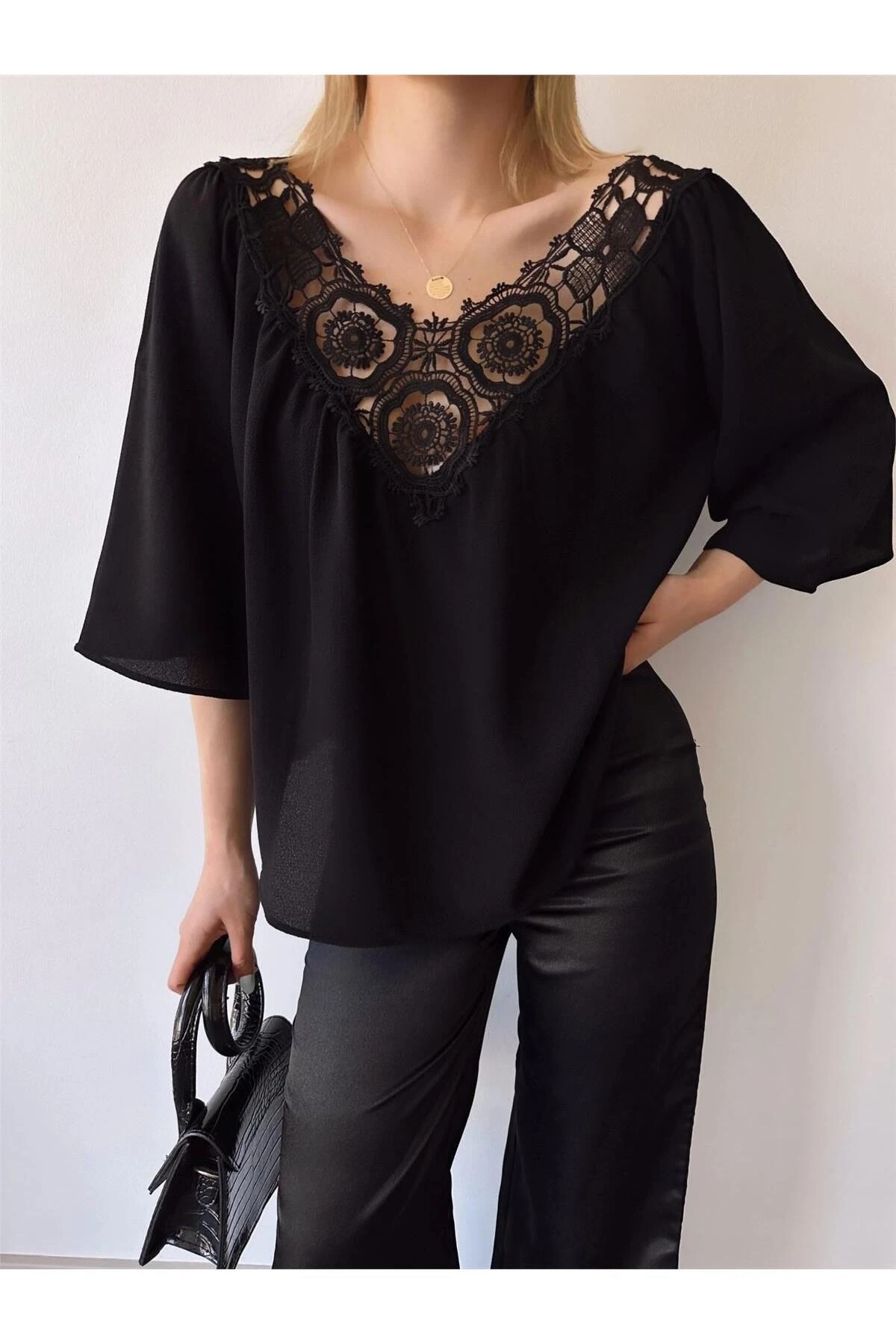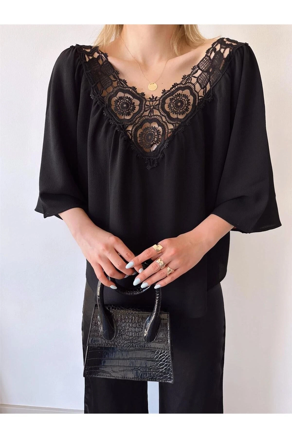 Bu kadın siyah flare kol V yaka uzun bluz, zarafeti ve şıklığı bir arada sunuyor.; Bluzun kumaşı %60 polyester ve %40 pamuk karışımından oluşur.; Bu karışım, bluzun dayanıklılığını artırırken aynı zamanda konforlu bir giyim deneyimi sunar.; V yaka tasarımı, bluza modern bir hava katar ve boyun bölgesini zarif bir şekilde vurgular.; Dantel/güpür deseni, bluza görsel bir çekicilik ve zarafet kazandırır.; Siyah renk, klasik ve şık bir seçenektir.; Geniş kesim kalıp/kesimi, bluzun rahat ve gevşek bir şekilde vücuda oturmasını sağlar.; Bu kesim, hareket özgürlüğü ve rahatlık sunar.; Dokuma kumaşı ise hafif ve nefes alabilir bir yapıya sahiptir, böylece bluzu uzun süre boyunca rahatlıkla giyebilirsiniz.; Ön ve arkası dantel detayları, bluza zarif bir dokunuş katar.; Bu detaylar, bluzun önemli bir ayrıntıya sahip olmasını sağlarken aynı zamanda feminen bir görünüm sunar.; Bu siyah flare kol V yaka dantel/güpür desenli geniş kesim kalıp/kesim dokuma uzun bluz, zarafet ve şıklık arayan kadınlar için mükemmel bir seçimdir.; %60 polyester ve %40 pamuk karışımıyla, bluz dayanıklılık ve konfor sunar.; Dantel/güpür deseni ve siyah rengiyle zarif bir görünüm sağlar.; V yaka tasarımı, bluza modern bir hava katar ve boyun bölgesini vurgular.; Geniş kesim kalıp/kesimi, rahatlık ve hareket özgürlüğü sunar.; Dokuma kumaşı, hafiflik ve nefes alabilirlik sunar.; Ön ve arkası dantel detayları, bluza zarif bir dokunuş ve feminen bir görünüm katar.; Bu bluz, günlük kullanımdan özel etkinliklere kadar birçok farklı durumda tarzınızı tamamlamak için idealdir.; Gardırobunuzun vazgeçilmez bir parçası olacak.