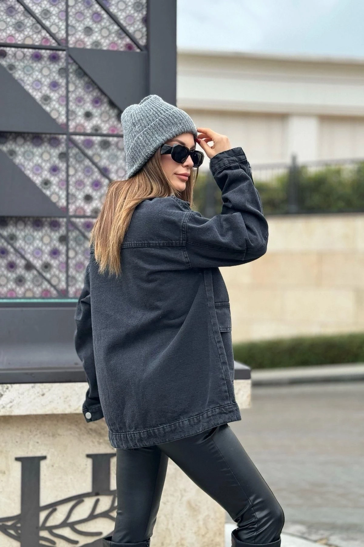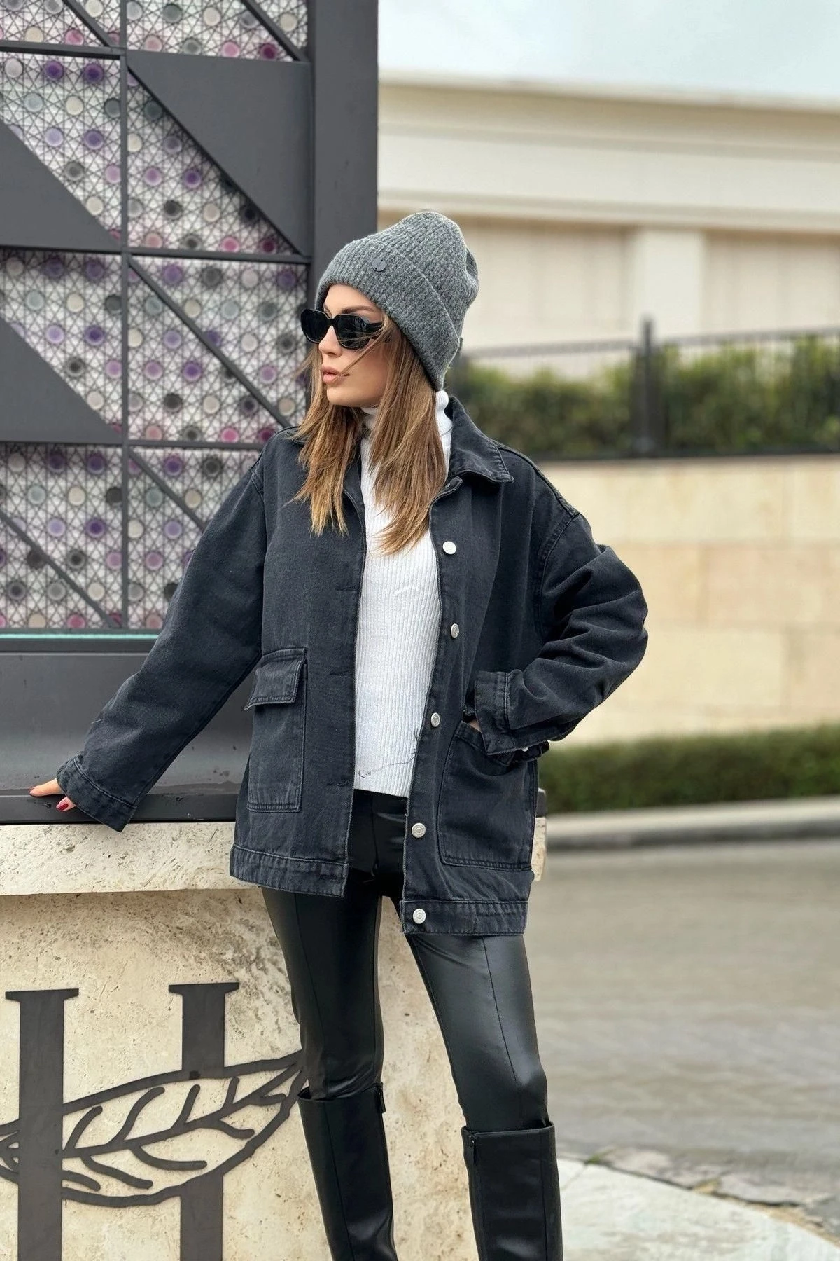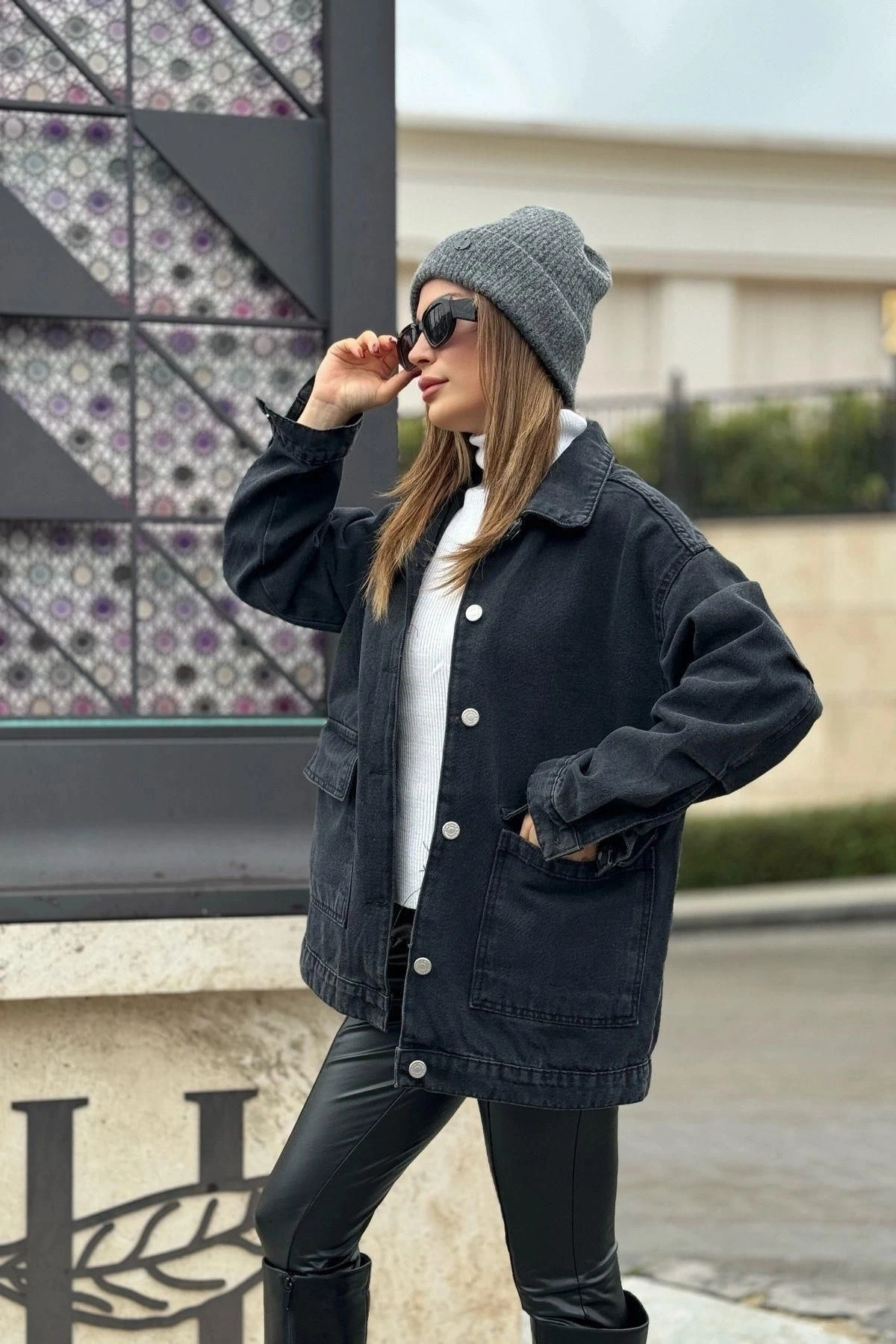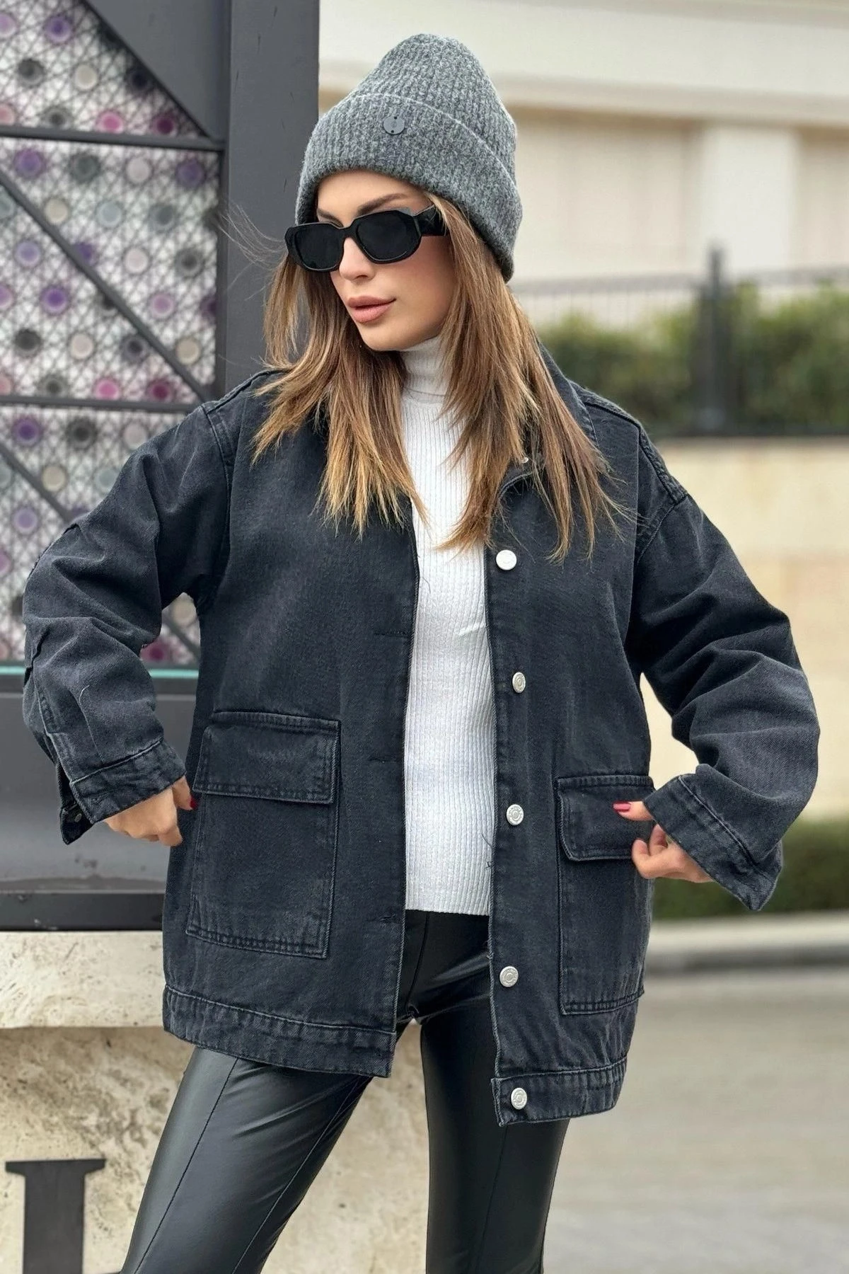 Kadın Siyah Geniş Cepli, Kaliteli Jeans Kumaş, Salaş Kot Ceket