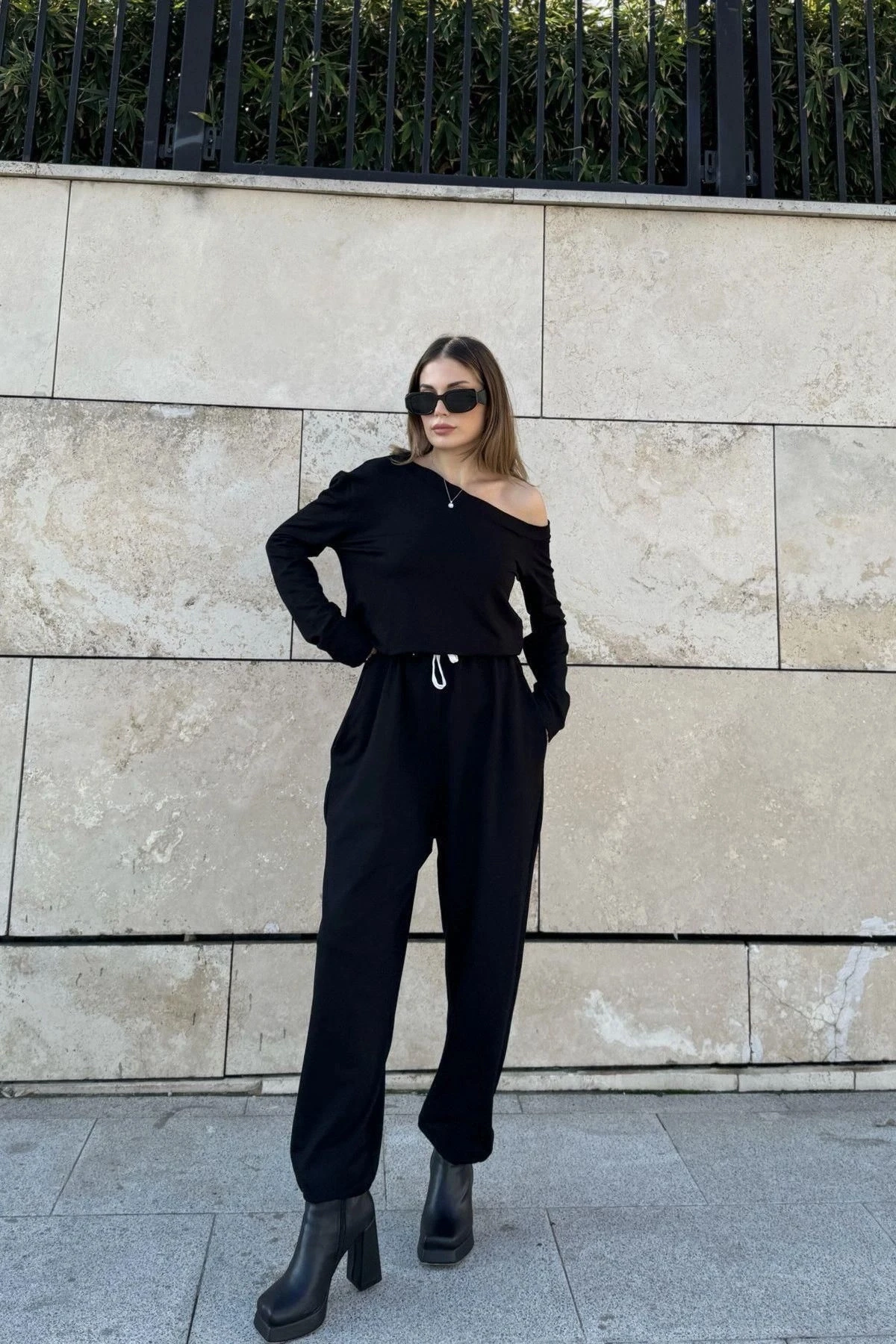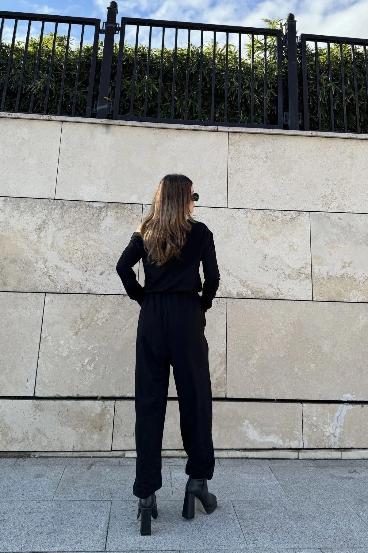 Kadın Siyah Geniş Yaka, Beli Bağcıklı, Paçaları Lastikli Uzun Kol Salaş Tulum