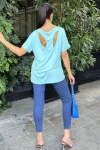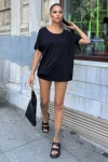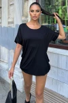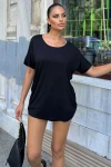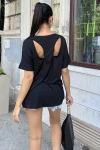 Kadın Siyah Geniş Yaka, Kısa Kollu, Sırtı Dekolteli, Dökümlü Kumaş, Salaş Bluz