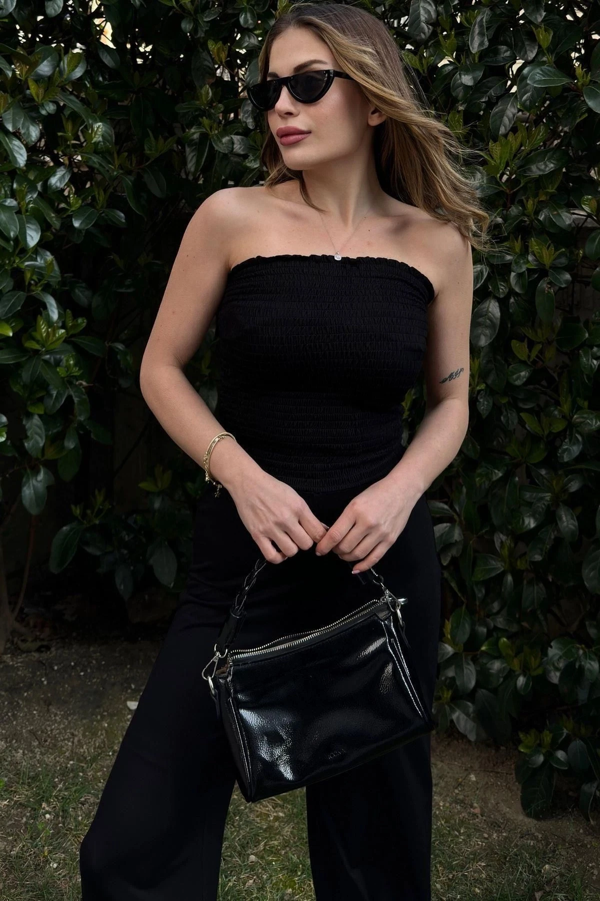 Kadın Siyah Gipeli Straplez Yaka, Bol Paça Rahat Ve Esnek Tulum