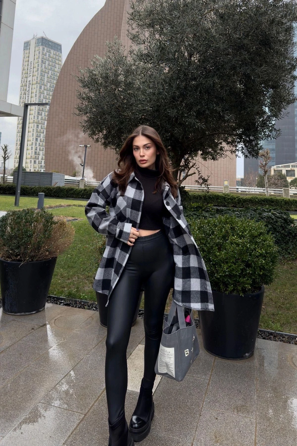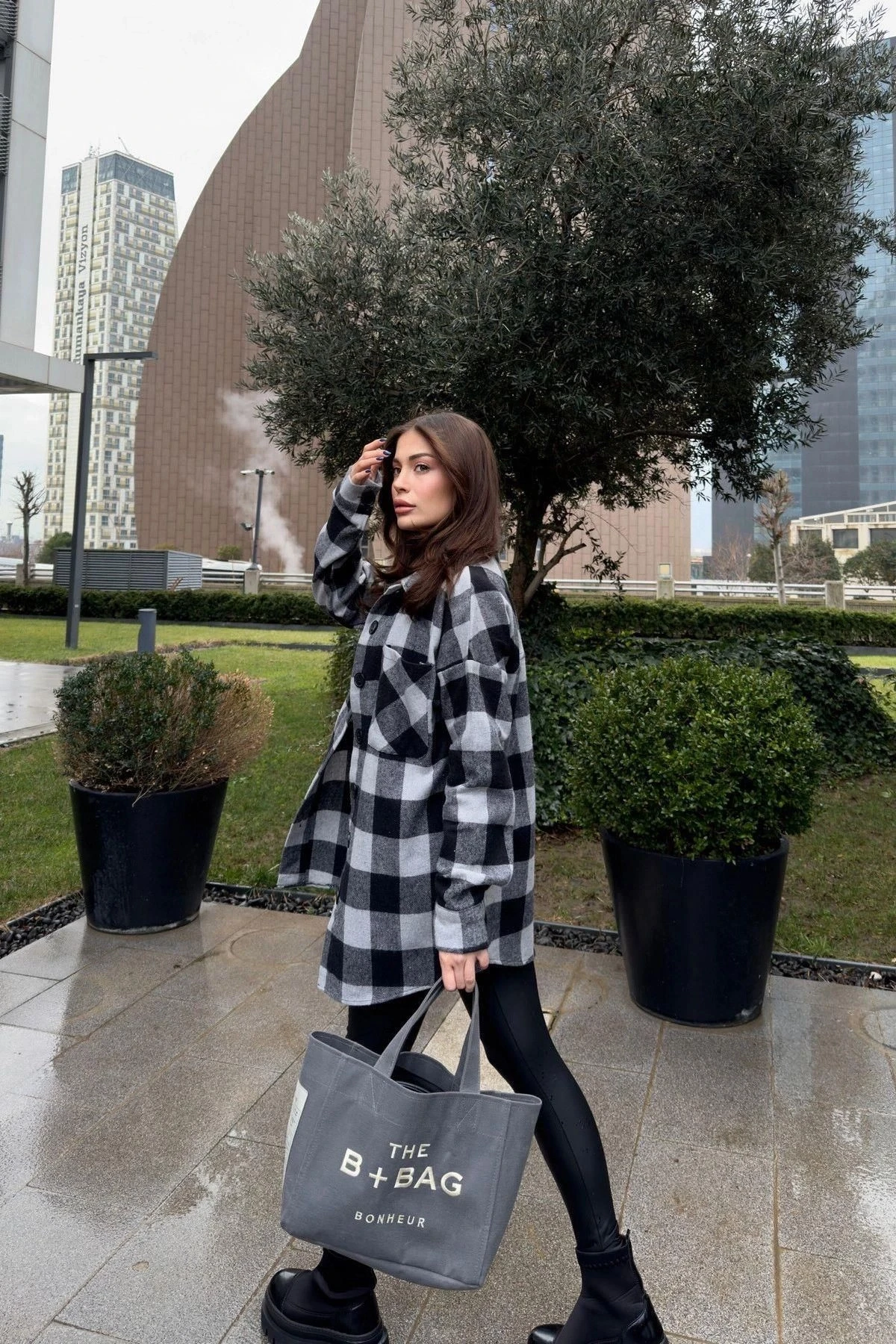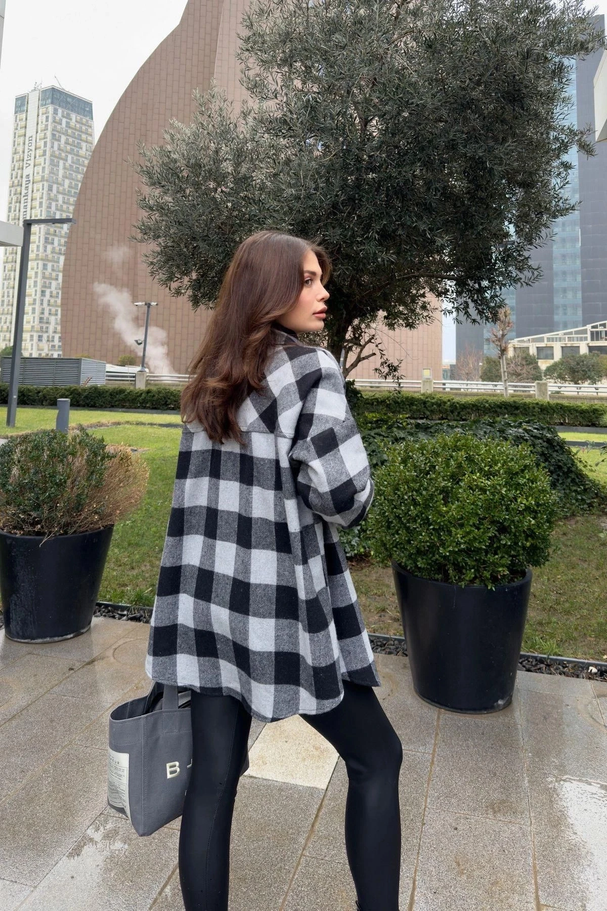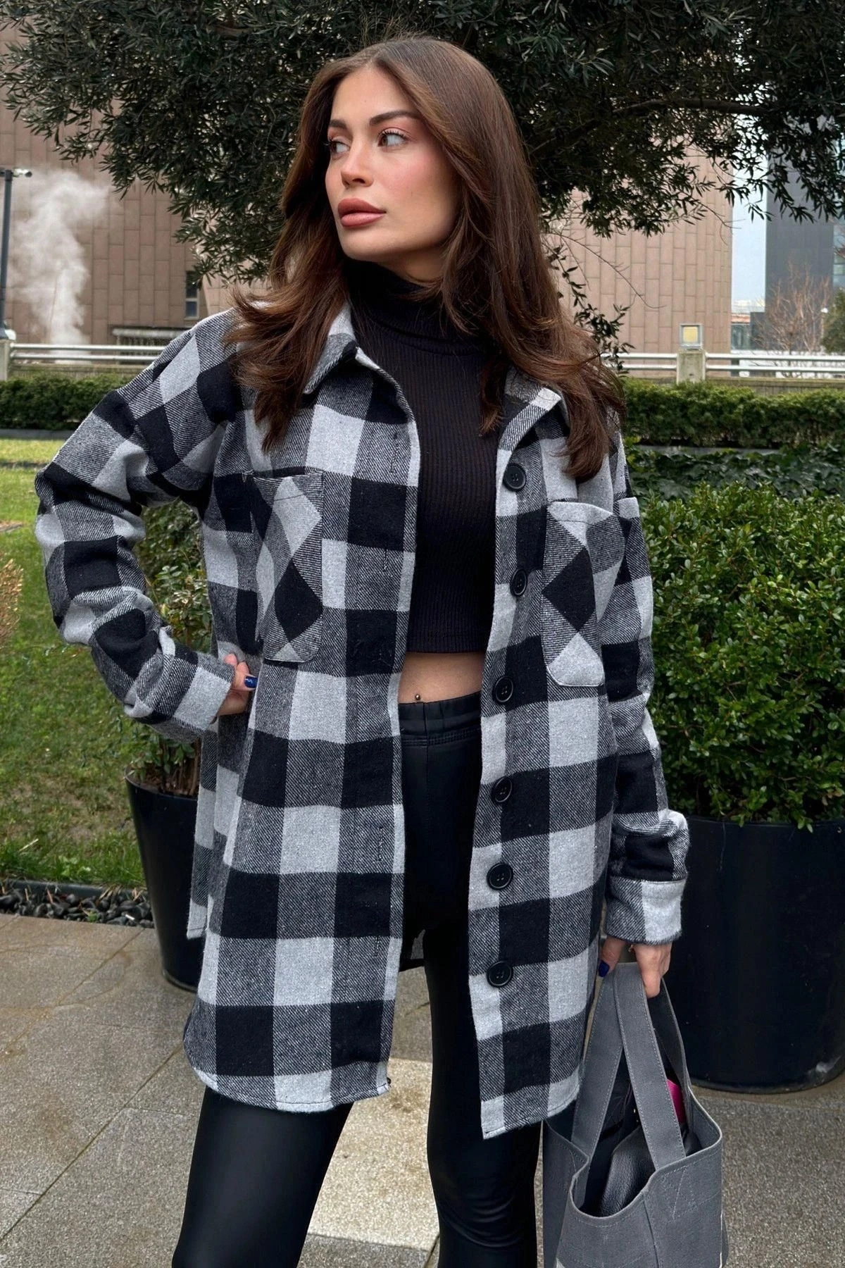 Kadın Siyah & Gri Çift Cepli, Ekose Desenli, Rahat Kalıp, Uzun Kaşe Gömlek