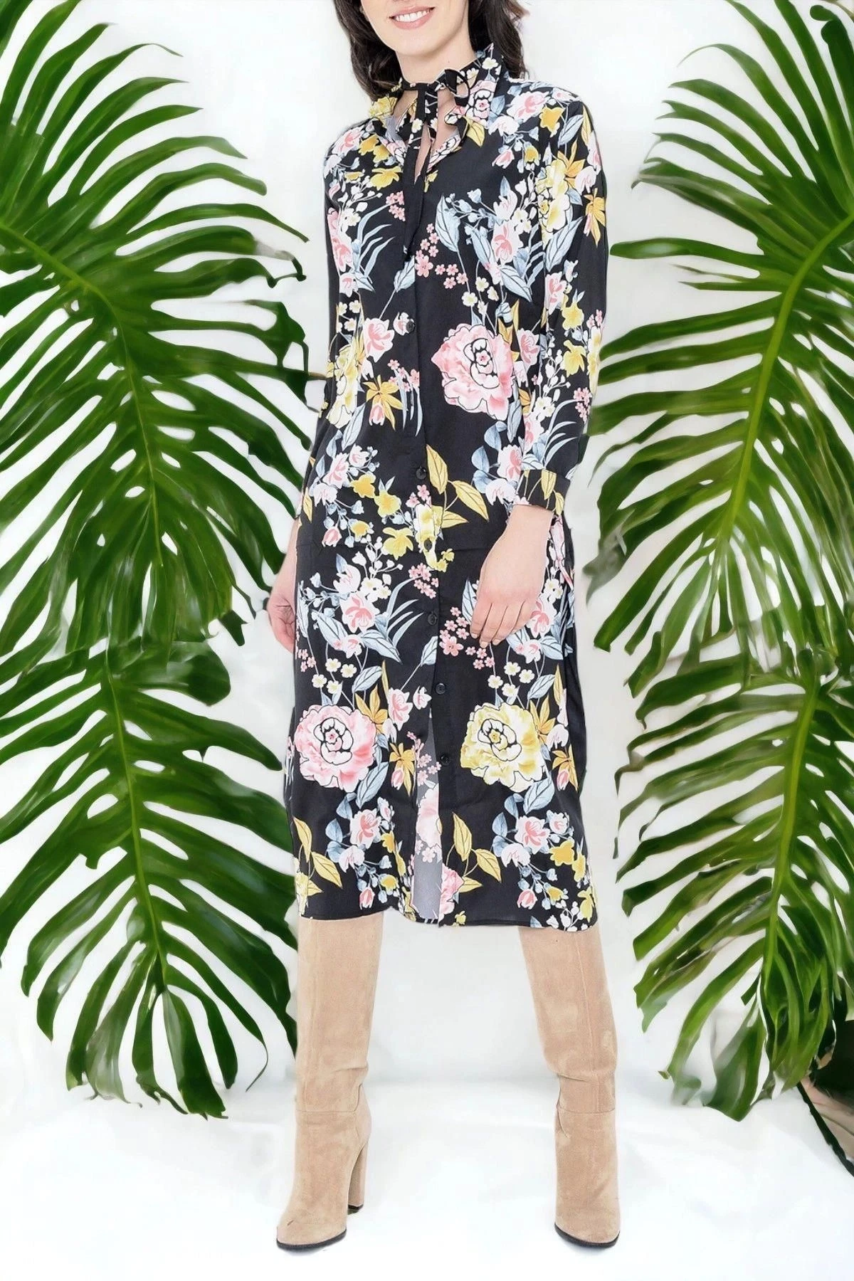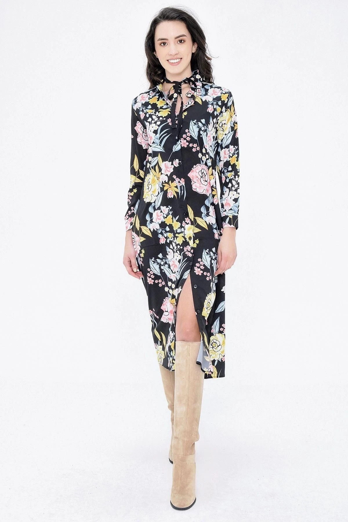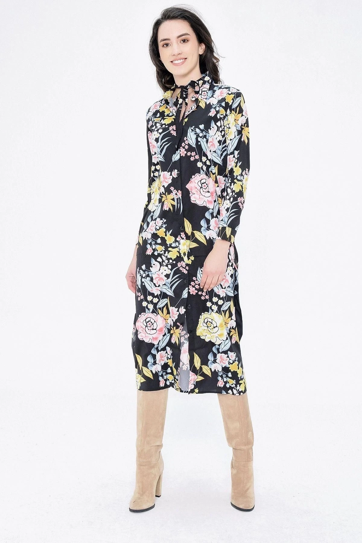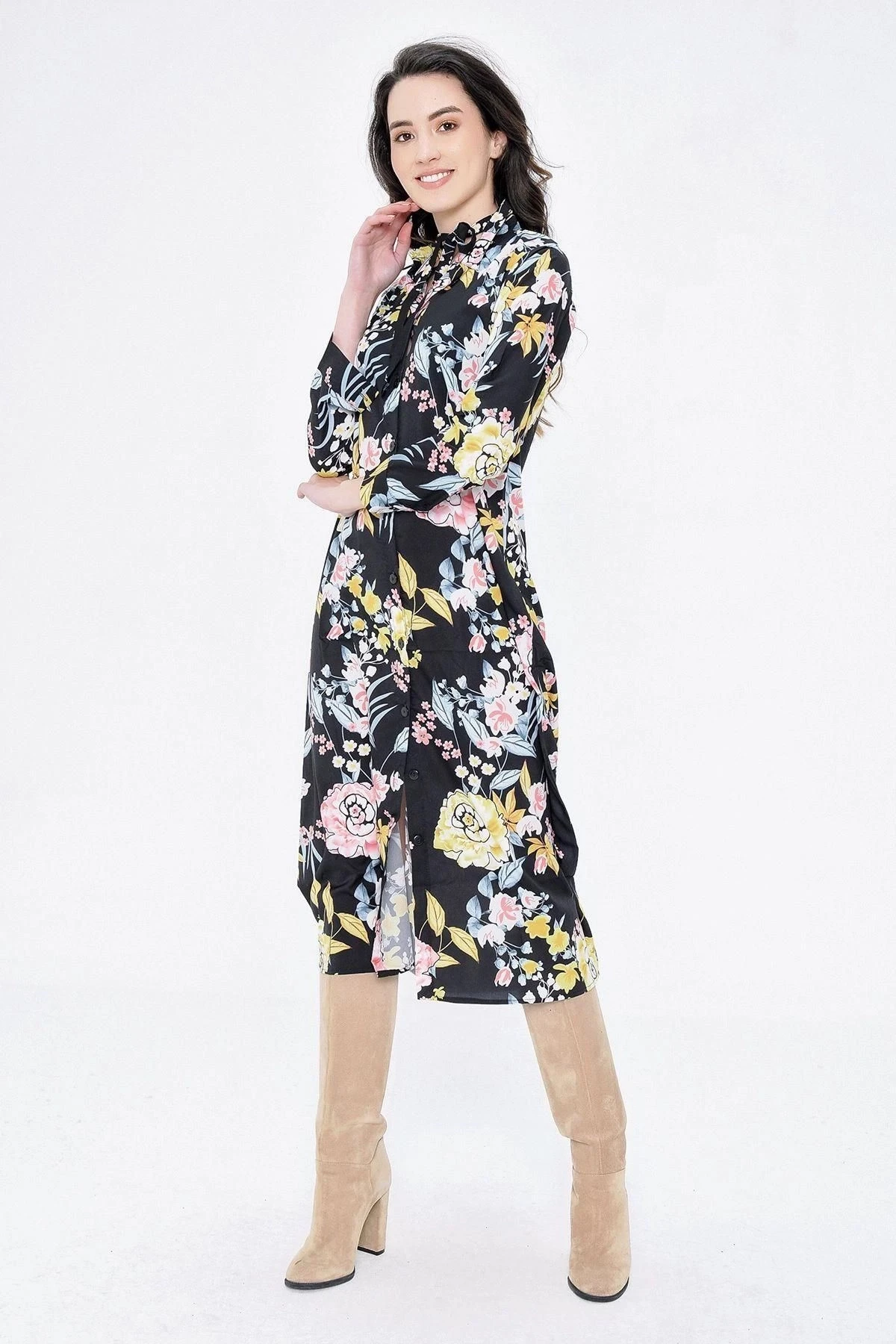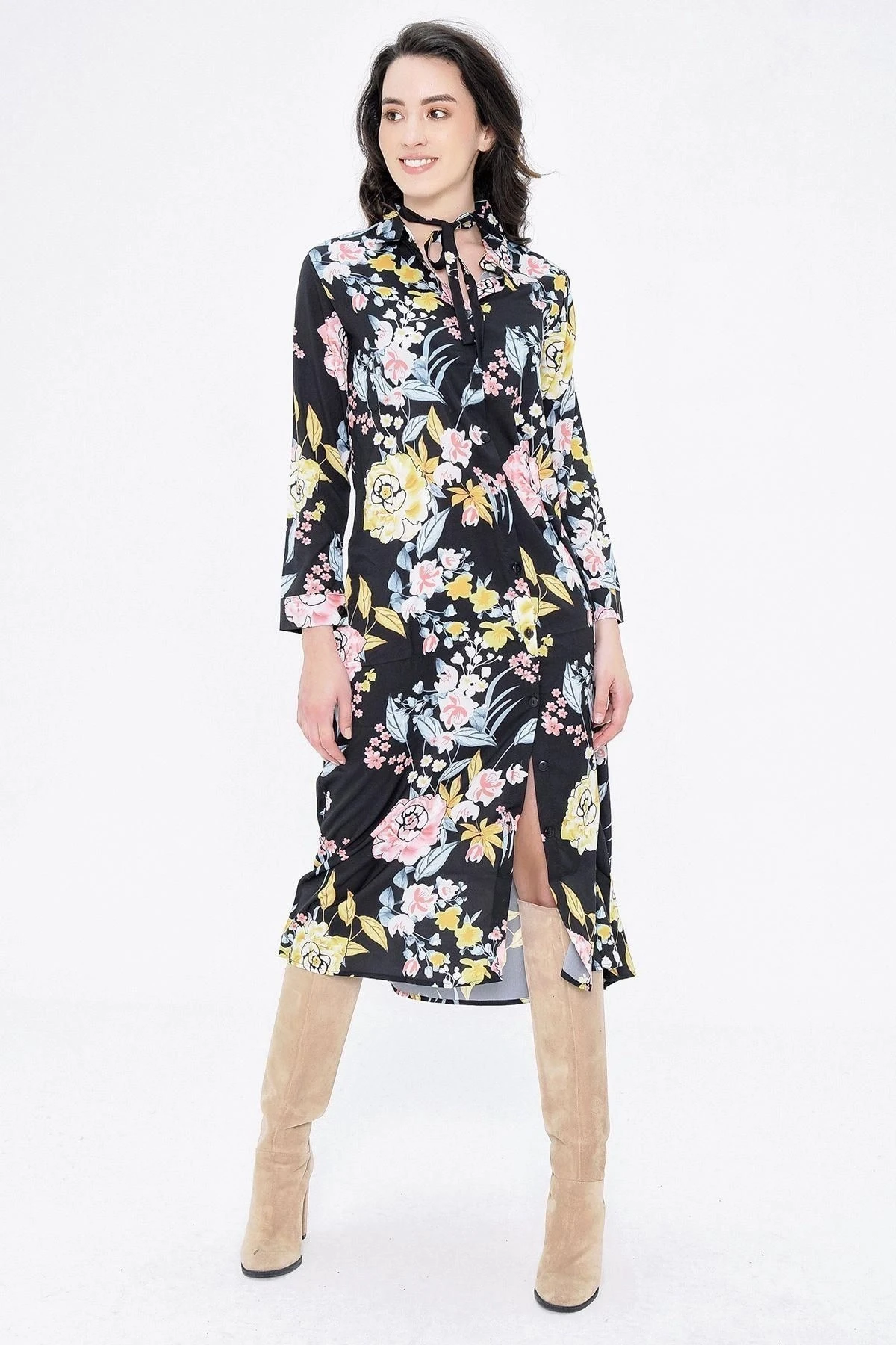 Bu zarif elbise, özellikle ofis ve günlük kullanım için tasarlanmıştır.; Siyah renkteki hakim yaka, uzun kollu tasarımıyla klasik bir görünüm sunar.; Çiçek desenleri ise elbiseye zarif ve çekici bir hava katmaktadır.; Elbisenin kumaş içeriği %95 viskon ve %5 elastan olarak belirlenmiştir.; Bu kombinasyon, elbisenin yumuşak, rahat ve esnek olmasını sağlar.; Viskon, elbisenin üzerindeki desenlerin detaylarını mükemmel bir şekilde yansıtırken, elastan esnekliği sayesinde hareket özgürlüğü sunar.; Regular kesimli midi boyu, elbisenin diz üstüne kadar uzanmasını sağlar.; Bu uzunluk, hem şık bir tarz sunar hem de profesyonel bir görünümü korur.; Elbise, hem ofis ortamında hem de günlük yaşamda rahatlıkla giyilebilecek çok yönlü bir modeldir.; Bu elbise, kendine güvenen ve stil sahibi kadınlar için mükemmel bir seçenektir.; Kusursuz kumaş kalitesi, çarpıcı siyah renk, etkileyici çiçek desenleri ve hoş tasarımıyla dikkatleri üzerinize çekmenizi sağlar.; Ofis stilinizi tamamlamak veya özel bir etkinlikte şıklığınızı göstermek için ideal bir seçimdir.; Bu elbise, hem şıklığı hem de konforu bir arada sunan bir parçadır.; Modaya uyum sağlayan tasarımıyla günlük hayatınızı daha da renklendirecek ve size özgüven katacaktır.