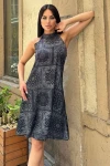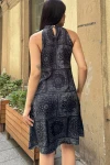 Kadın Siyah Halter Yaka, A Kesim, Etnik Desenli, Gizli Cepli, Salaş Saten Elbise