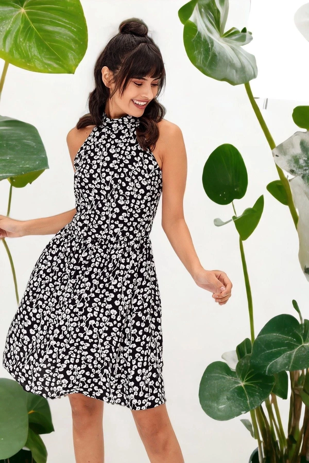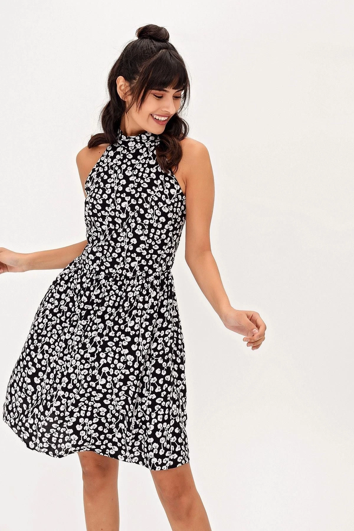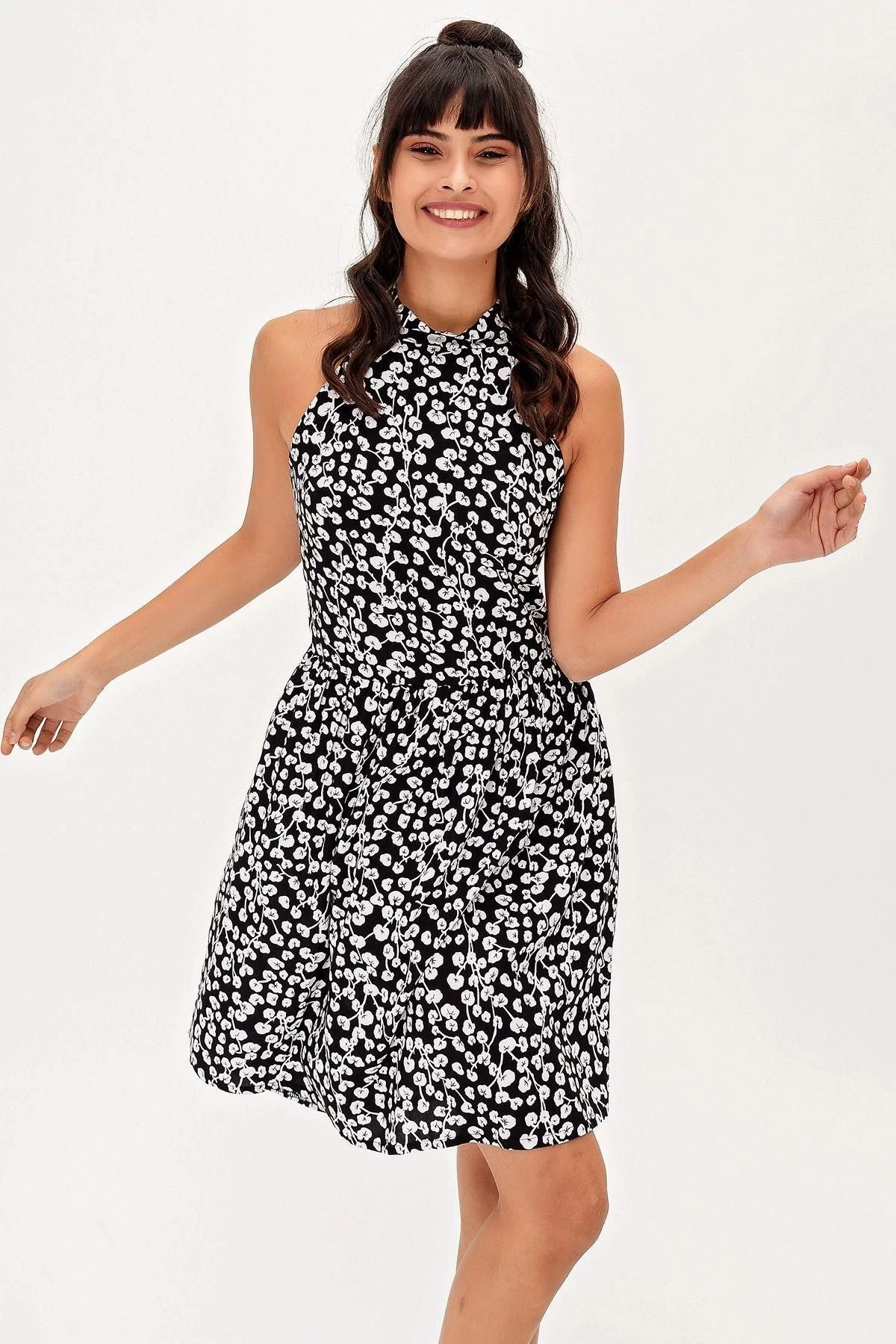Kadın Siyah Halter Yaka Desenli Kiloş Elbise Sıfır Kol Kloş li Midi Boy Diz üstü Elbise