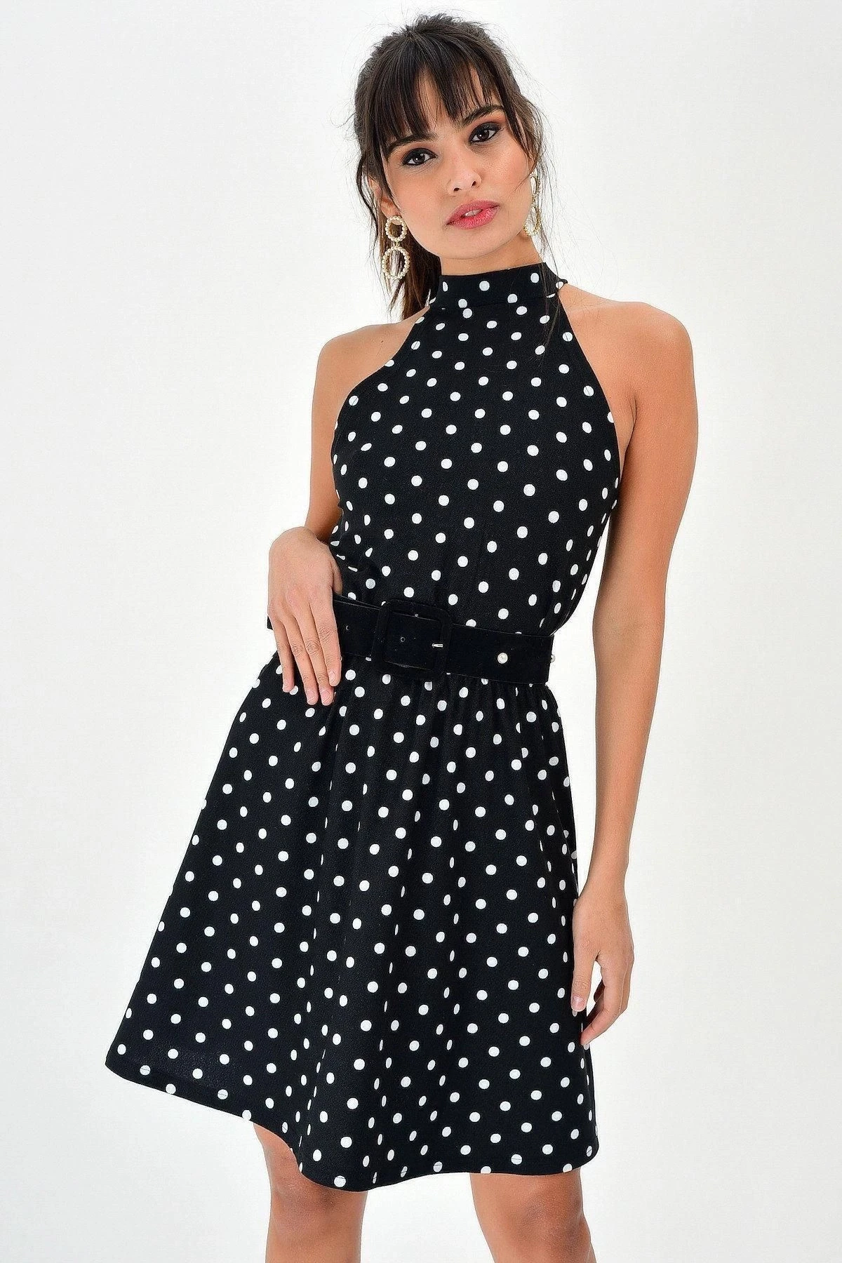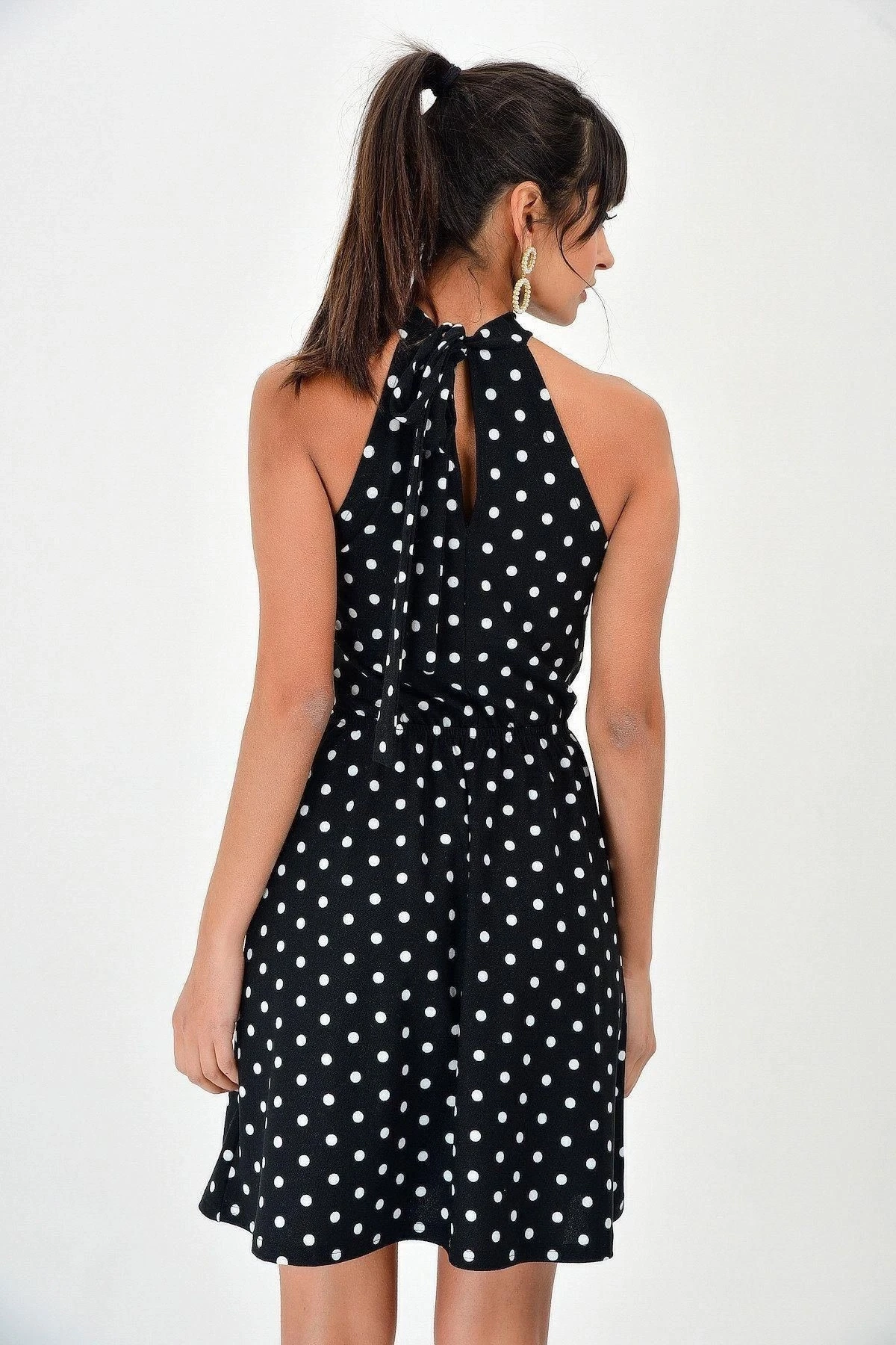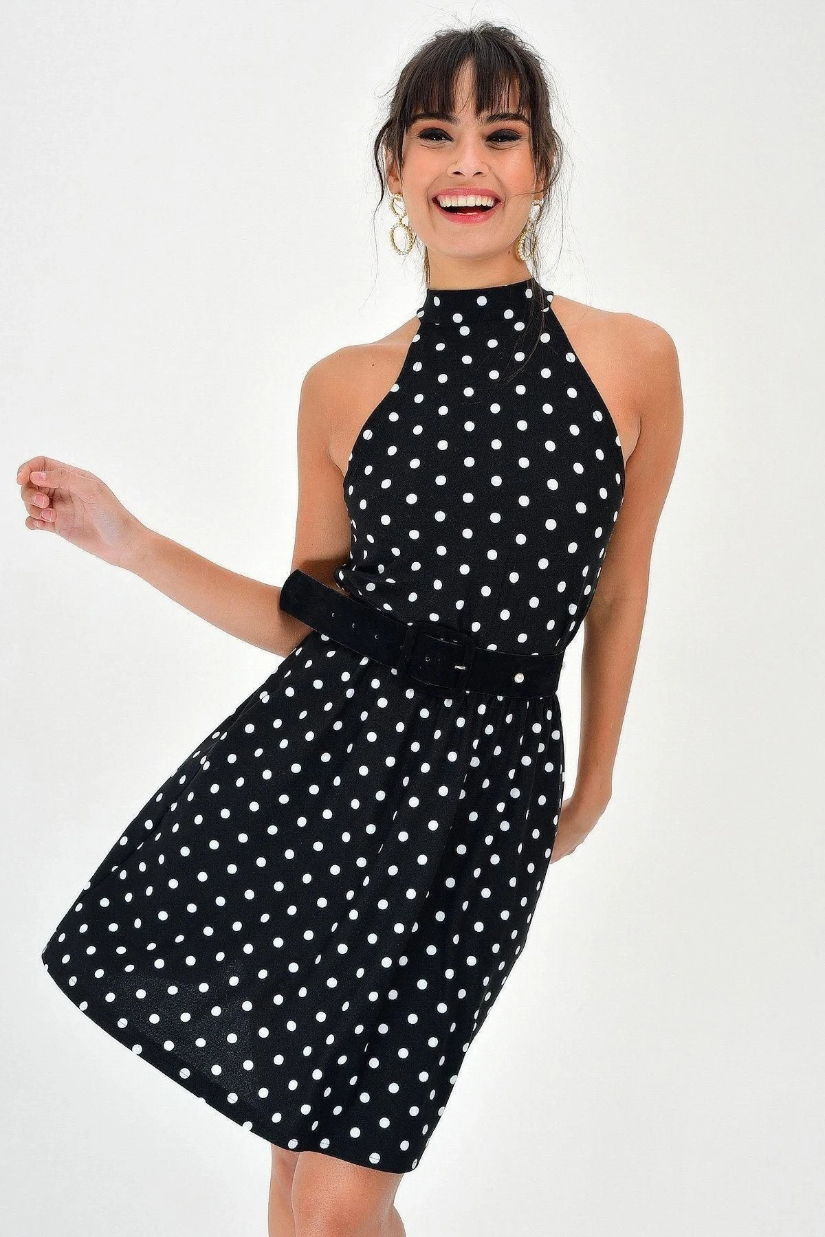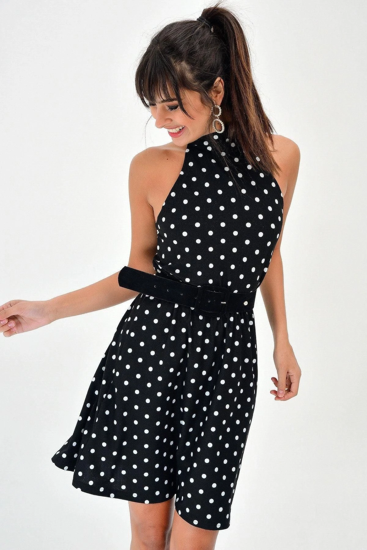 Bu şık siyah renkteki halter yaka elbise, zarif ve modern bir görünüm için mükemmel bir seçenektir.; Sıfır kollu tasarımıyla yaz aylarında serin ve rahat bir his sunarken, puantiye deseniyle eşsiz bir çekicilik katmaktadır.; Bu elbise, düşük boyu sayesinde orta uzunlukta bir kesime sahiptir, diz üstünde sonlanır ve hem ofis hem de günlük kullanım için uygundur.; Kumaş içeriği %95 polyester ve %5 elastan olarak tasarlanmıştır.; Bu sayede elbise, yumuşaklık, dayanıklılık ve esneklik sağlayarak hareket özgürlüğünüzü kısıtlamaz.; Siyah rengi, şıklığı ve zamanlessness (zamansızlık) ile birleştirirken, halter yaka detayı zarif bir görünüm sunar.; Puantiye deseni, klasik bir desen olup elbisenin cazibesini artırır ve enerjik bir hava katar.; Bu desen, hem iş ortamında hem de sosyal etkinliklerde dikkat çekmek için ideal bir seçimdir.; Bu elbise, regular kesimiyle vücudu saran ama rahat bir uyum sağlar.; Vücut hatlarınıza uyumlu şekilde form alırken, zarif bir siluet oluşturur.; Bu elbise, hem profesyonel hem de gündelik durumlar için mükemmel bir seçenektir.; Ofiste şık ve profesyonel bir görünüm elde etmek isteyenler için idealdir, aynı zamanda günlük giyimde de stil sahibi olmak isteyenlerin tercih edeceği bir parçadır.; Şık siyah rengi, halter yaka detayı, puantiye deseni ve zarif kesimiyle bu elbise, gardırobunuza sofistike ve çekici bir seçenek katacaktır.