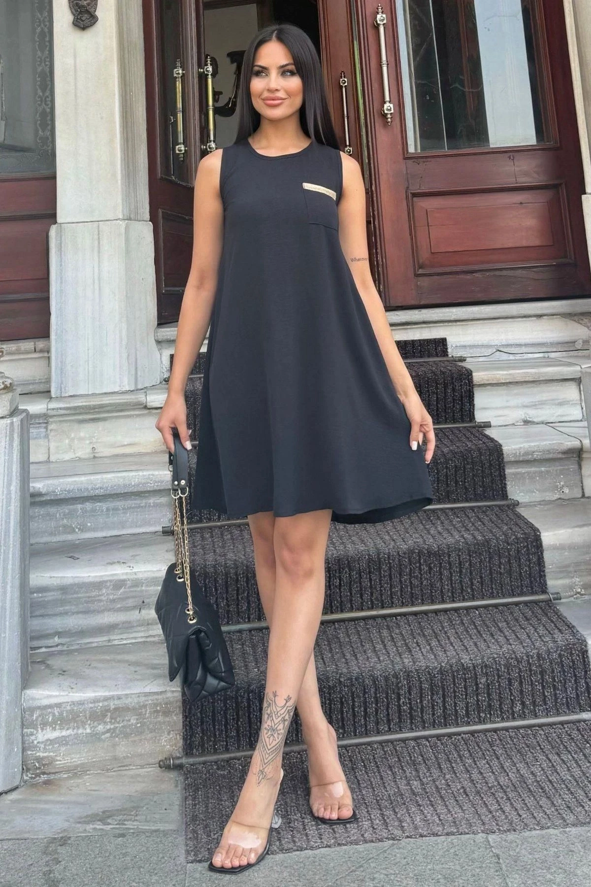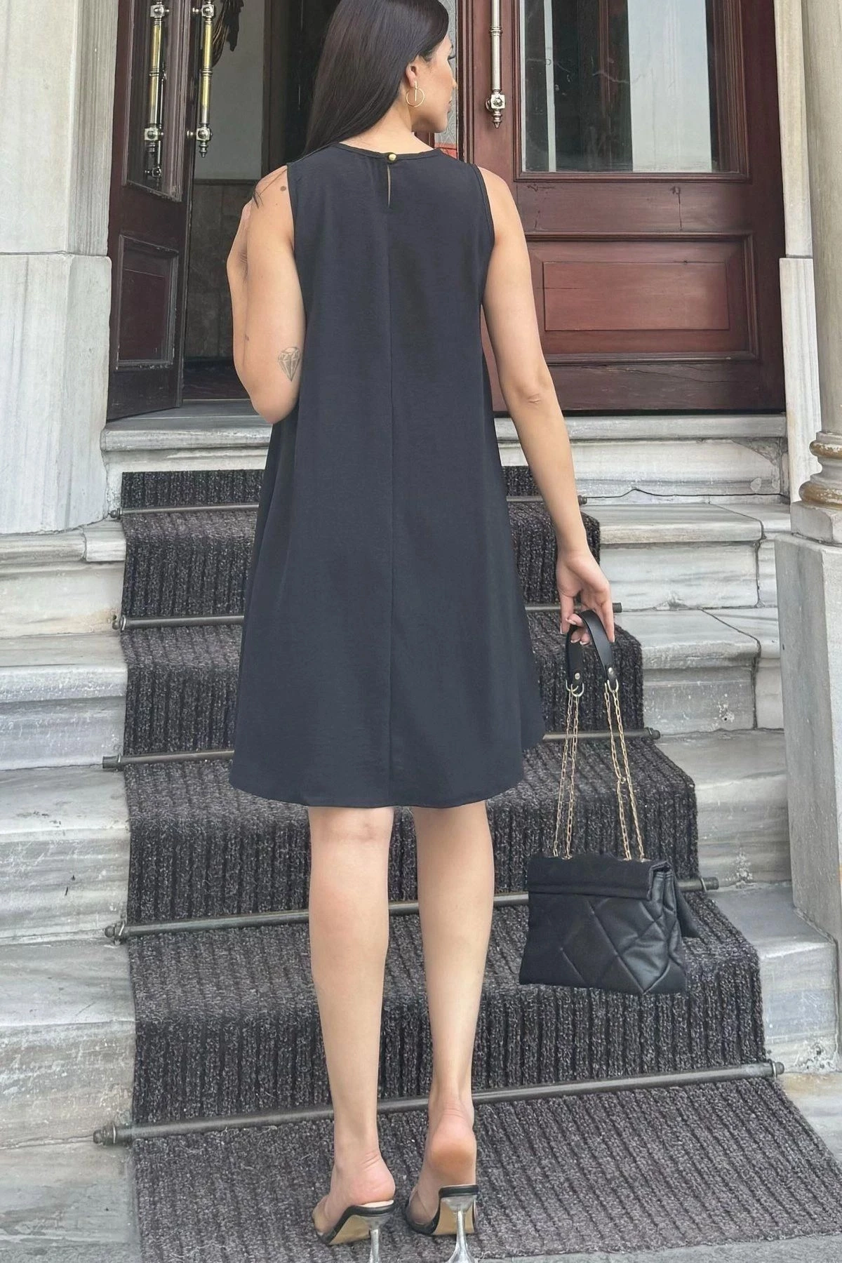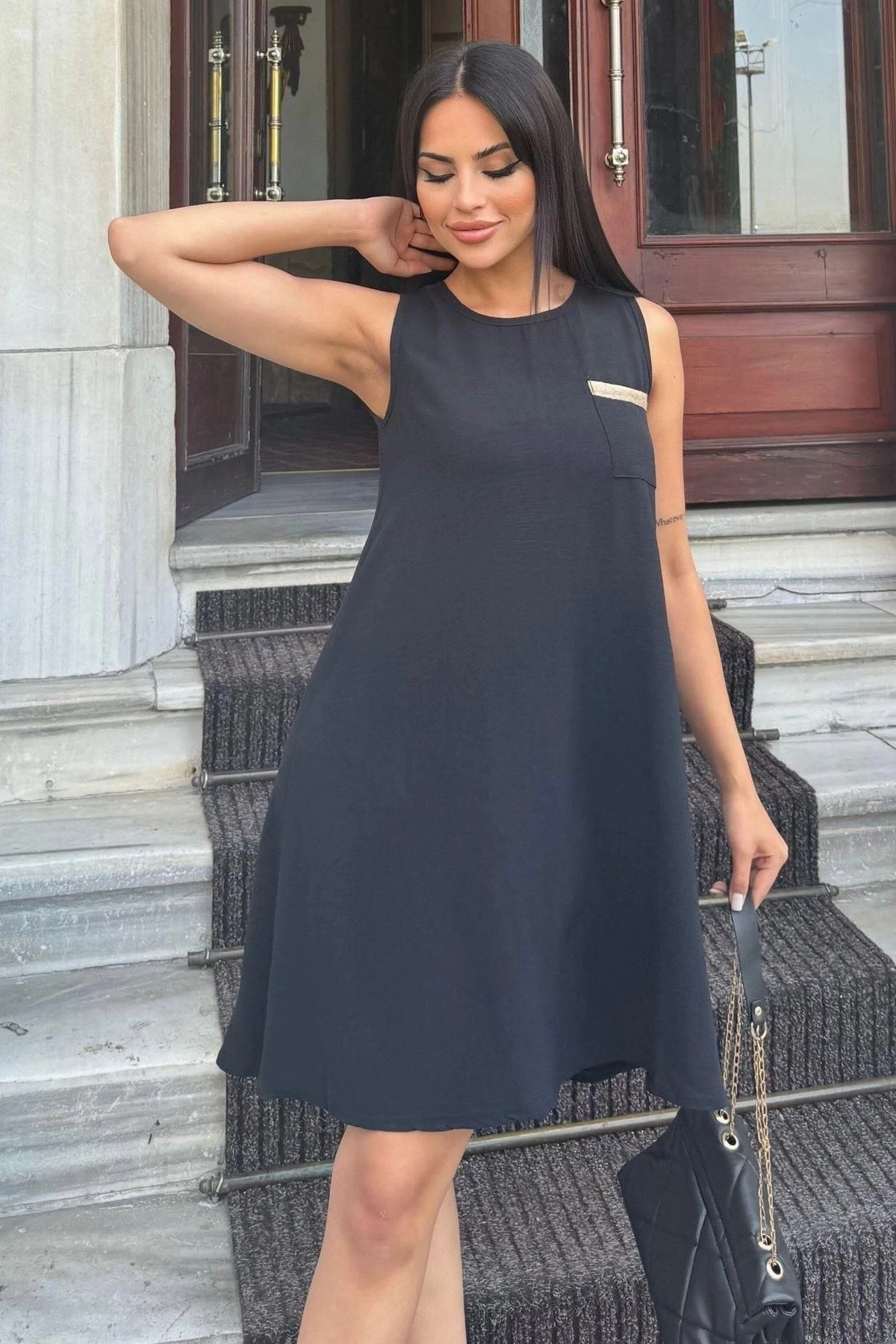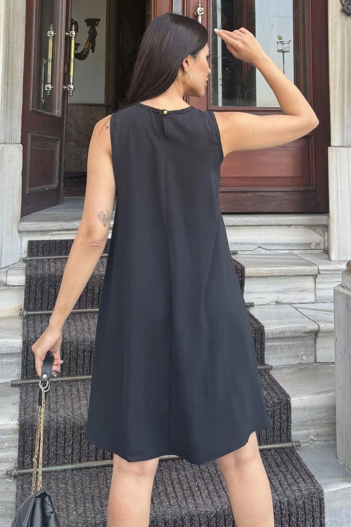 Kadın Siyah Hasır Cep Detaylı, Arka Düğme Kapama, Midi, Kloş Airobin Elbise