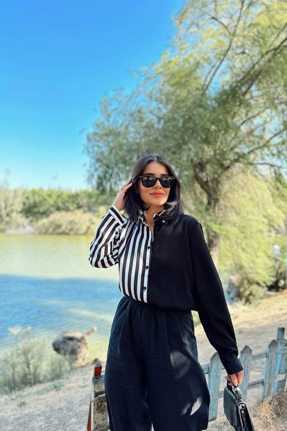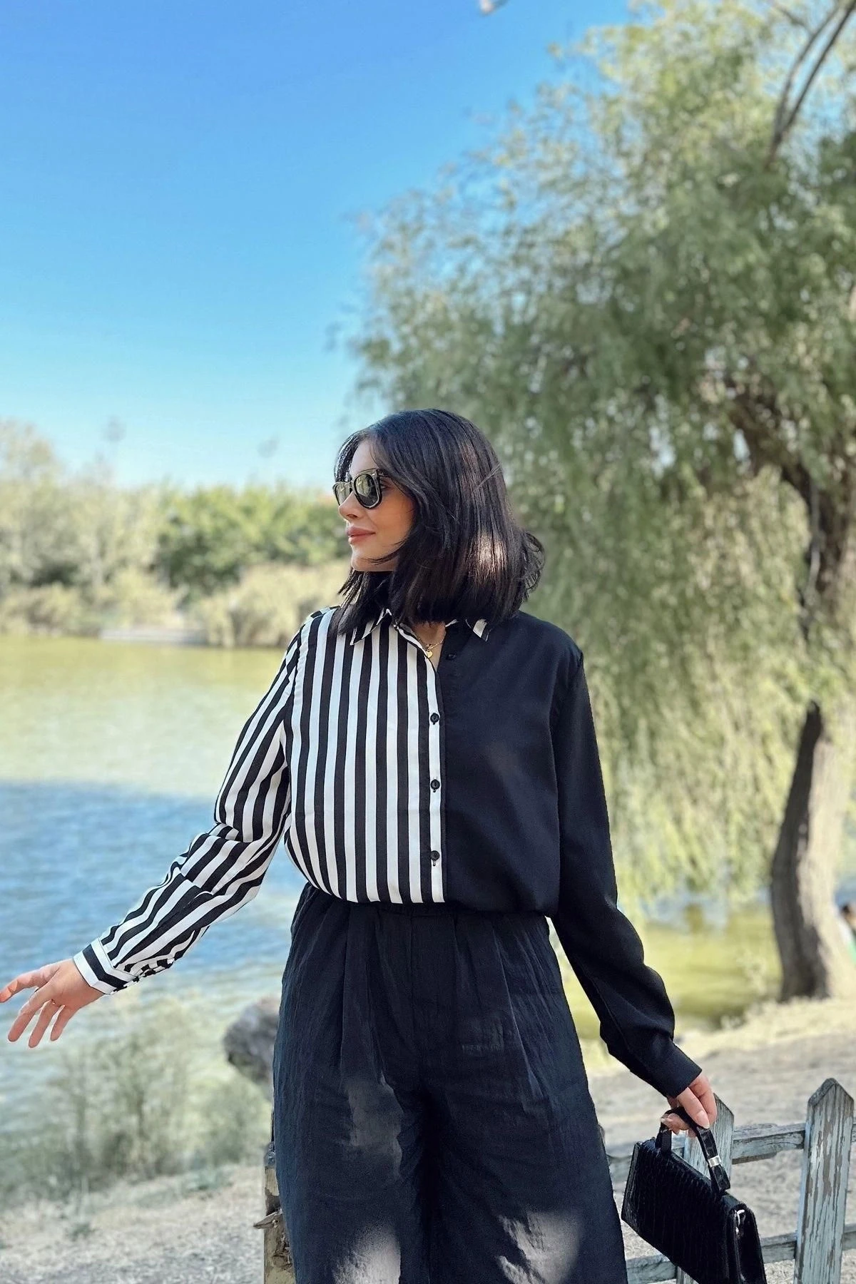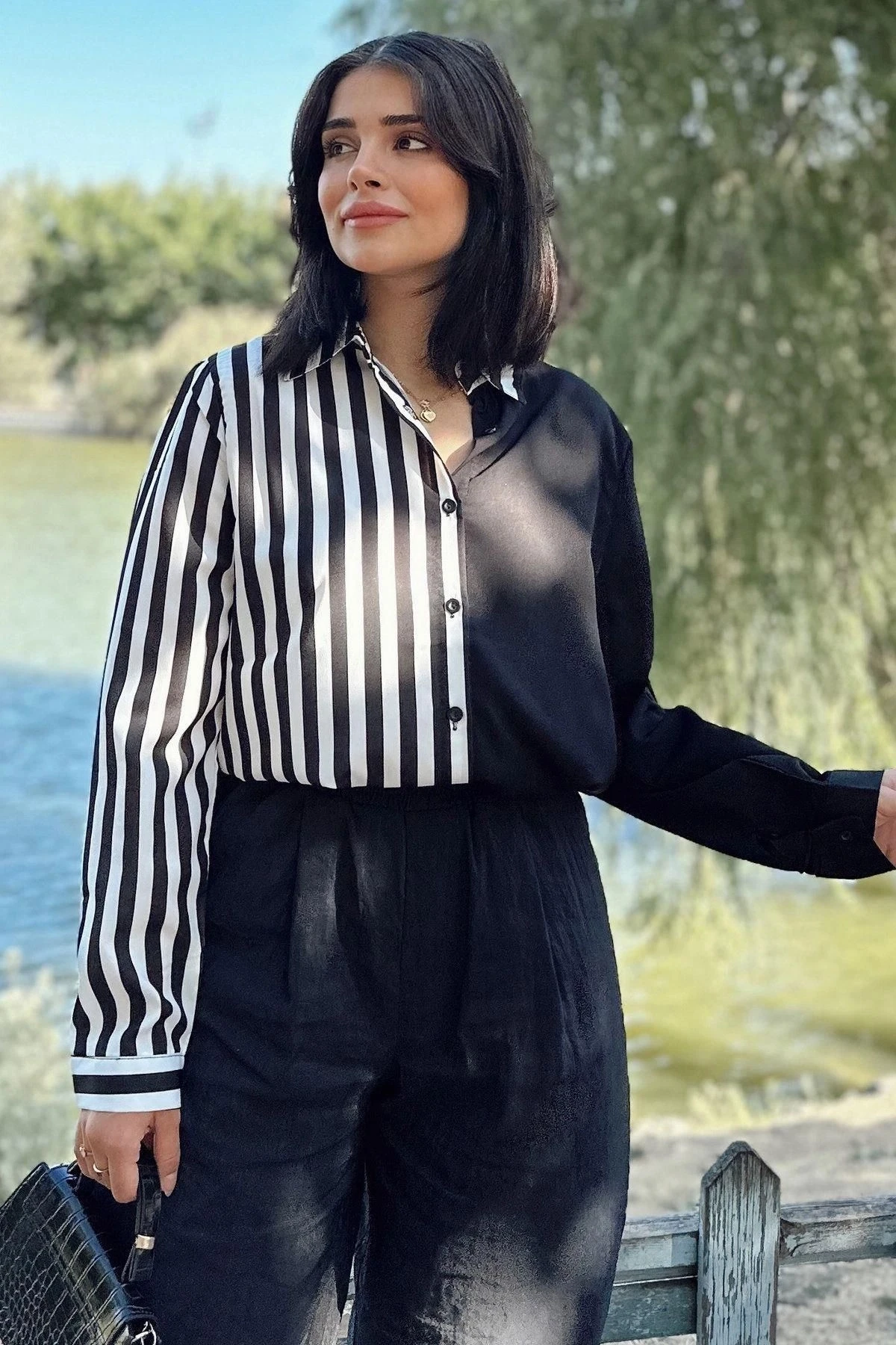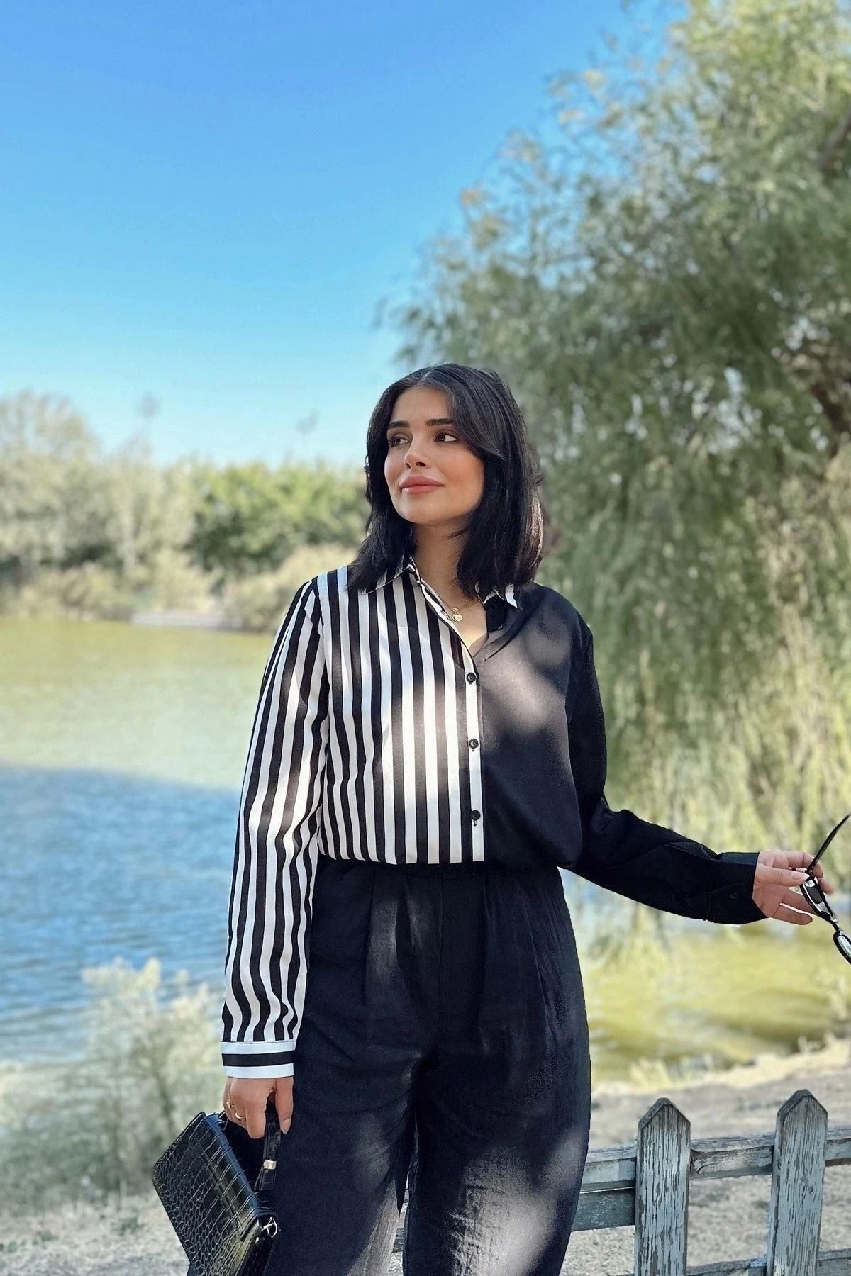 Kadın Siyah İki Renkli Çizgili, Uzun Kol,Regular Kesim Gömlek