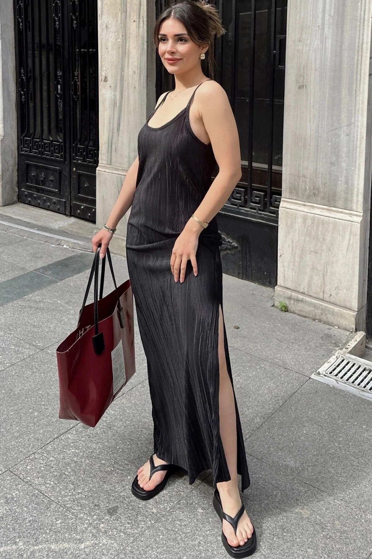 Kadın Siyah İnce Askılı, V Yaka, Yırtmaç Detaylı, Uzun Pliseli Elbise