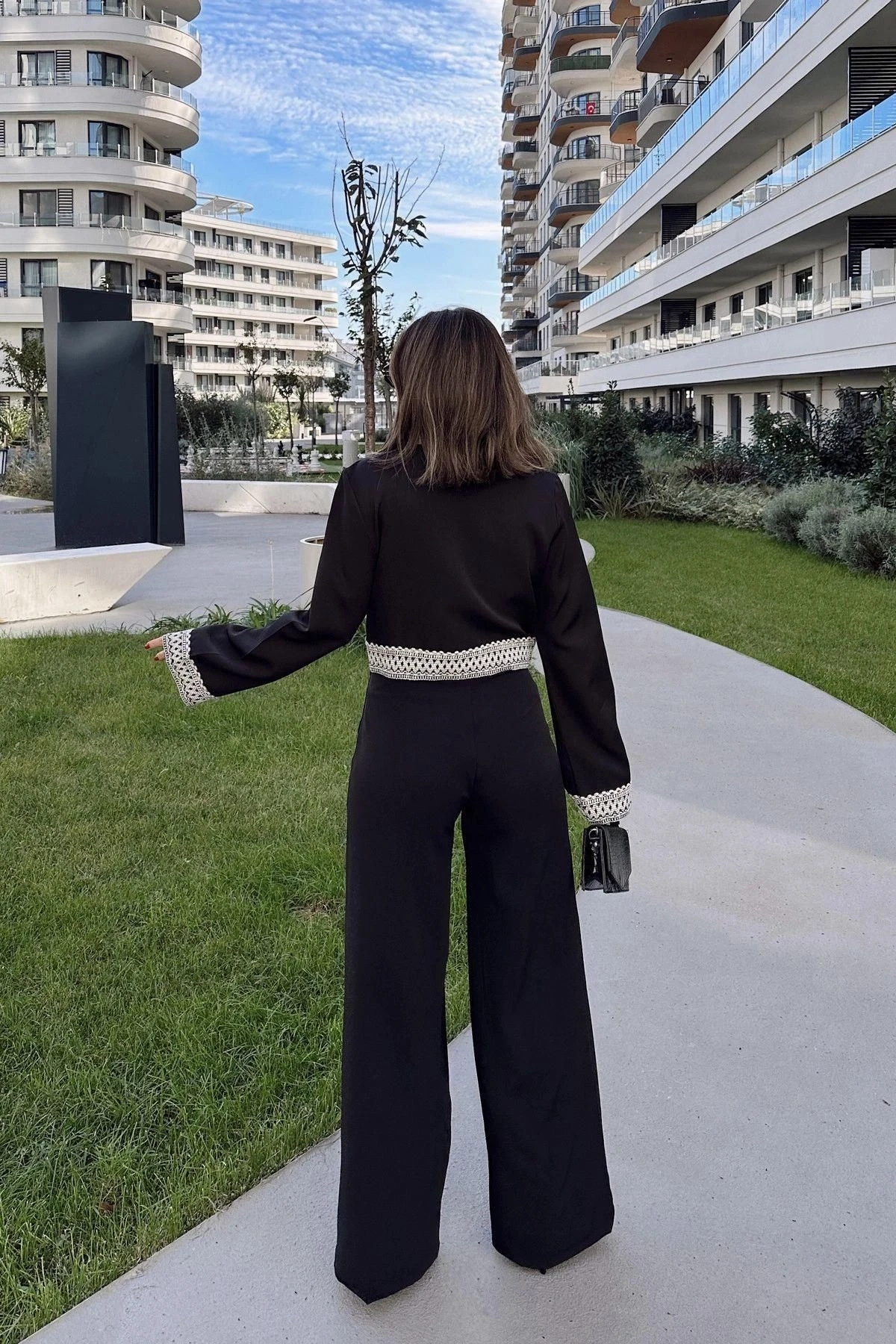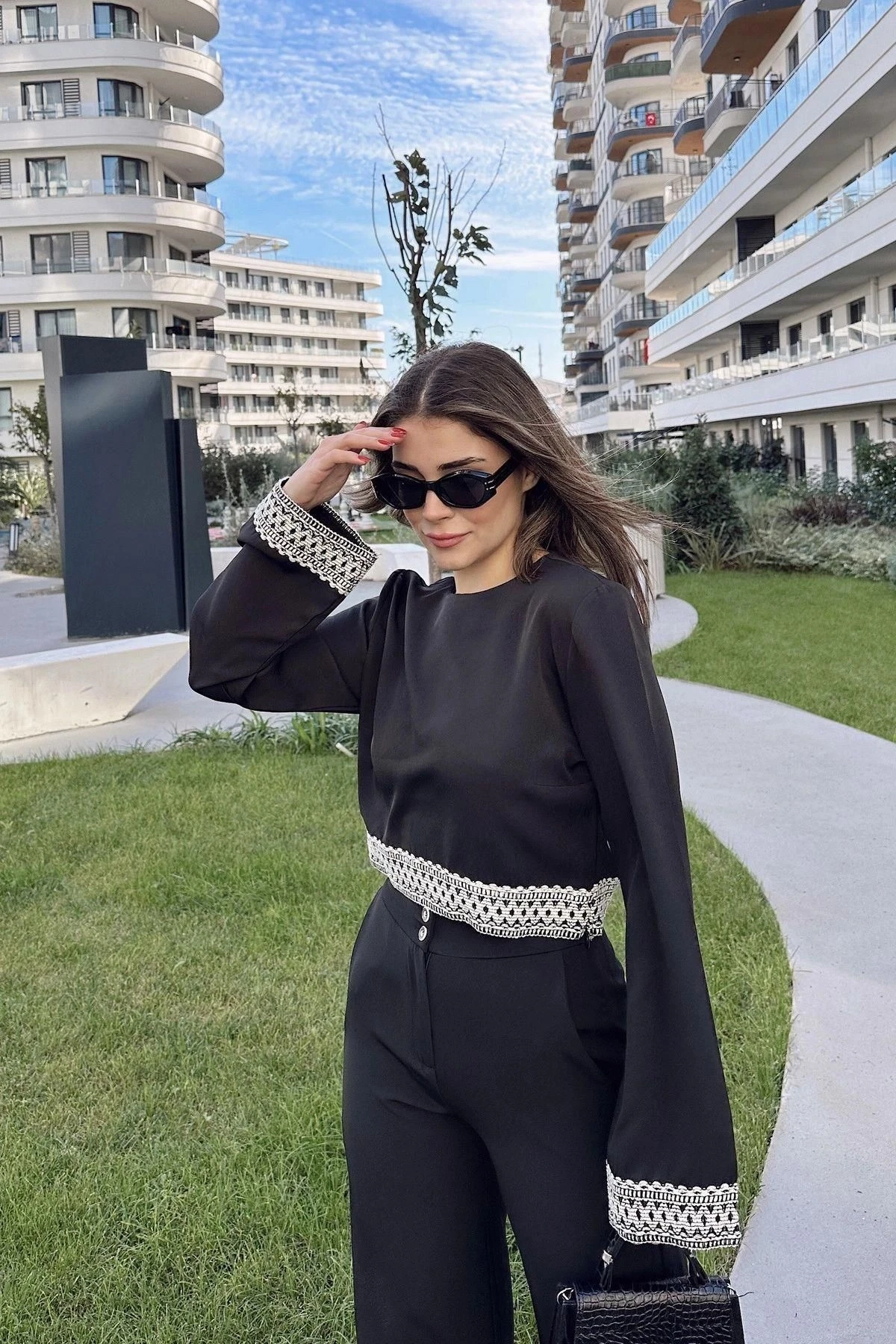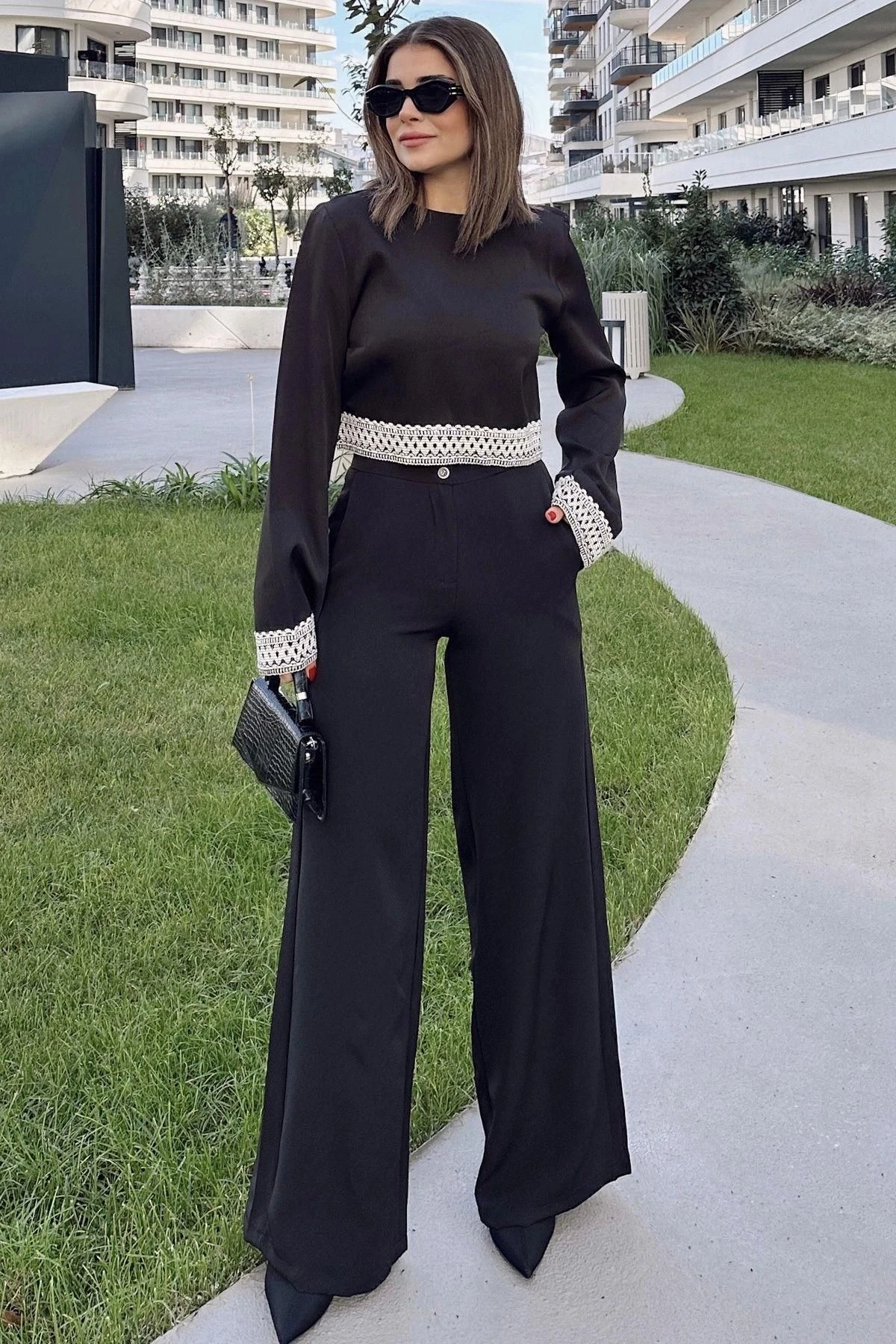 Kadın Siyah İşleme Detaylı Bluz & Bol Paça Pantolon - Alt & Üst Takım