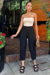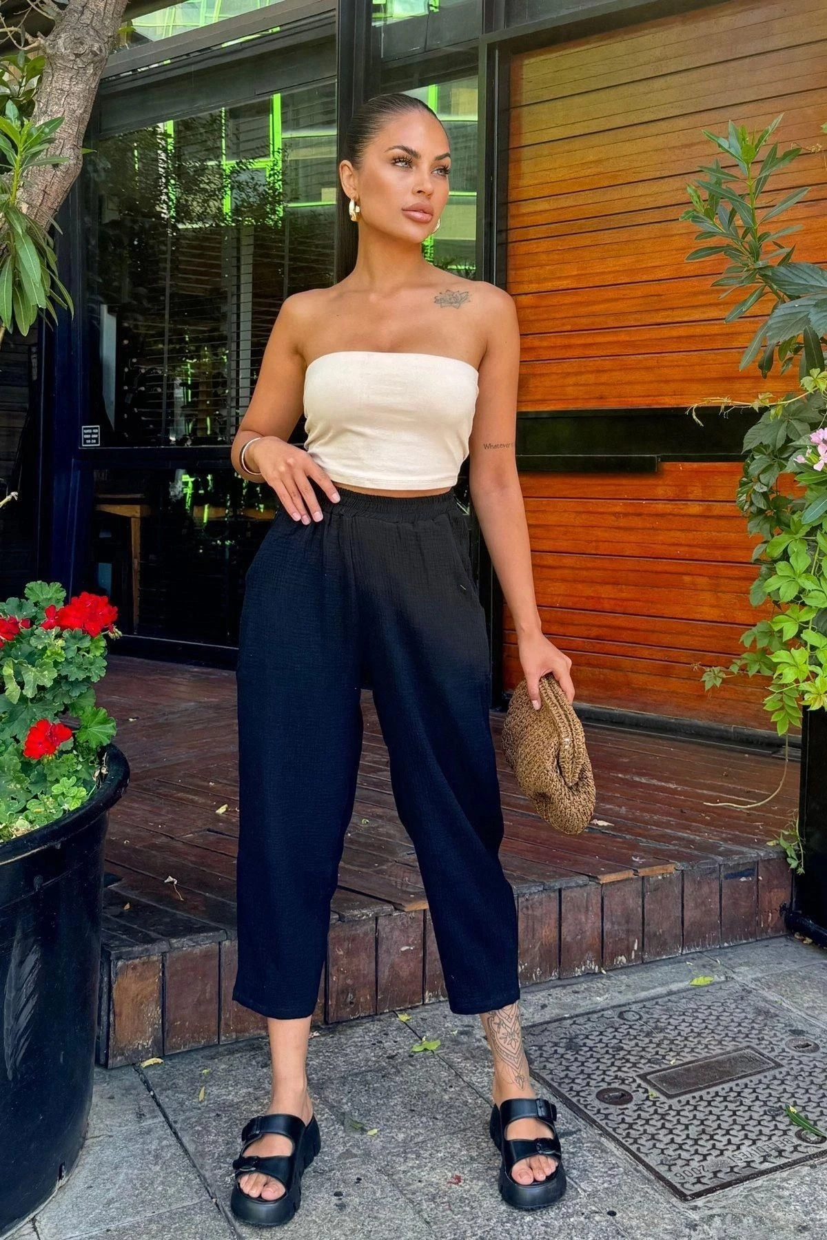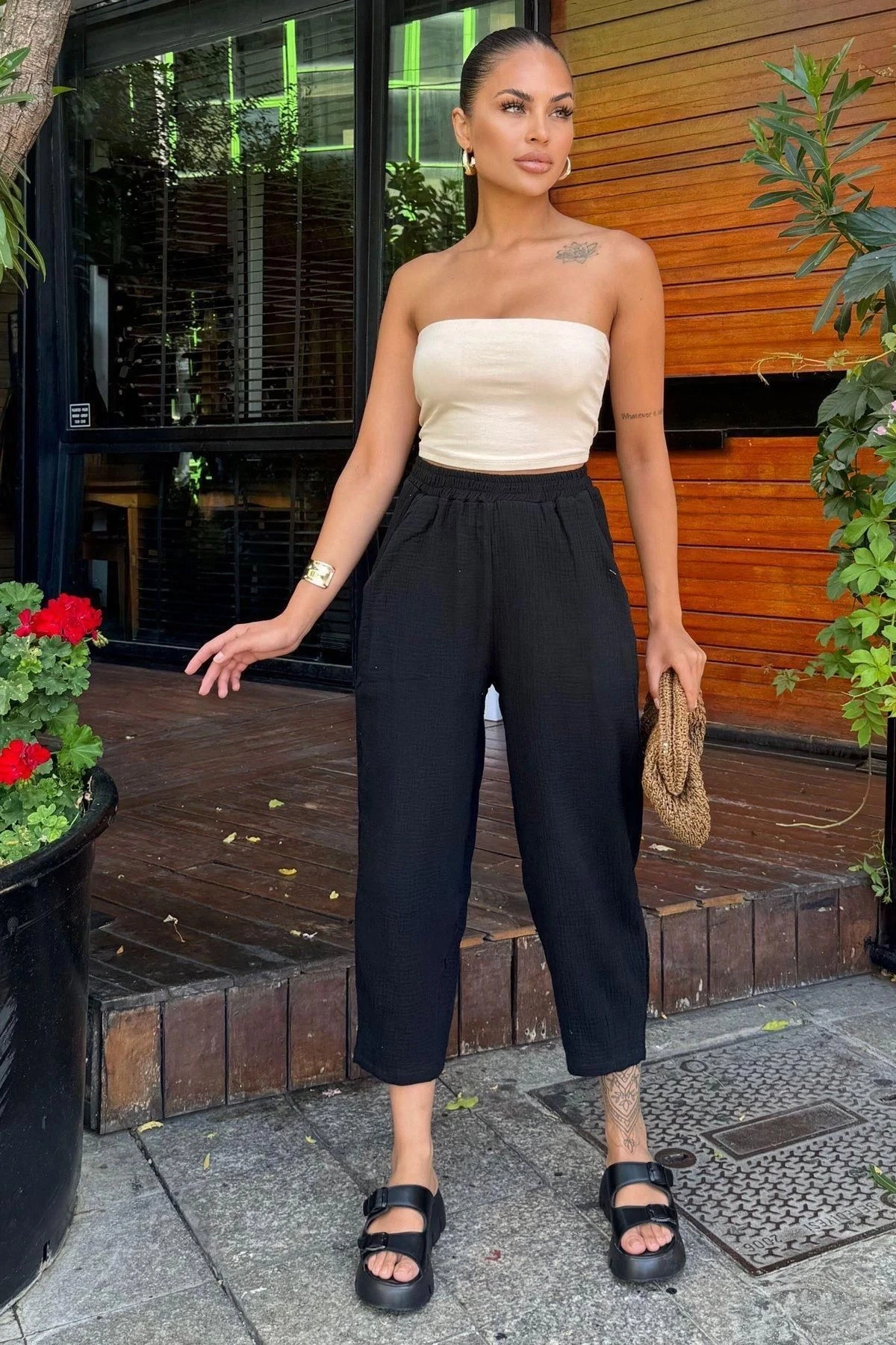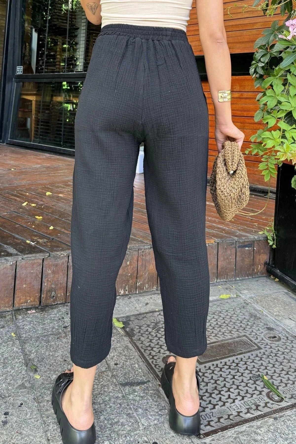 Kadın Siyah İthal Müslin Kumaş, Beli Lastikli,Cepli Rahat Kalıp Pantolon - Tesettüre Uygun