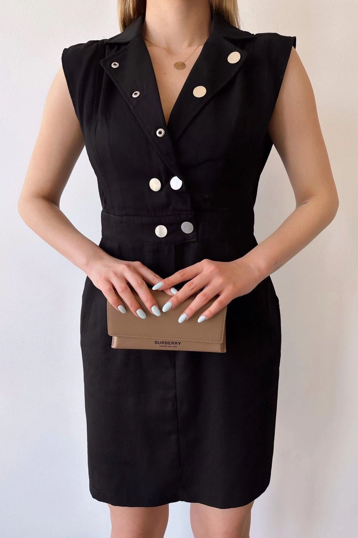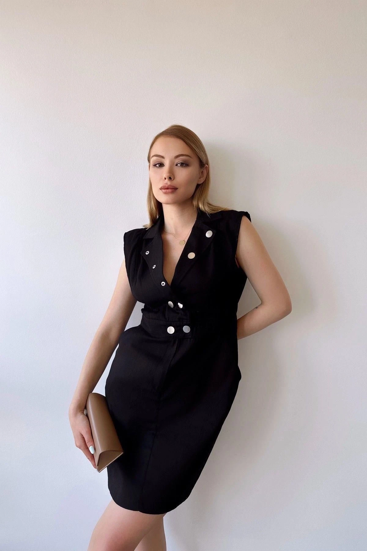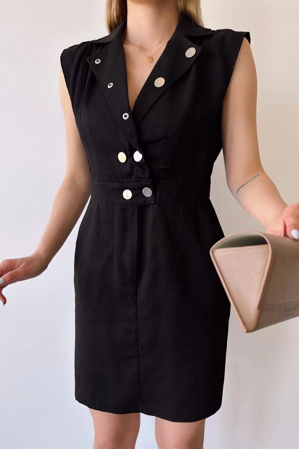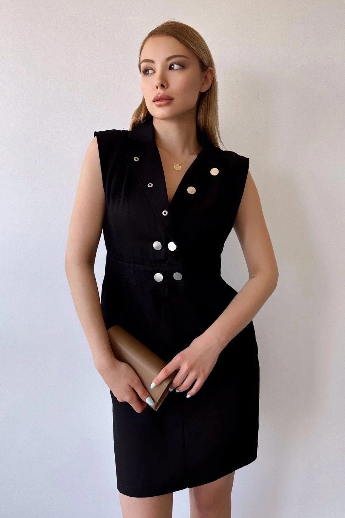Bu kadın siyah kalın askılı mini elbise, şıklığı ve zarafeti bir arada sunuyor.; Elbisenin kumaşı %100 pamuktan oluşur.; Bu pamuk kumaş, doğal ve nefes alabilir bir yapıya sahiptir, böylece elbiseyi rahatlıkla giyebilirsiniz.; Ceket yaka tasarımı, elbiseye sofistike bir görünüm kazandırır ve boyun bölgesini şık bir şekilde vurgular.; Düz renk deseni, minimalist ve şık bir tarz sunar.; Siyah renk ise zamansız ve her duruma uyum sağlayan bir seçenektir.; Standart kalıp/kesimi, elbisenin vücuda hoş bir şekilde oturmasını sağlar.; Bu kesim, zarif bir siluet oluşturur ve hareket özgürlüğü sunar.; Gabardin düğme detayları, elbiseye ek bir şıklık ve ayrıntı katarken aynı zamanda kullanışlı bir özellik sunar.; Bu siyah kalın askılı ceket yaka düz renk desenli mini elbise, şıklık ve rahatlık arayan kadınlar için mükemmel bir seçimdir.; %100 pamuk kumaşıyla, elbise doğal ve nefes alabilir bir yapıya sahiptir.; Ceket yaka tasarımı, sofistike bir hava katar ve boyun bölgesini vurgular.; Düz renk deseni ve siyah rengiyle minimalist ve şık bir görünüm sağlar.; Standart kalıp/kesimi, vücuda hoş bir şekilde oturur ve zarif bir siluet oluşturur.; Gabardin düğme detayları, şıklığı ve kullanışlılığı bir araya getirir.; Bu mini elbise, özel etkinliklerden gece gezmelerine kadar birçok farklı durumda tarzınızı tamamlamak için idealdir.; Gardırobunuzun vazgeçilmez bir parçası olacak.
