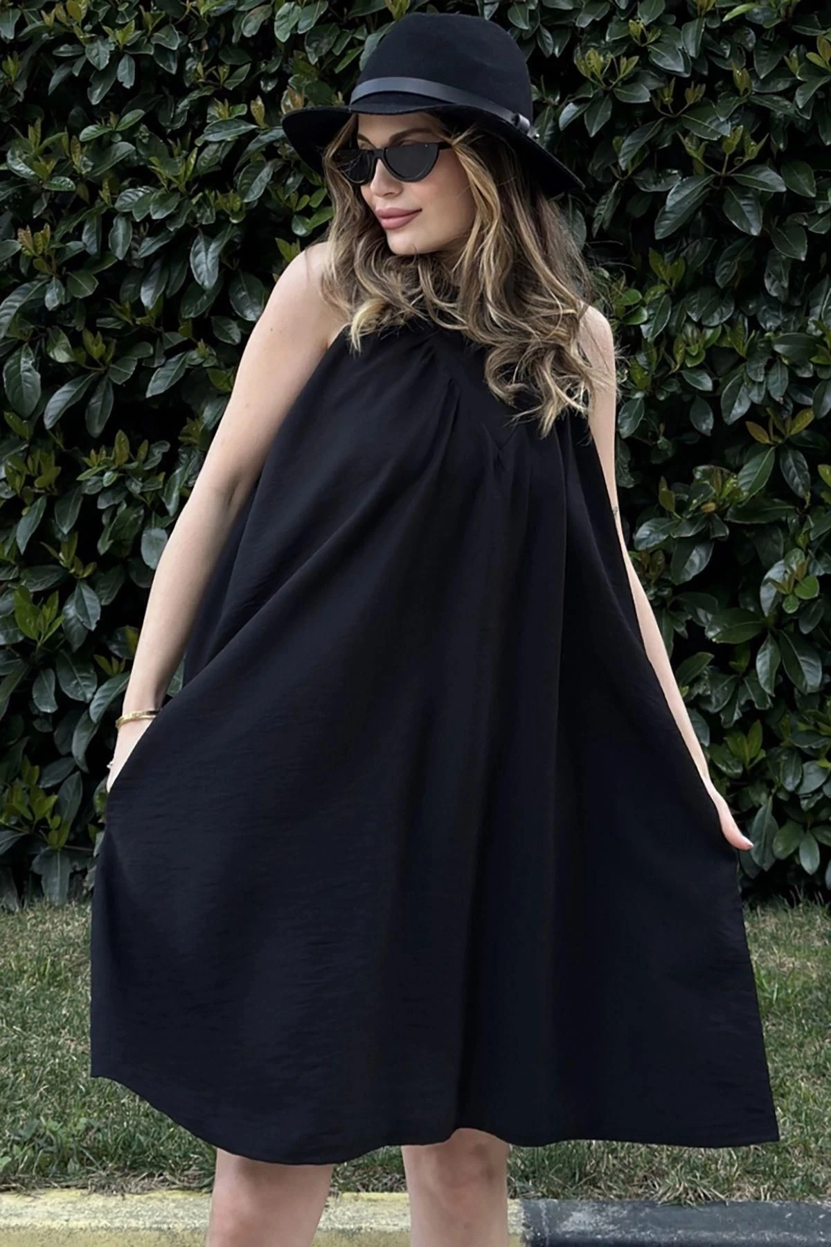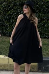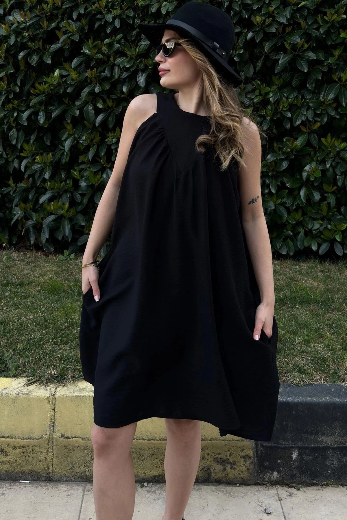 Kadın Siyah Kalın Askılı, Cep Ve Plise Yaka Detaylı, A Kesim, Salaş Midi Elbise
