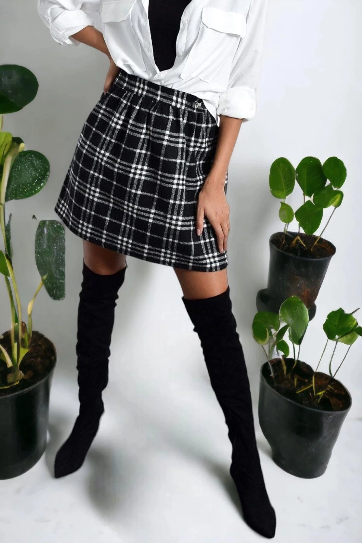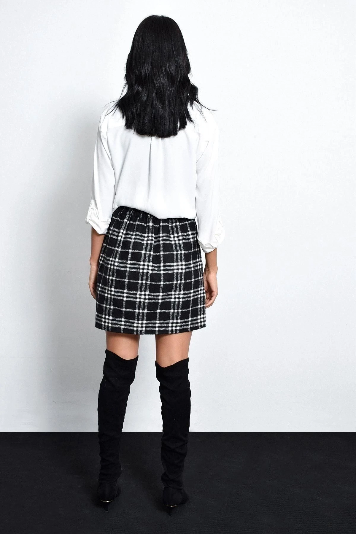 Kadın Siyah Kaliteli Üretim Kareli Kaliteli Kumaş Düz Kesim Mini Kısa Etek