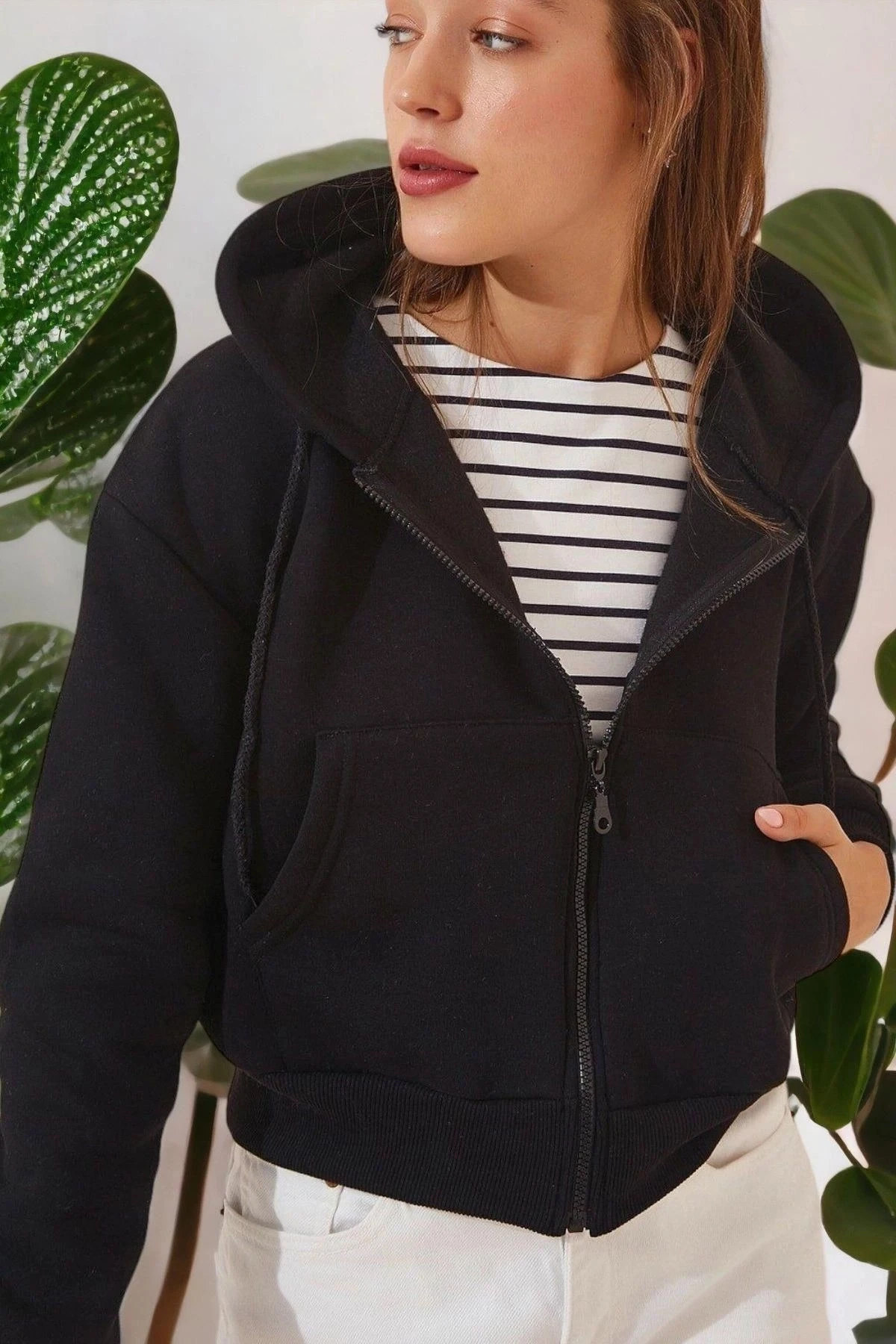 Bu şık ve rahat sweatshirt, gardırobunuzun temel parçalarından biri olacak.; Siyah renkte ve kapşonlu yakalı olarak tasarlanmış olan bu sweatshirt, herhangi bir kombini tamamlamak için mükemmel bir seçenektir.; %95 viskon ve %5 elastan içeriği sayesinde, sweatshirt yumuşak, esnek ve konforlu bir his sunar.; Viskon kumaşın doğal bir parlaklık ve ipeksi bir dokunuş sağladığını unutmayın.; Ayrıca, elastan sayesinde sweatshirt, hareket özgürlüğü sunar ve vücut hatlarınızı güzel bir şekilde kavrar.; Uzun kollu ve basic, regular kesimi sayesinde, bu sweatshirt her mevsimde giymek için idealdir.; Soğuk havalarda sizi sıcak tutarken, bahar ve sonbaharda da hafif bir koruma sağlar.; Ayrıca, kapşonlu tasarımı sayesinde başınızı hafif rüzgarlardan koruyabilirsiniz.; Bu sweatshirt, basit ve şık bir tasarıma sahiptir, bu da onu herhangi bir stil veya kombinle kolayca uyumlu hale getirir.; Onu kot pantolonlar, etekler veya şortlarla rahat bir günlük görünüm için kombinleyebilirsiniz.; Ayrıca, spor ayakkabılarla tamamlanarak spor bir tarz elde edebilir veya topuklu ayakkabılarla kombinleyerek daha şık bir görünüm oluşturabilirsiniz.; Bu sweatshirt, yüksek kaliteli malzemelerden üretilmiştir ve dikkatli bir şekilde işlenmiştir, böylece uzun süre dayanıklı kalır.; Hem günlük kullanım hem de özel etkinlikler için uygun olan bu sweatshirt, gardırobunuzun vazgeçilmez bir parçası olacak.; Şıklığı ve konforu bir araya getiren bu sweatshirt ile tarzınızı tamamlayın ve her anınızda rahatlığı hissedin.