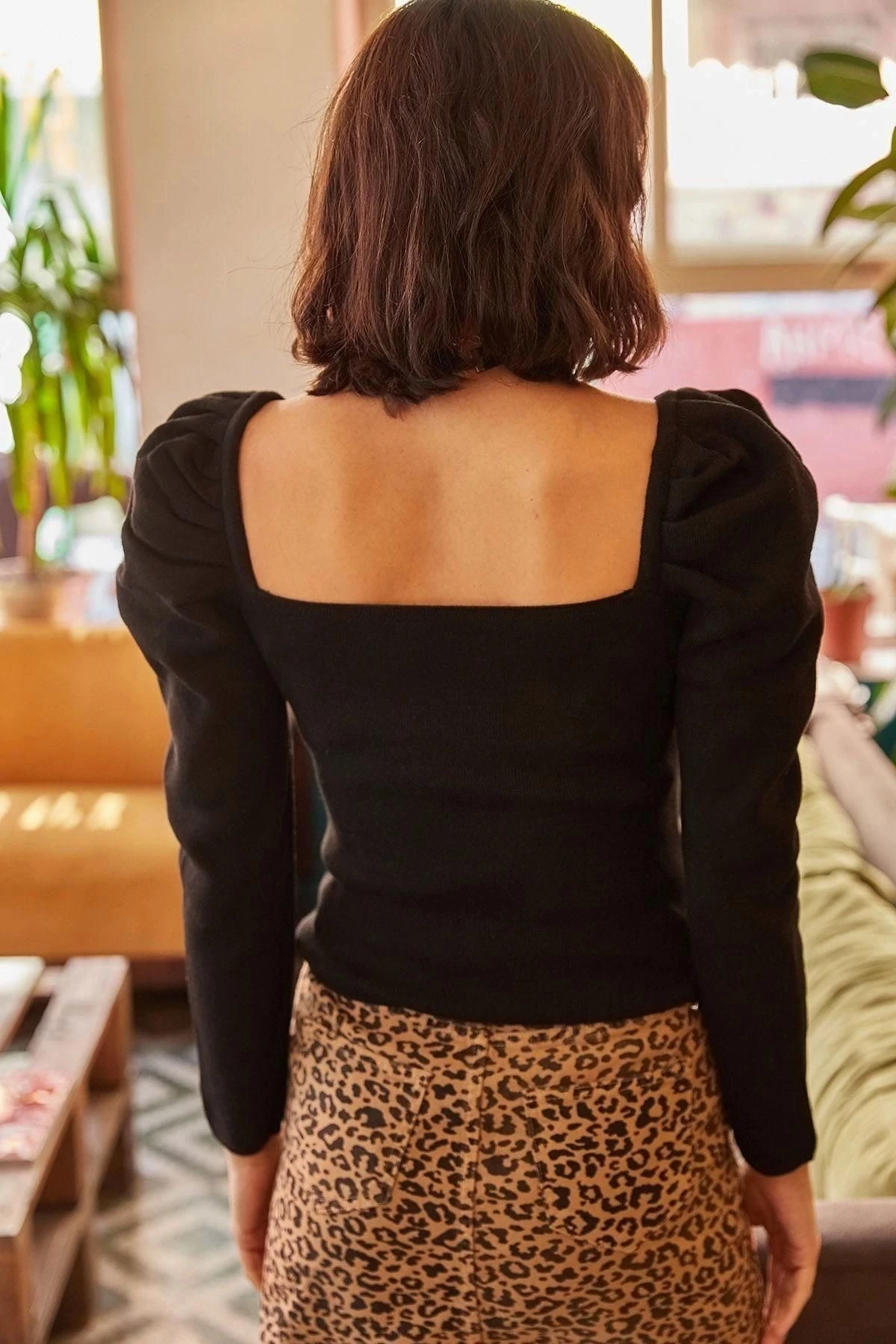 Kadın Siyah Kare Yaka Karpuz Kol Detaylı Uzun Kol Basic Regular Kesim Standart Boy Bluz