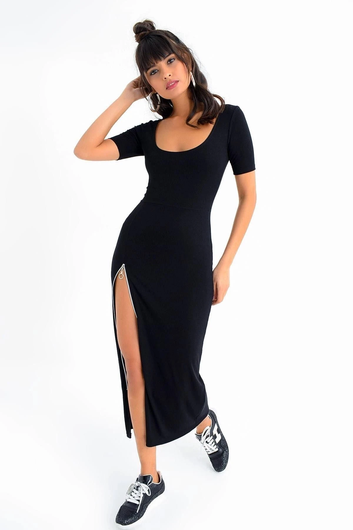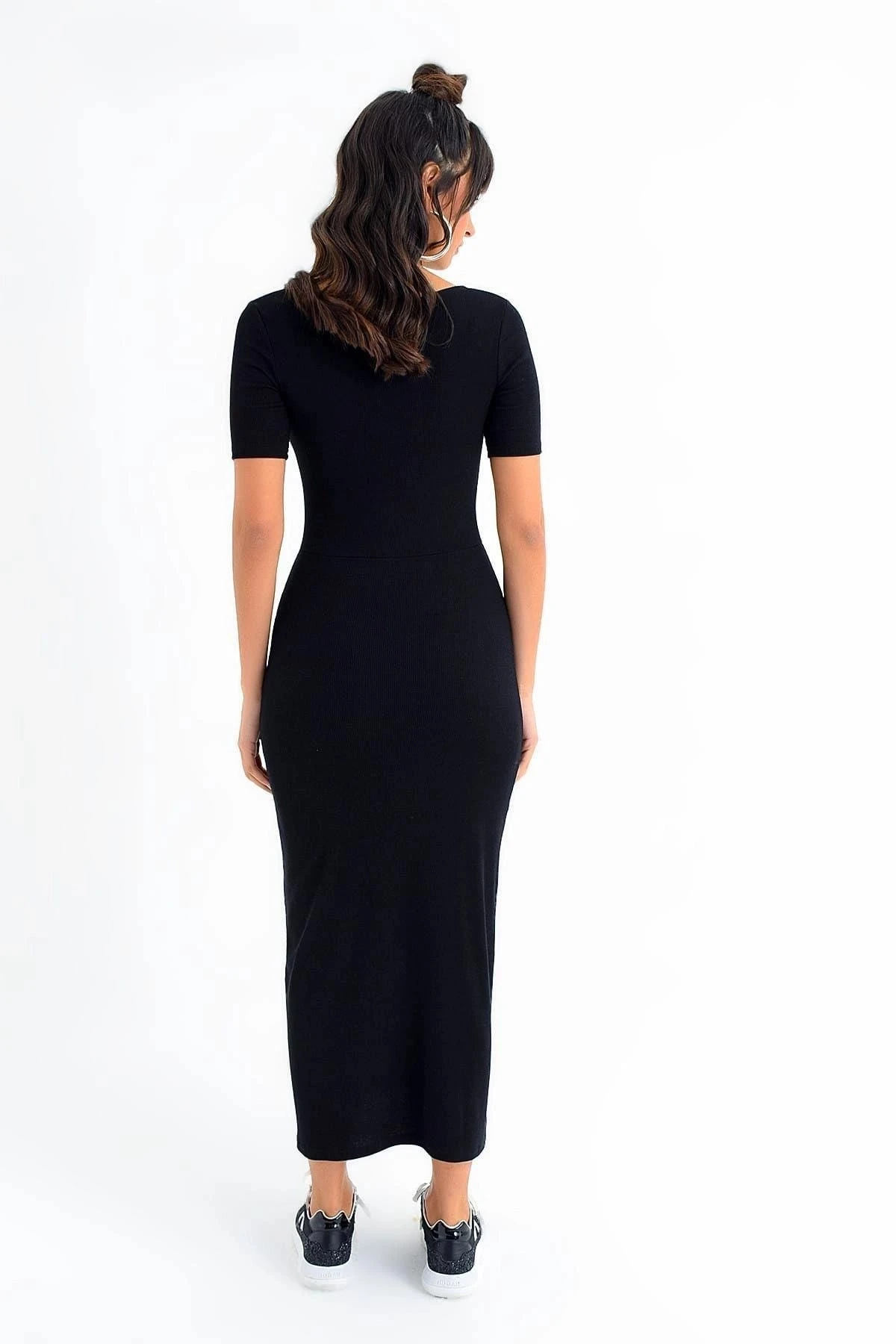 Bu siyah renkli, kare yaka ve kısa kollu elbise, her kadının gardırobunda olması gereken bir parçadır.; Derin yırtmaçları ve vücuda tam oturan kesimiyle modern bir görünüm sunar.; Basic kaliteli kumaşıyla dikkat çeken bu elbise, rahat bir gün geçirmeniz için idealdir.; Bu elbisenin kumaşı %95 polyester ve %5 elastan içerir.; Polyester, hafif ve dayanıklı bir malzemedir, böylece elbisenin uzun süre dayanmasını sağlar.; Elastan ise esneklik kazandırarak hareket özgürlüğünüzü artırır.; Siyah renk, her dönemde şıklığı simgeler ve her türlü stil ve aksesuarla kolaylıkla kombinlenebilir.; Bu nedenle, bu elbise gardırobunuzun vazgeçilmez bir parçası olacaktır.; Kalıp olarak, bu elbise body fit kesimiyle tasarlanmıştır.; Vücudu saran ve hatlarınızı belirginleştiren bu kesim, zarif ve çekici bir siluet oluşturmanıza yardımcı olur.; Aynı zamanda maksi boyuyla da dikkat çeken bu elbise, uzun ve zarif bir görünüm sağlar.; Bu elbise, günlük kullanım için idealdir.; Rahat kumaşı ve uzun boyu sayesinde gün boyu konforlu hissetmenizi sağlar.; Gündelik şıklığınızı tamamlayacak ve herhangi bir mekanda rahatlıkla giyilebilecek bir seçenektir.; Bu elbise, kaliteli kumaşı, şık tasarımı ve çok yönlü kullanımıyla gardırobunuza zarif bir dokunuş katmaya hazır.; Siz de bu benzersiz ve modern elbiseyle tarzınızı ortaya koyabilirsiniz.