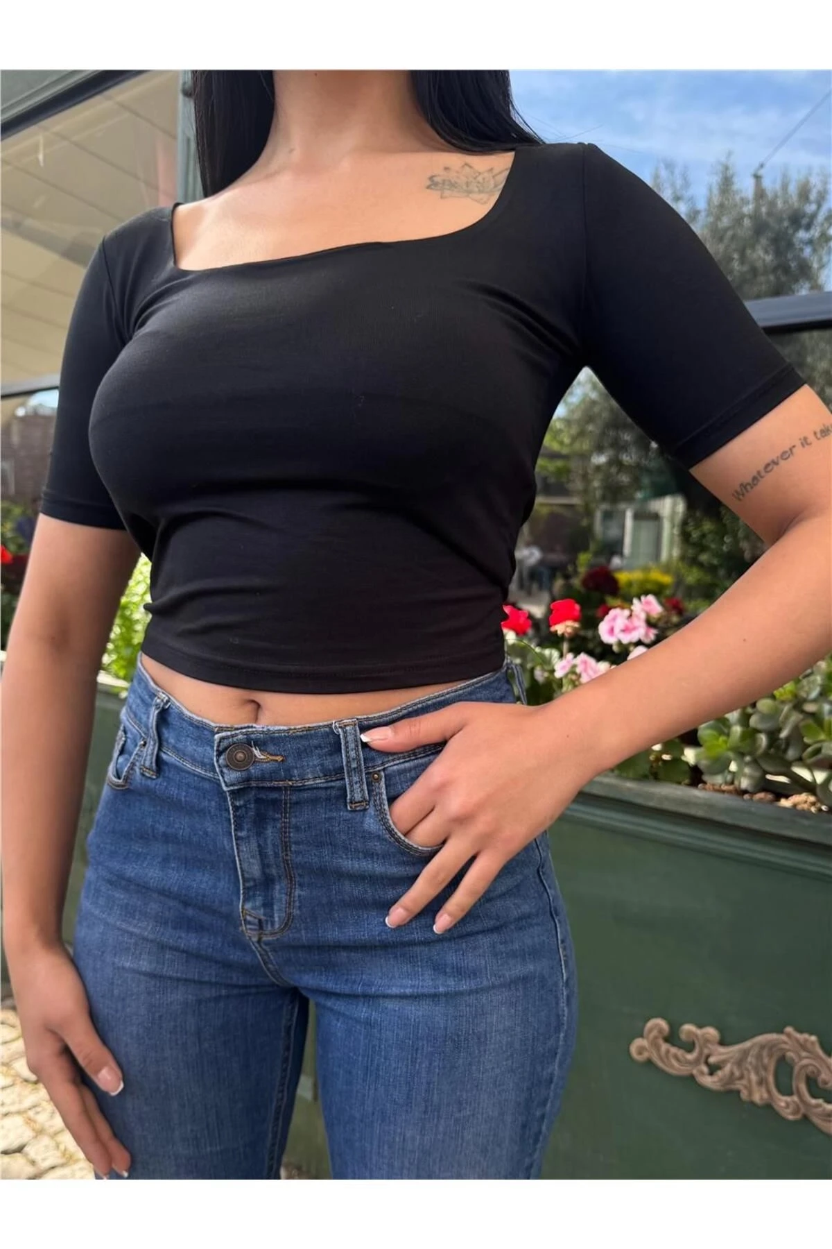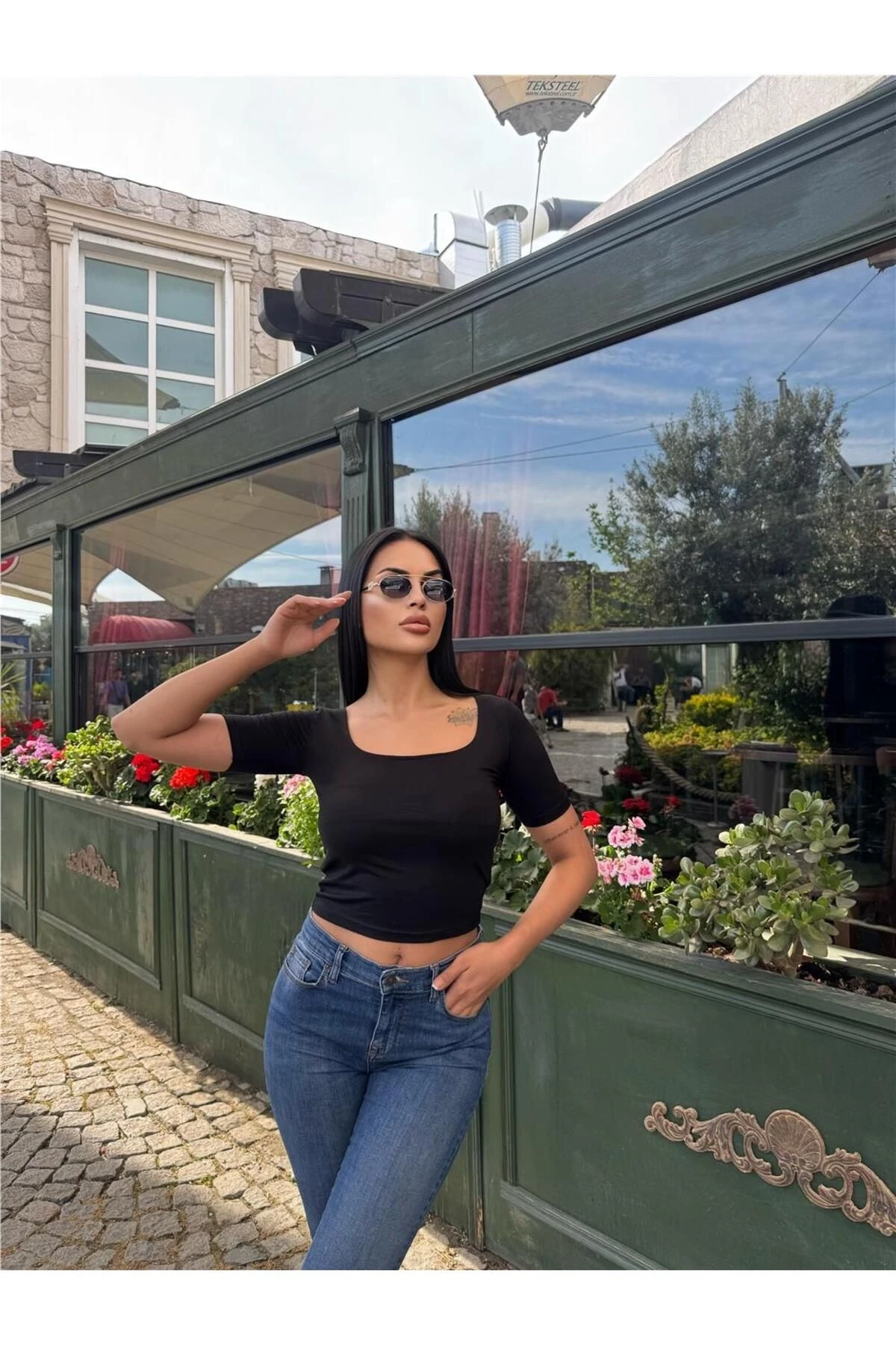Kadın Siyah Kare Yaka Kısa Kollu Viskon Badi Tişört