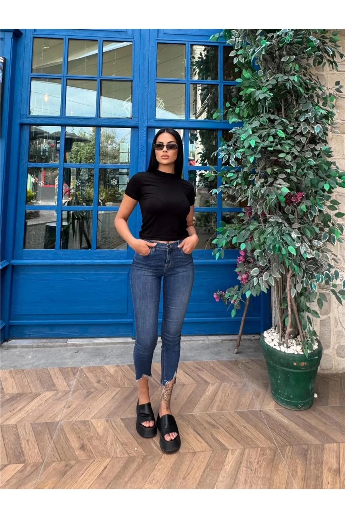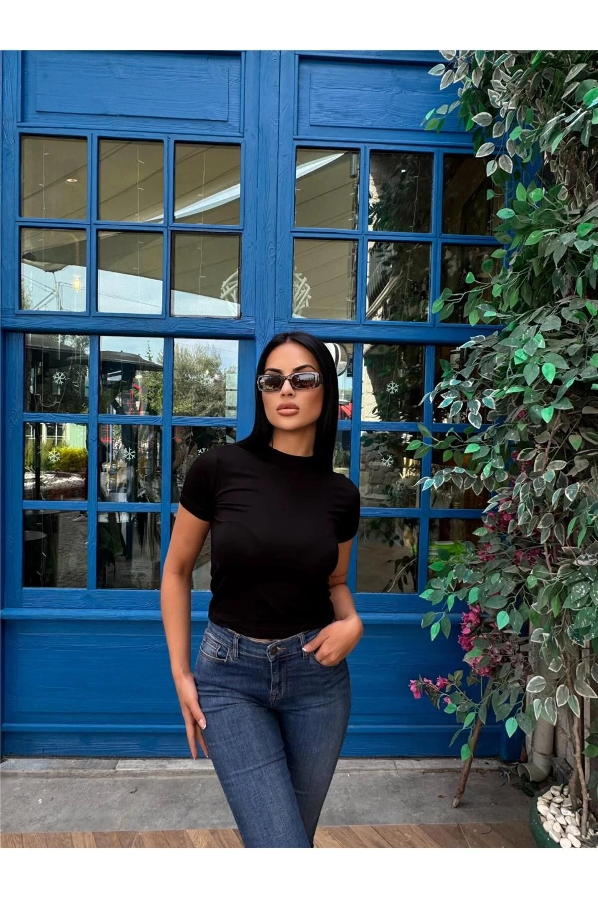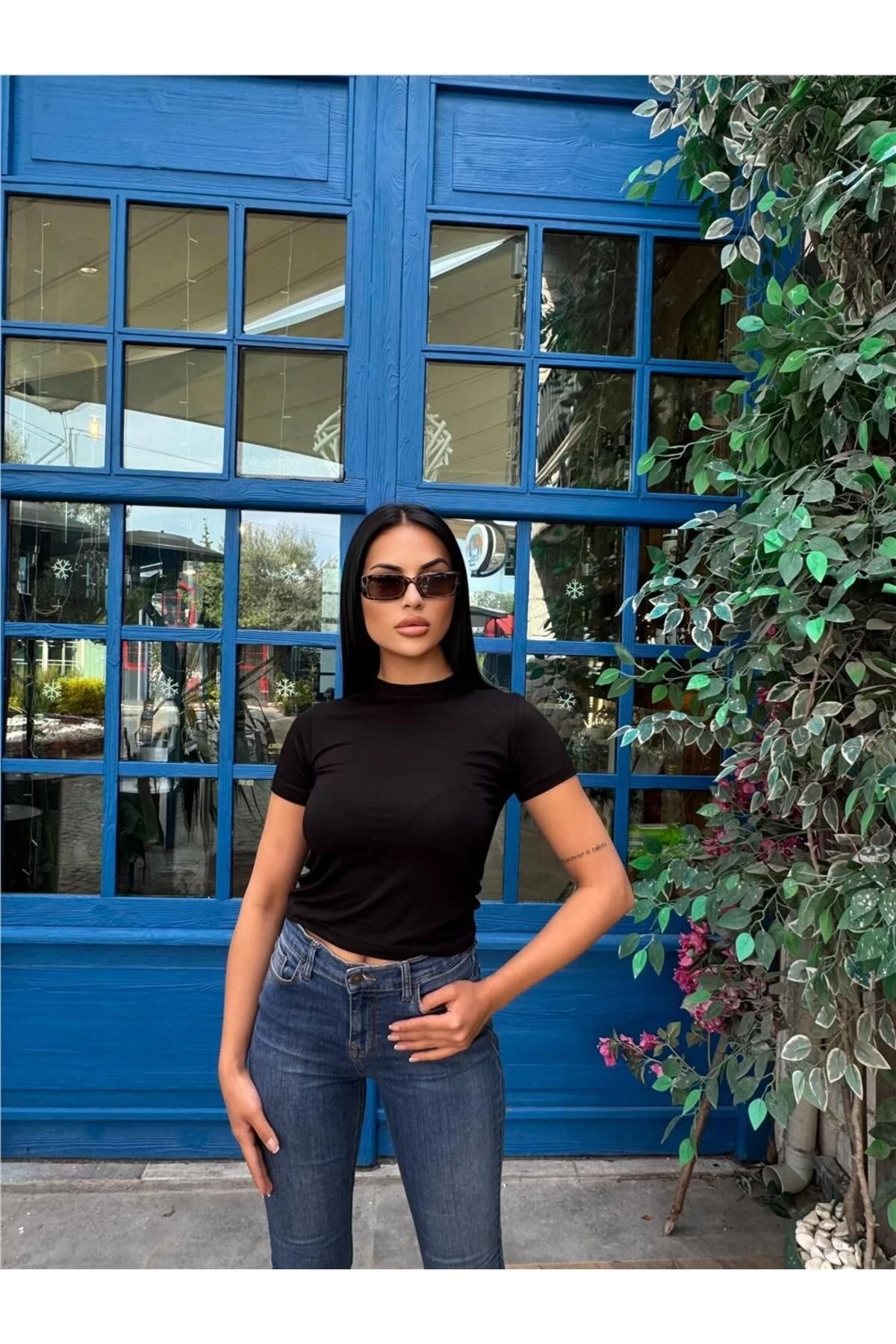 Kadın Siyah Kare Yaka Uzun Kollu Viskon Badi Tişört