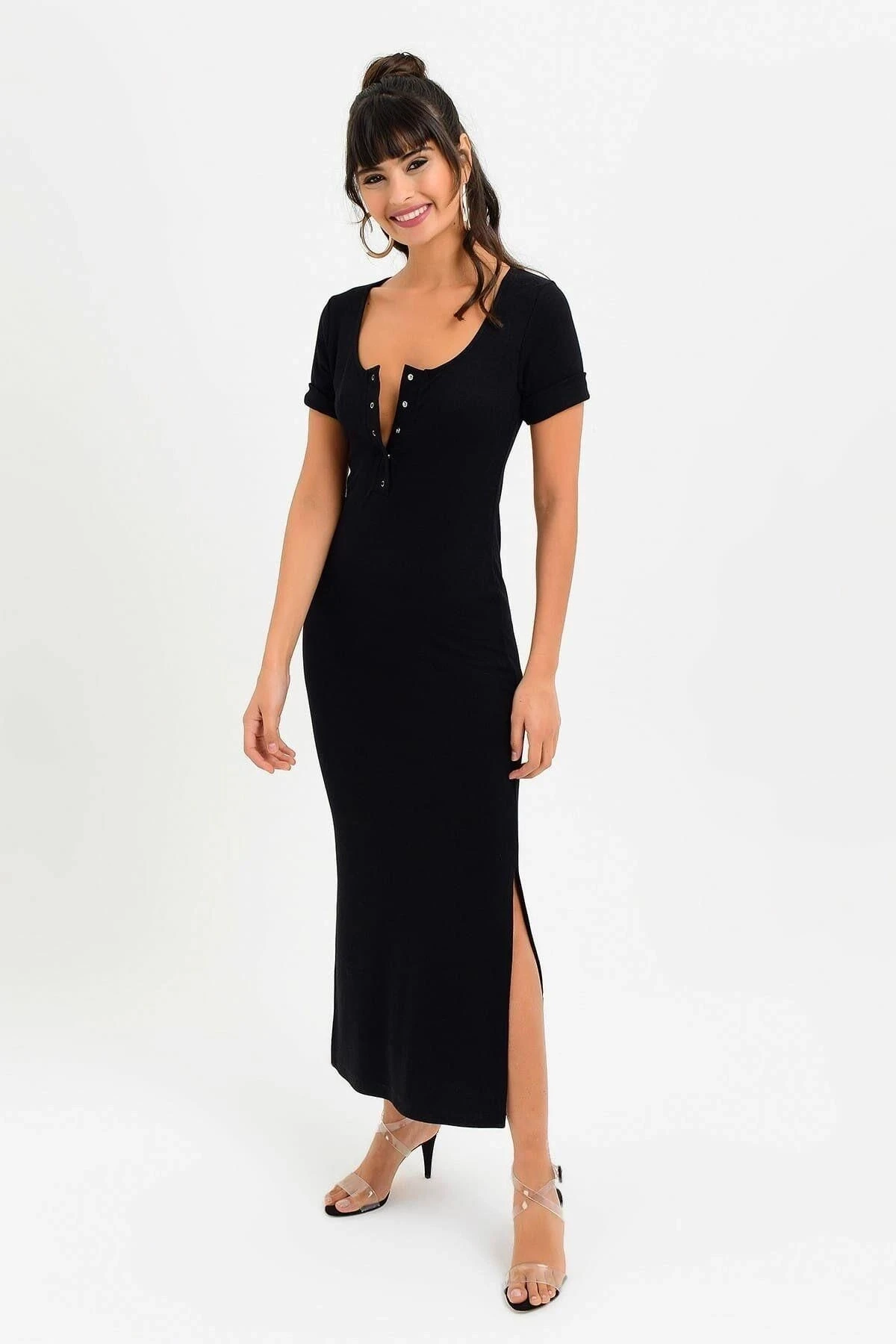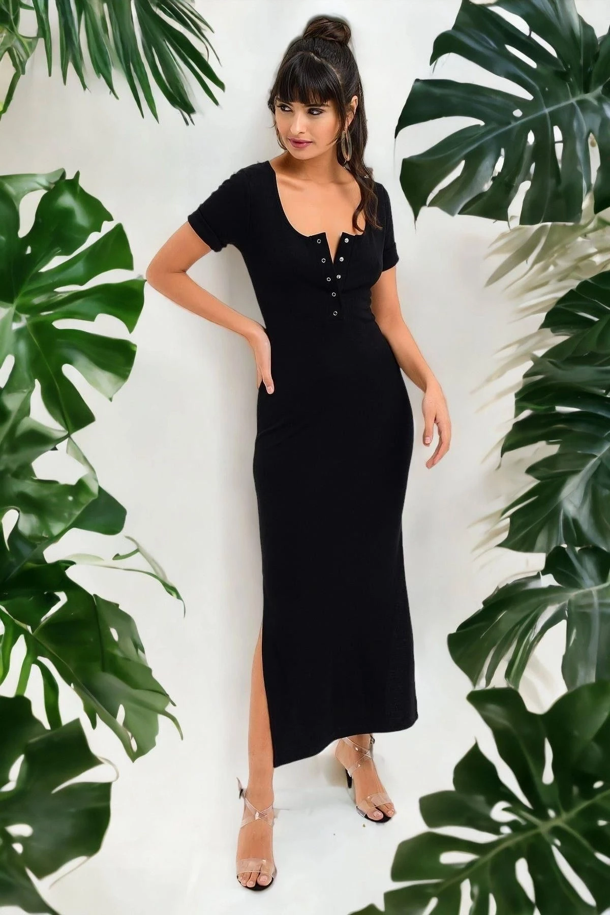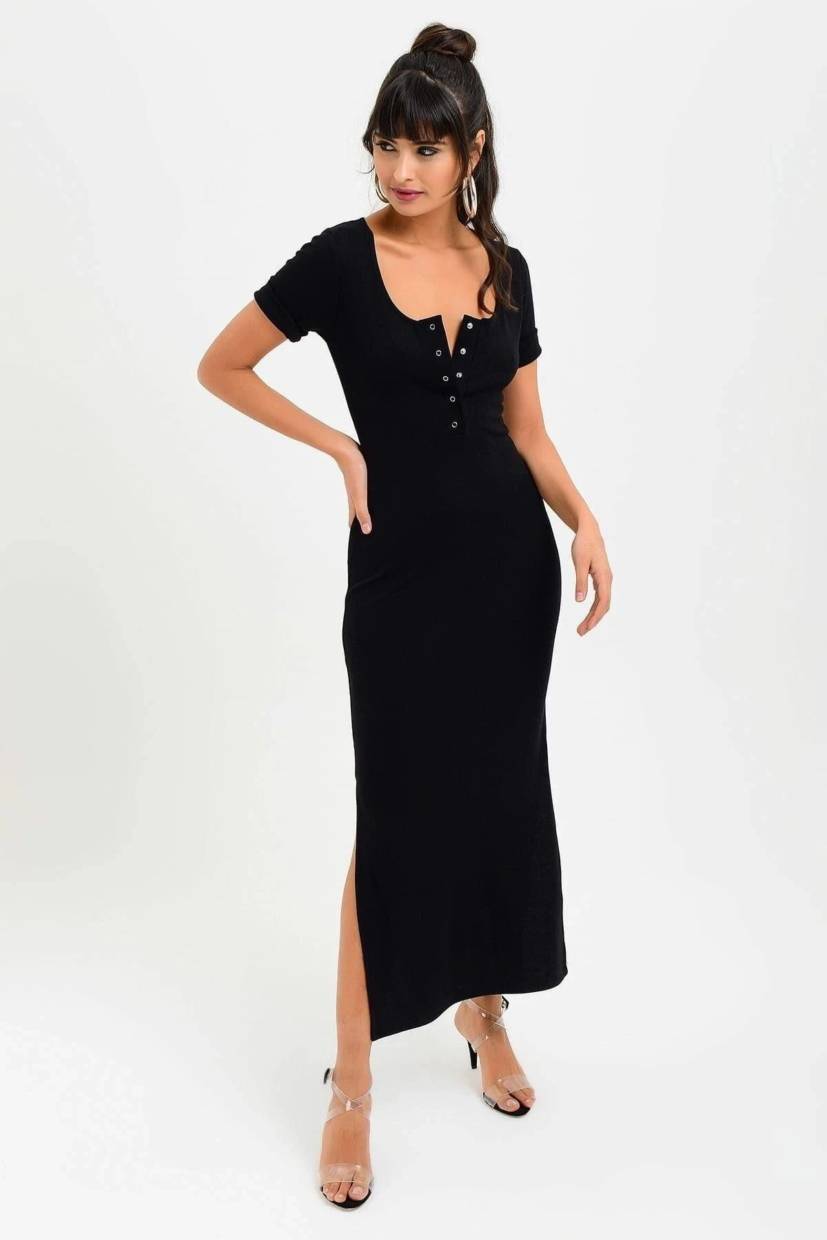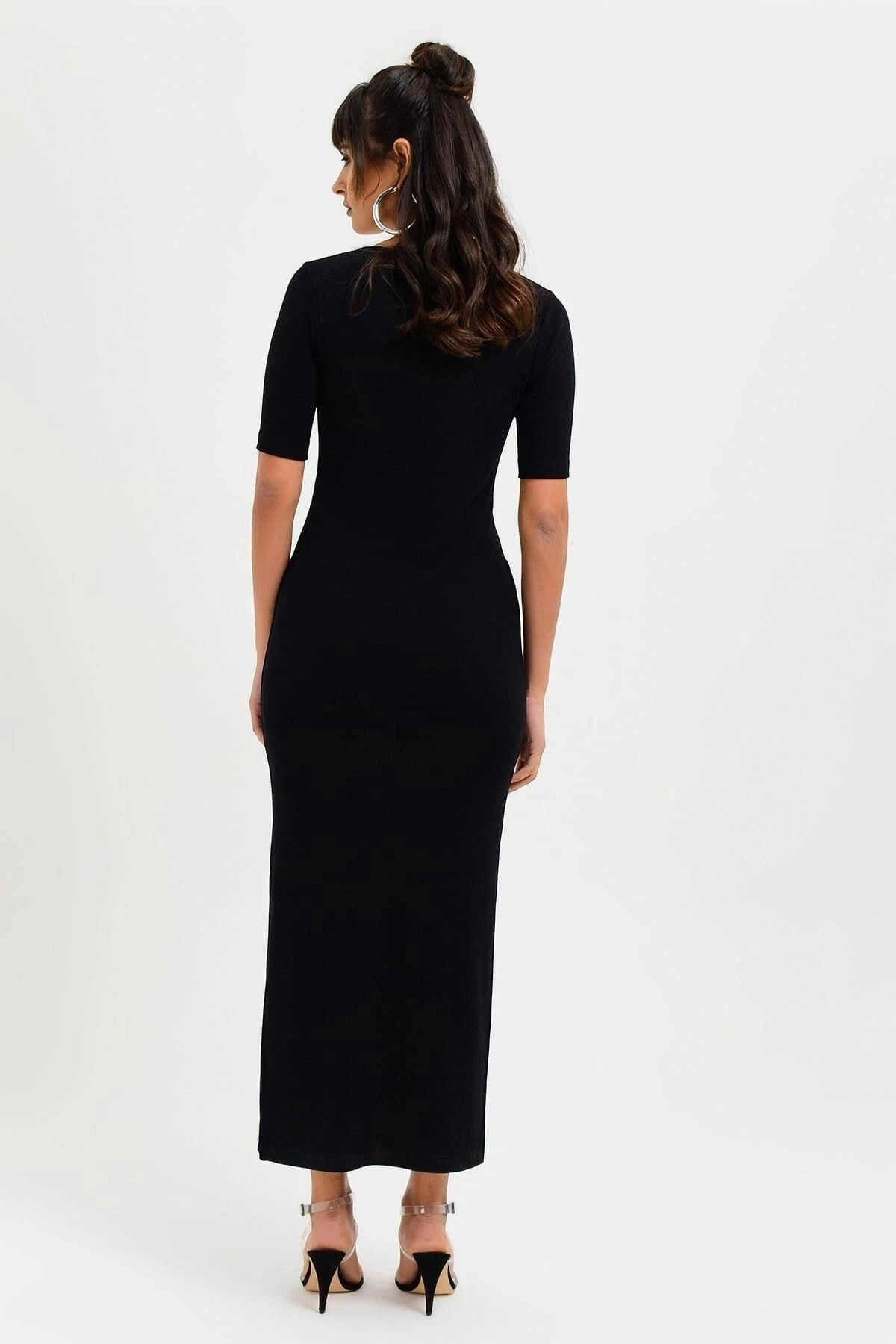 Yeni Siyah Renk Kare Yaka Elbisemiz, zarif ve modern bir tarzı bir araya getiriyor.; Bu muhteşem elbise, günlük hayatta şıklığınızı tamamlamak için mükemmel bir seçimdir.; Kaliteli kumaş yapısıyla üretilmiştir, %95 Viskon ve %5 Elastan karışımı sayesinde hem rahatlık sunar hem de uzun süre dayanıklılığını korur.; Bu özel kumaş, yumuşak dokusuyla teninizde hoş bir his bırakır.; Yarım kollu tasarımı, serinletici bir hava sağlarken aynı zamanda kollardaki zarif yırtmaç detaylarıyla da dikkat çeker.; Düğme detayları, elbiseye sofistike bir dokunuş katarak şıklığınızı vurgular.; Body fit kesimiyle, bedeninizi kusursuz bir şekilde saran bu elbise, vücut hatlarınızı güzelce vurgular ve sizi daha feminen gösterir.; Maksi boyu, zarafeti ve rahatlığı bir araya getirerek size özgüven dolu bir duruş kazandırır.; Bu siyah renkli elbise, herhangi bir gardıropta yerini kolayca bulabilir ve çeşitli durumlar için mükemmel bir seçenektir.; İş toplantılarından özel davetlere, şehirde gezerken ya da arkadaşlarınızla buluşurken, her zaman tarzınızı yansıtmanızı sağlar.; Bu elbise, tarzınızı yükseltecek ve size özel bir şıklık katacak.; Siyah Renk Kare Yaka Elbisemiz ile her adımda kendinizi özel hissedin ve bakışları üzerinize çekin.
