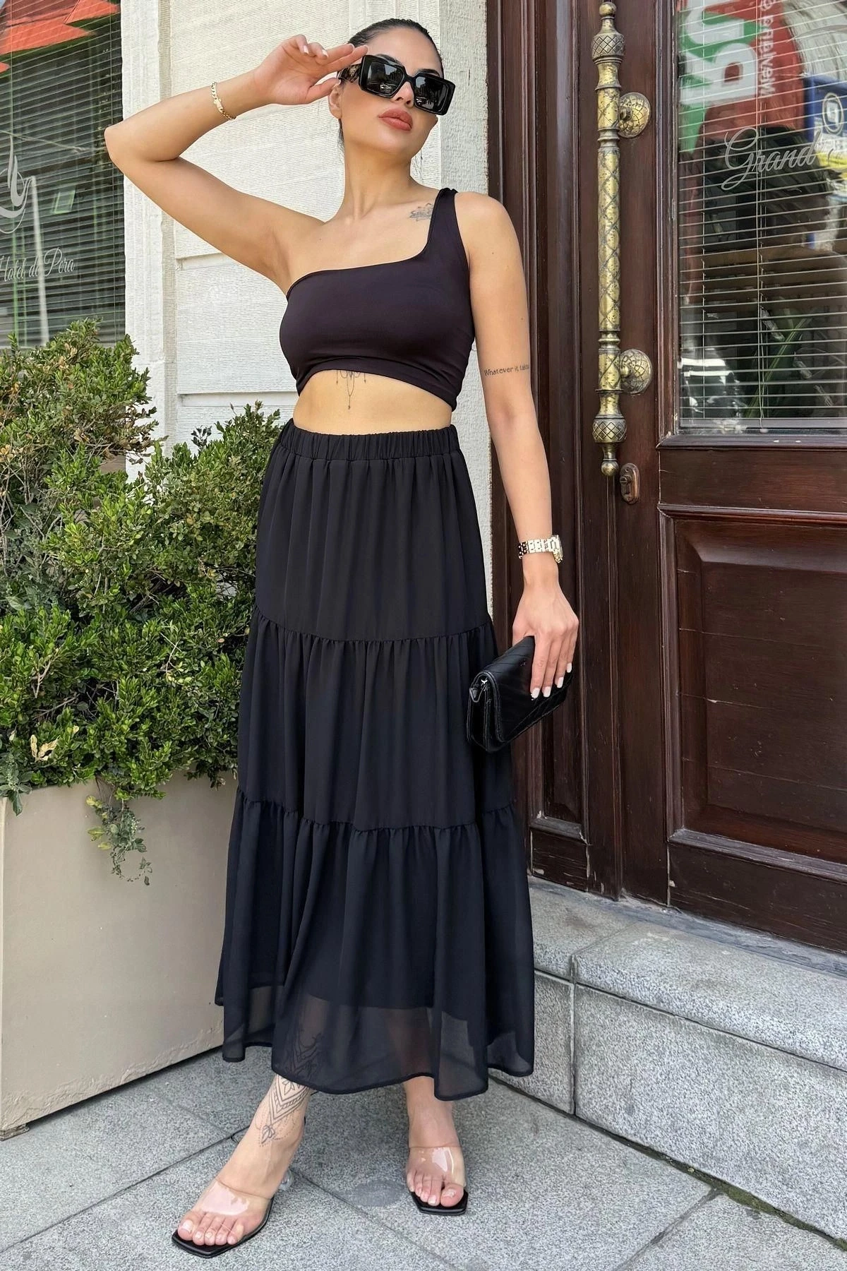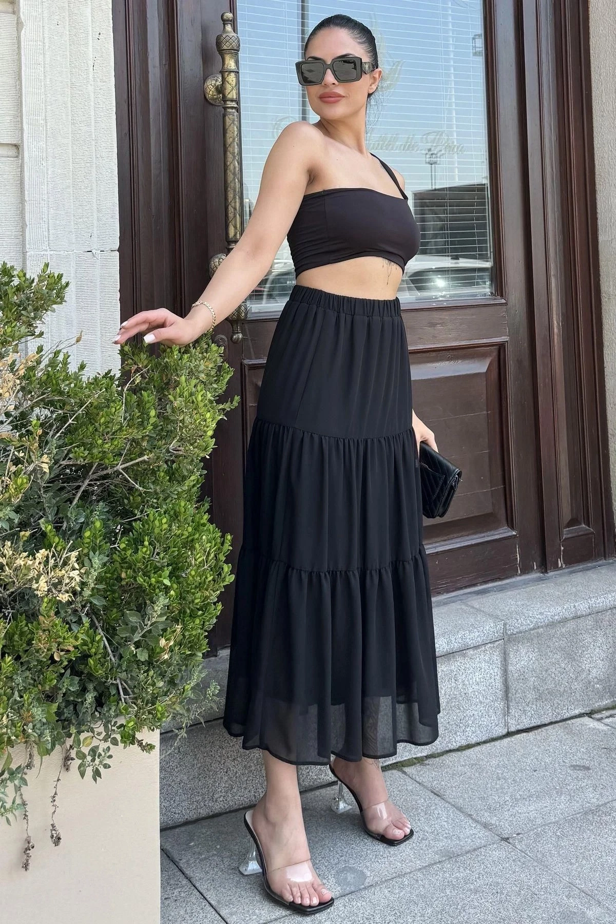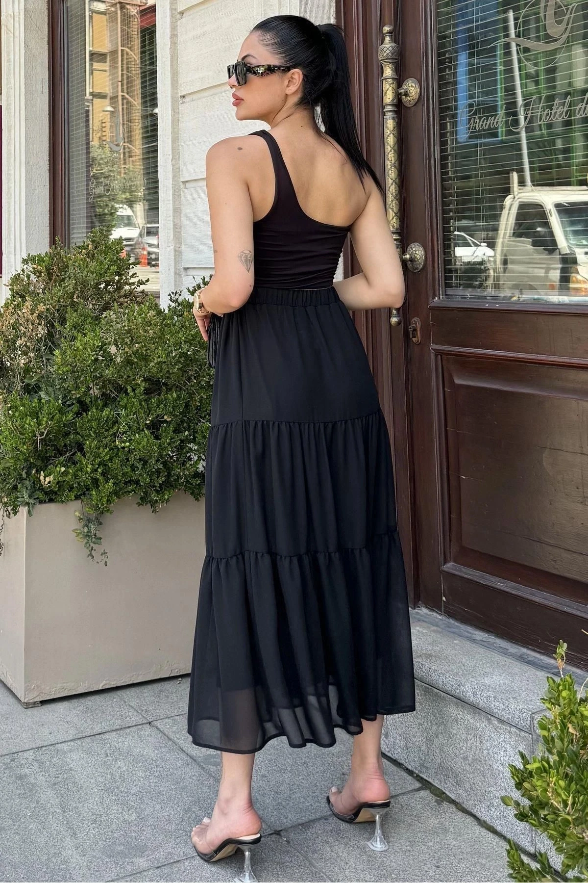 Kadın Siyah Kat Kumaşlı, Rahat Kesim, Bel Lastikli, Uzun Şifon Etek