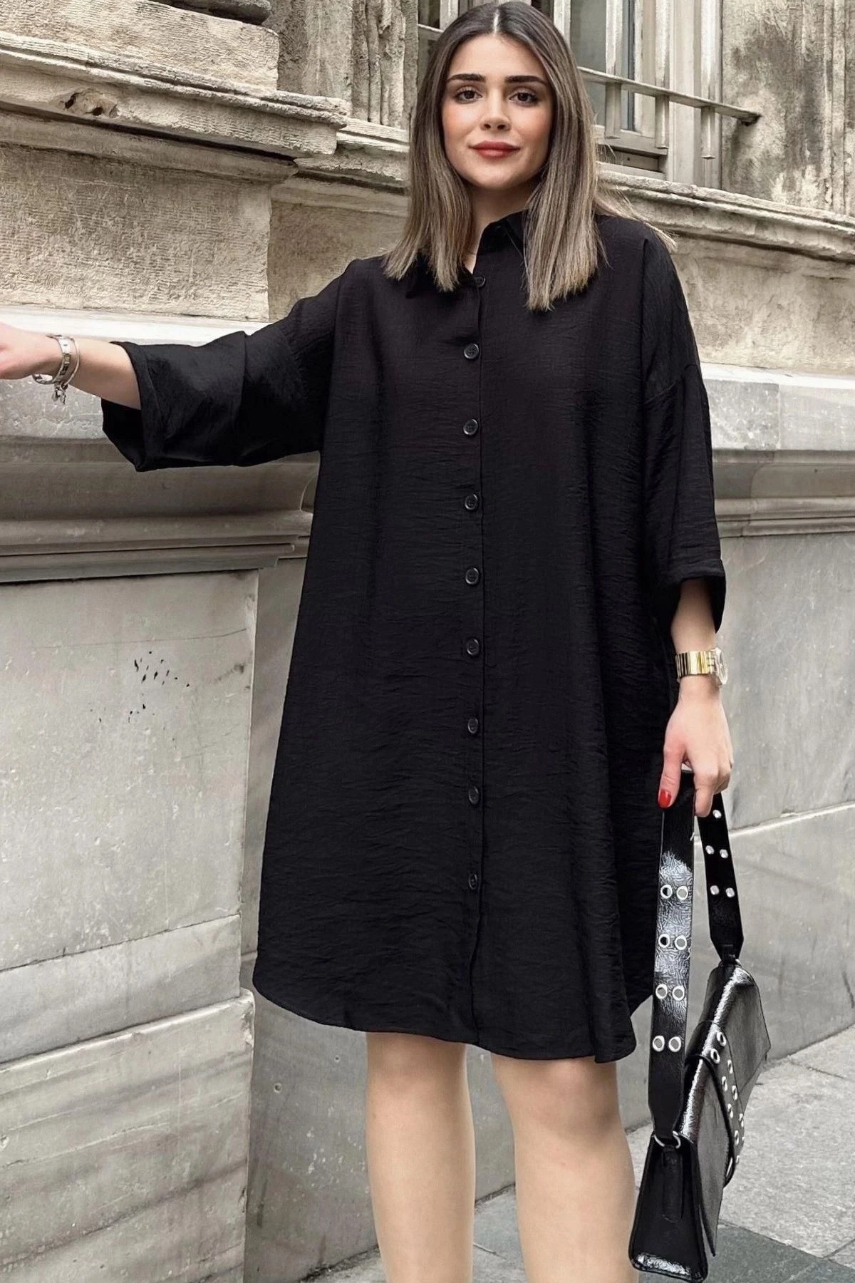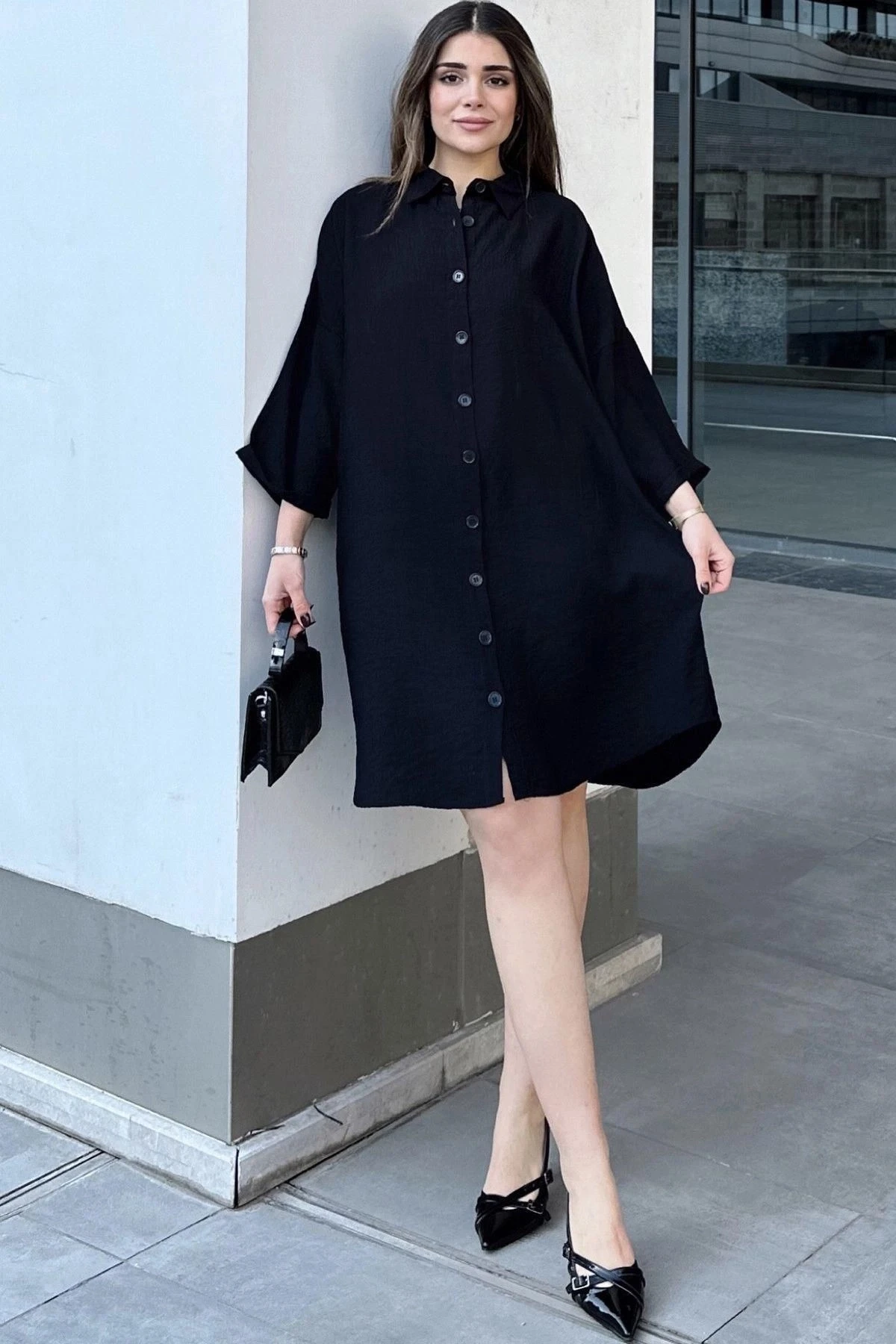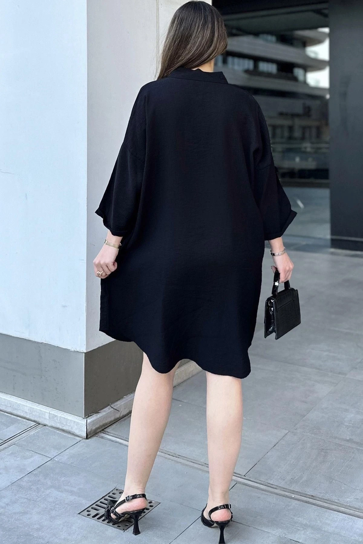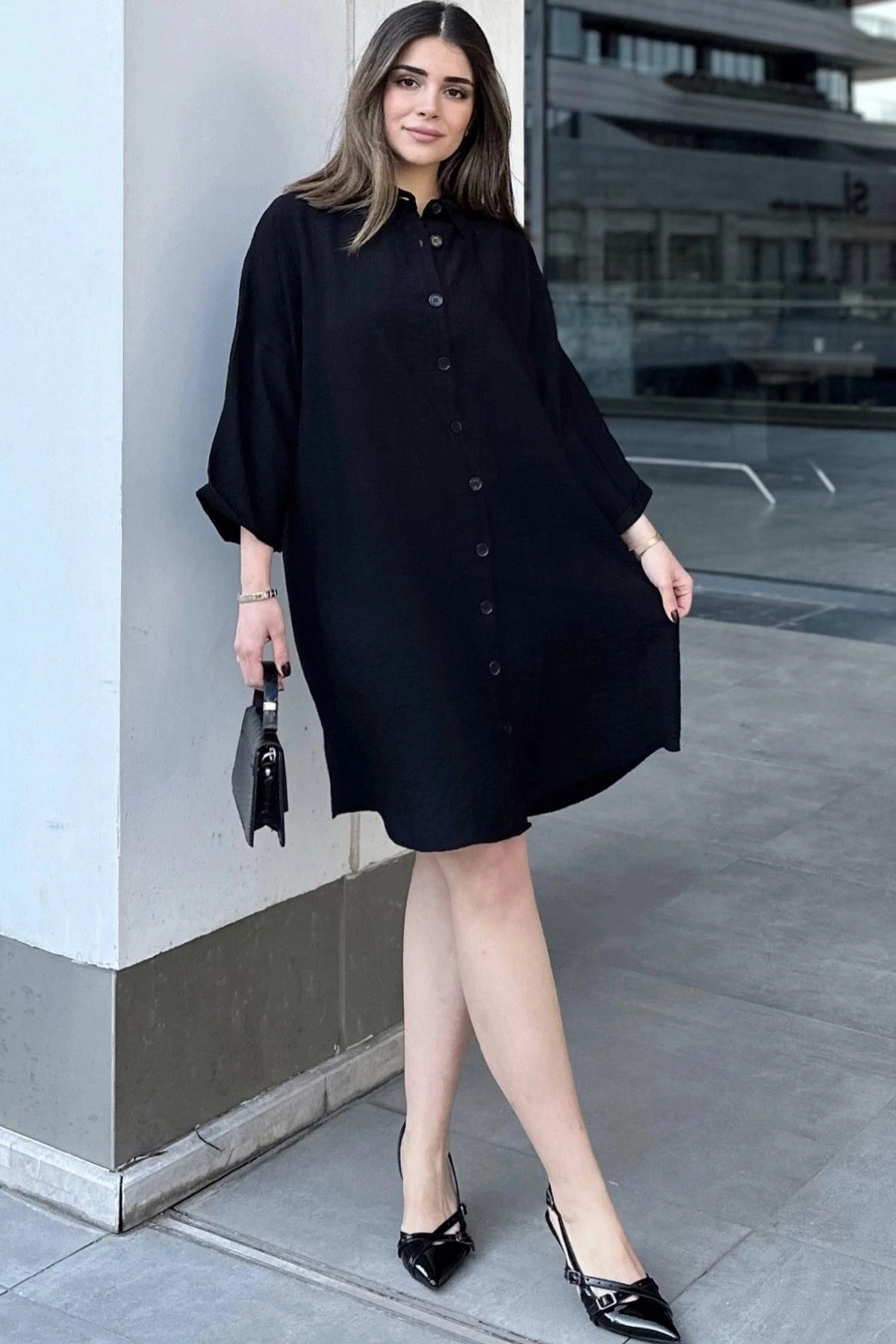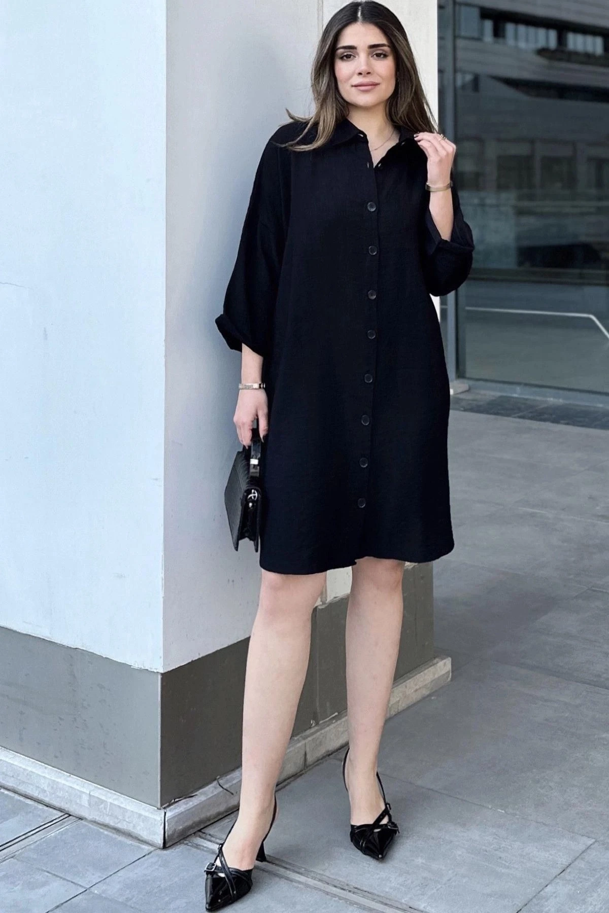 Kadın Siyah Katlamalı Yarım Kol, Eteği Oval Kesim, Midi Boy, Salaş Keten Gömlek Elbise