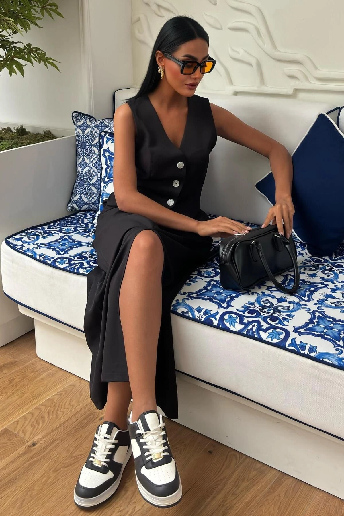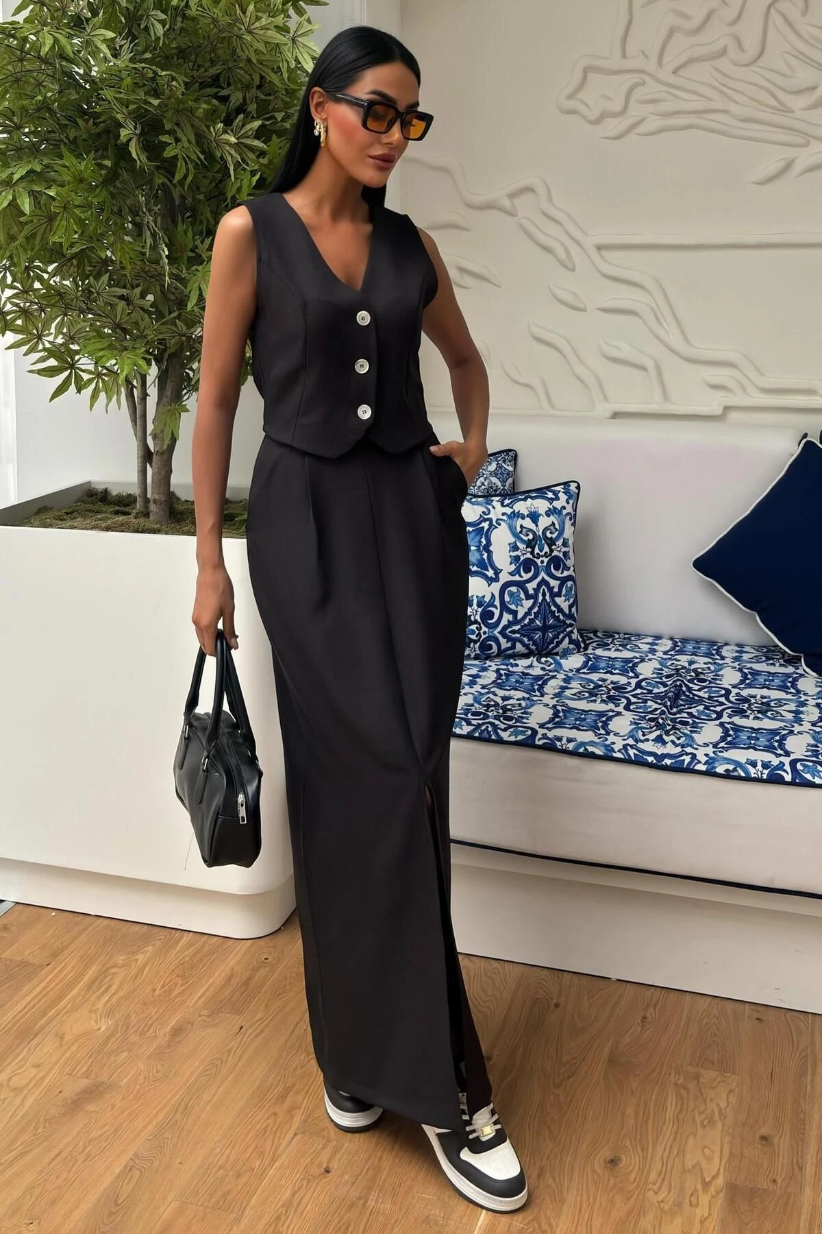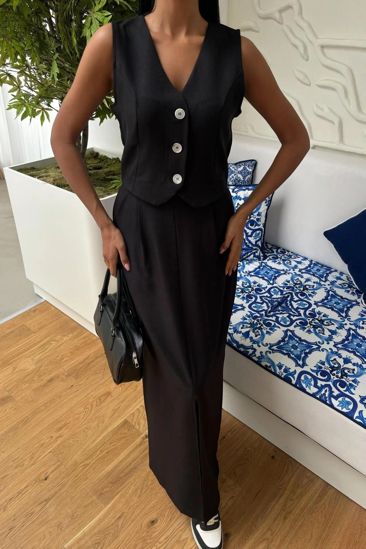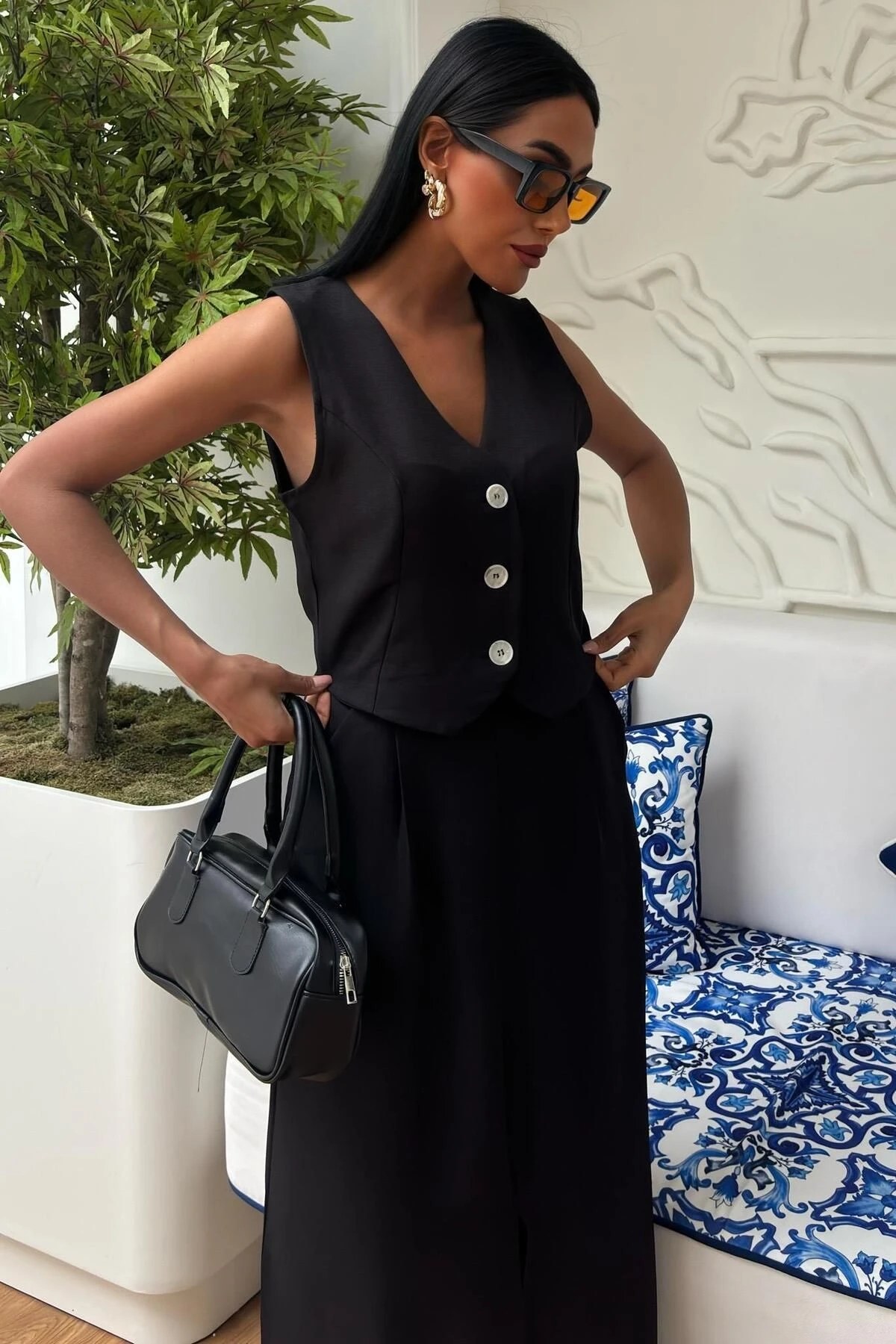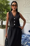 Kadın Siyah Keten V Yaka Kolsuz Takım