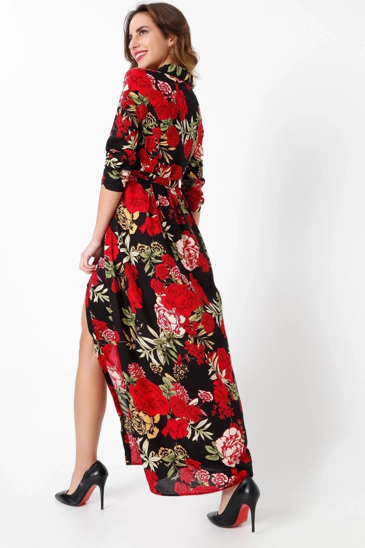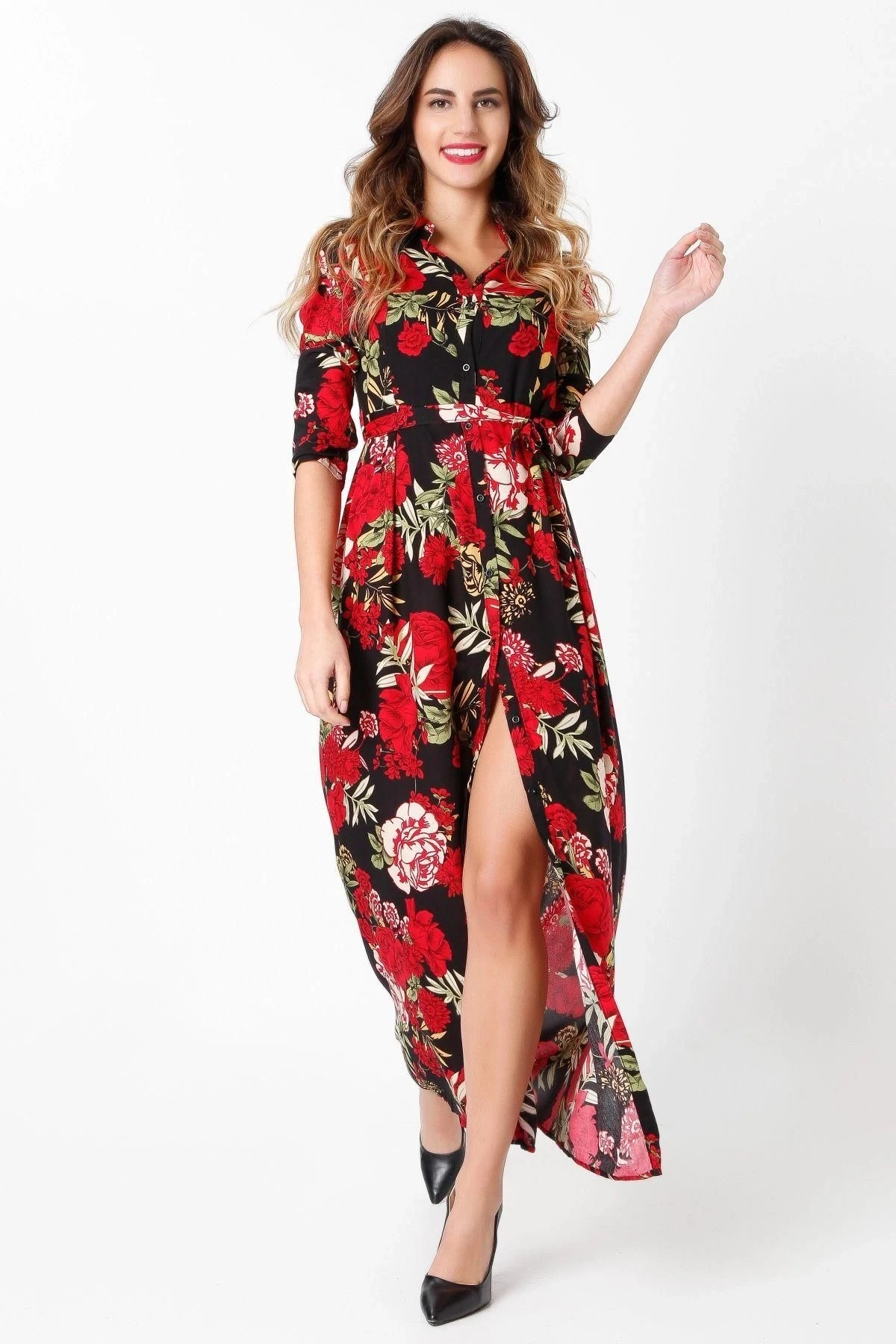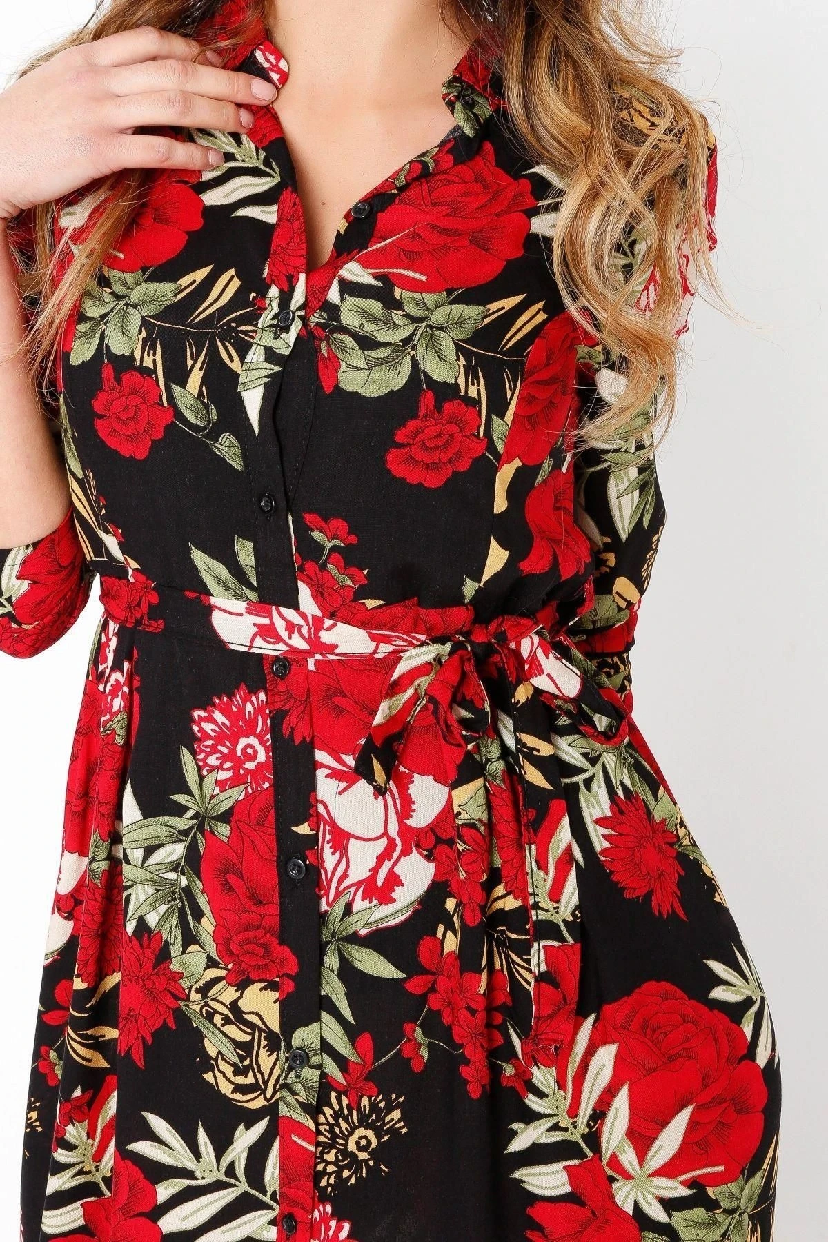 Kadın Siyah & Kırmızı Çiçek Desenli Uzun Gömlek Elbise - Uzun Kol beli kemer detay Tesettüre Uygun