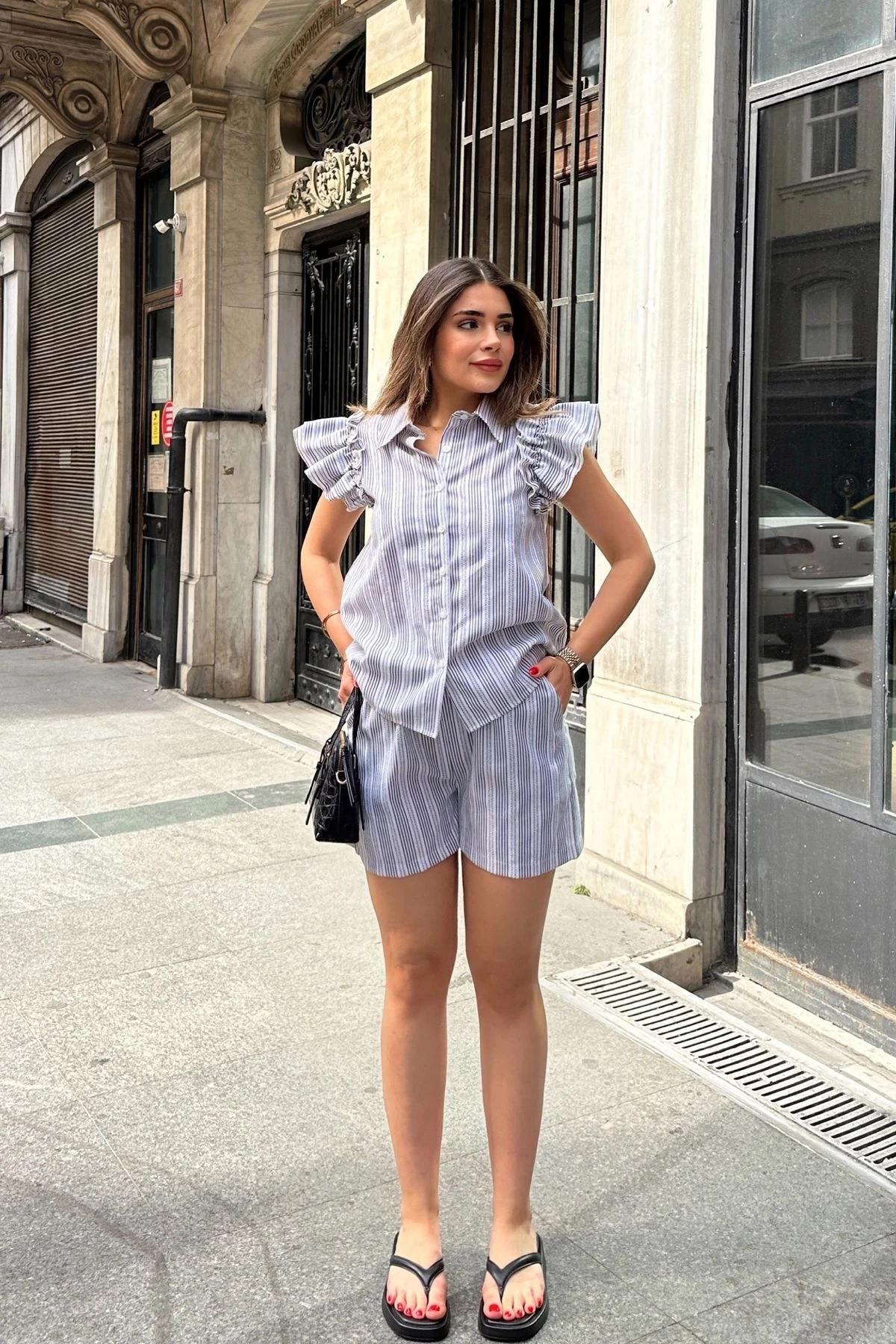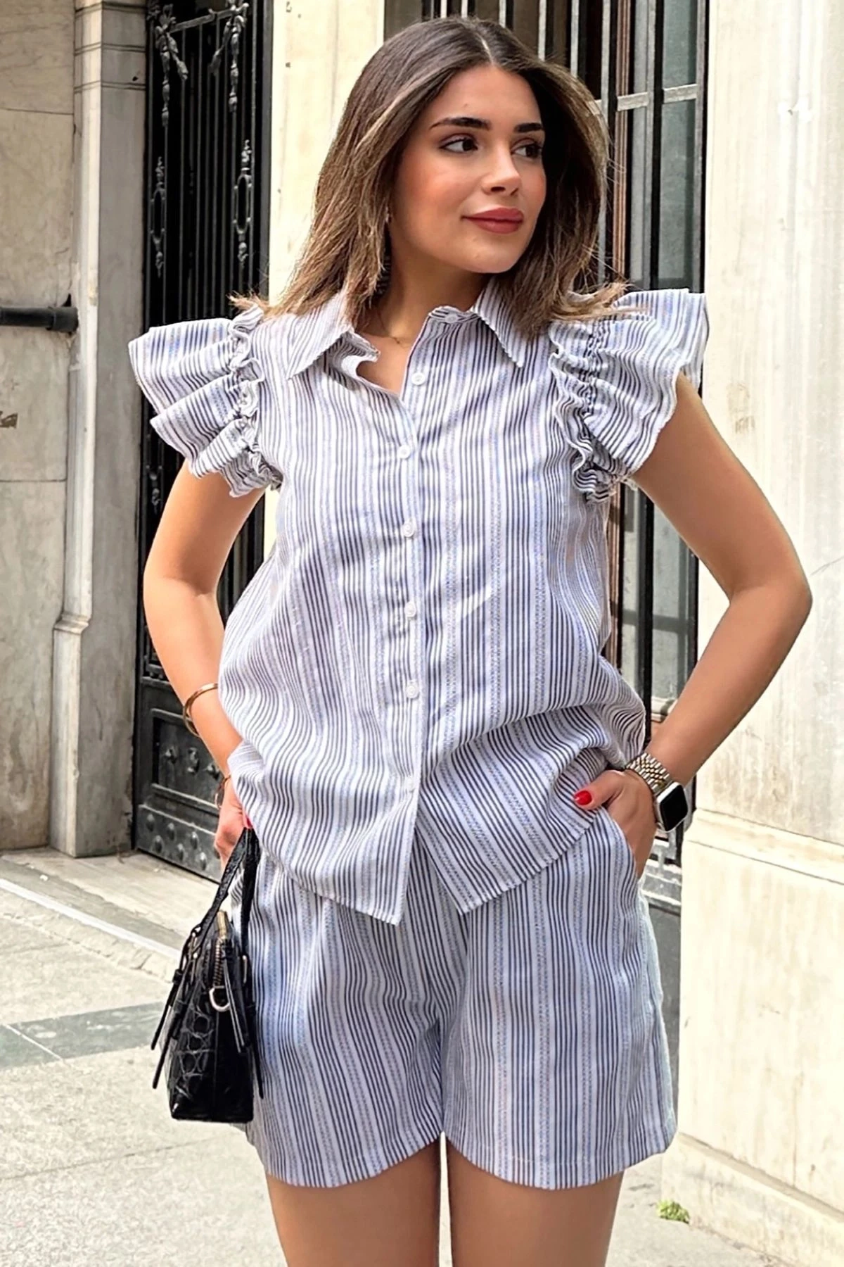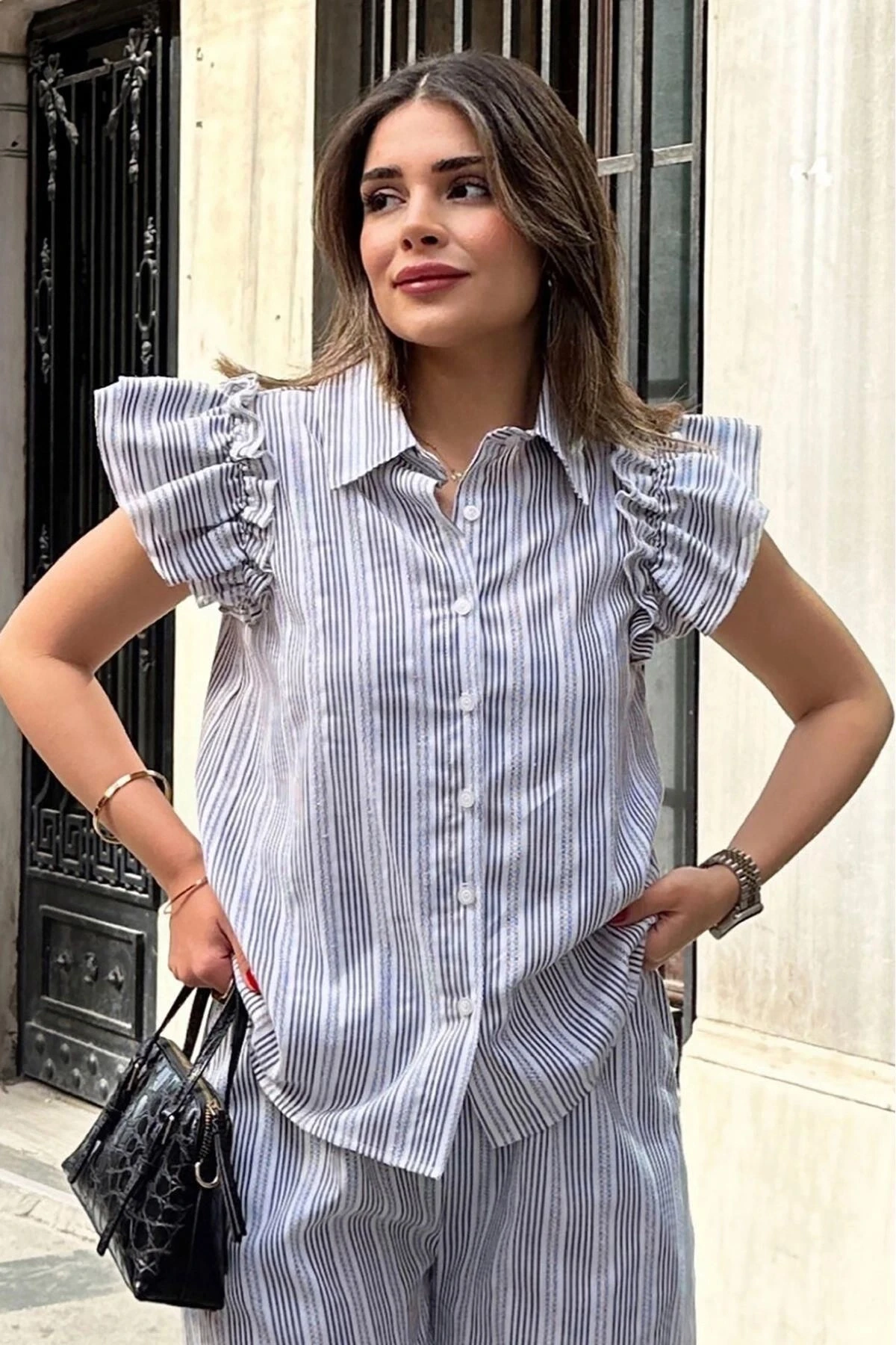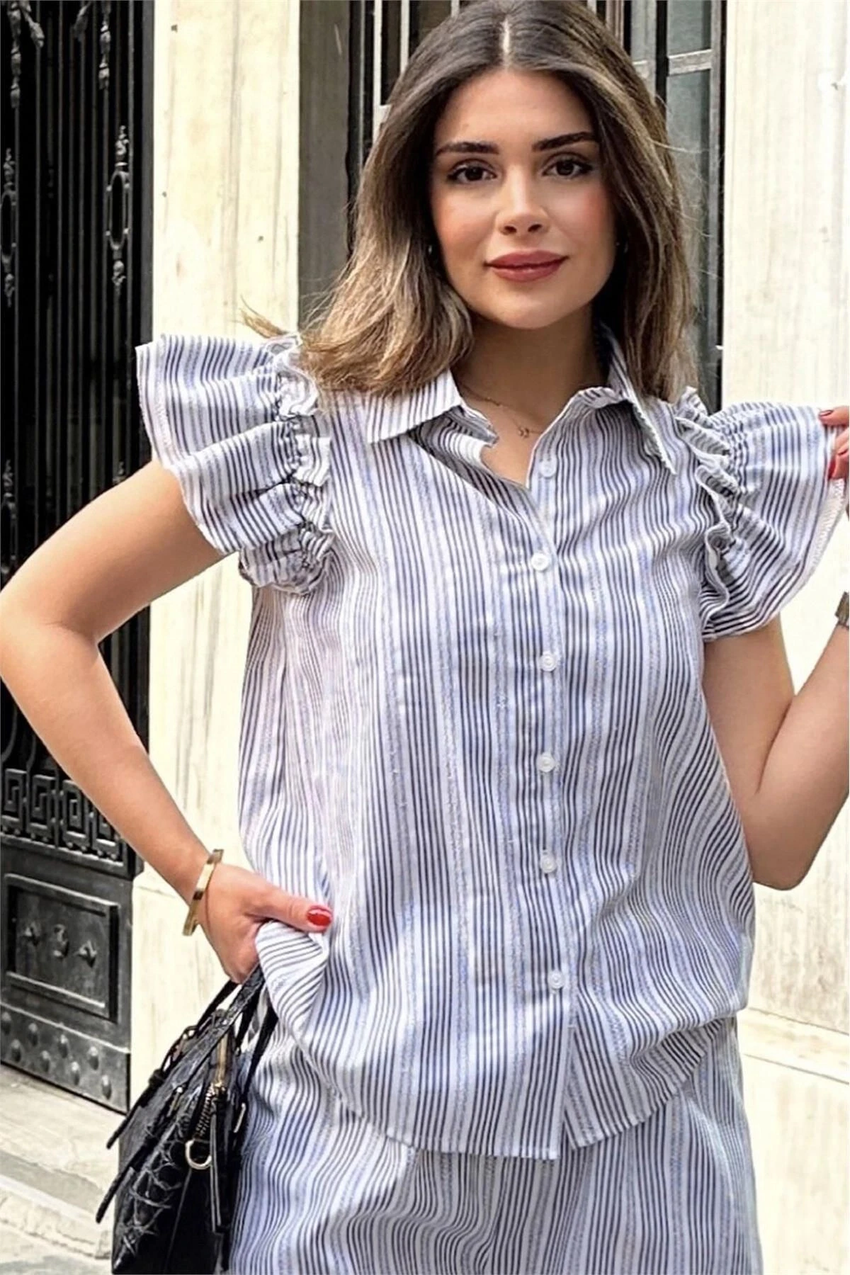 Kadın Siyah Kısa Kol, Omuzları Flare Fırfır Tasarımlı, Terletmez, Çizgi Desenli Fisto Gömlek
