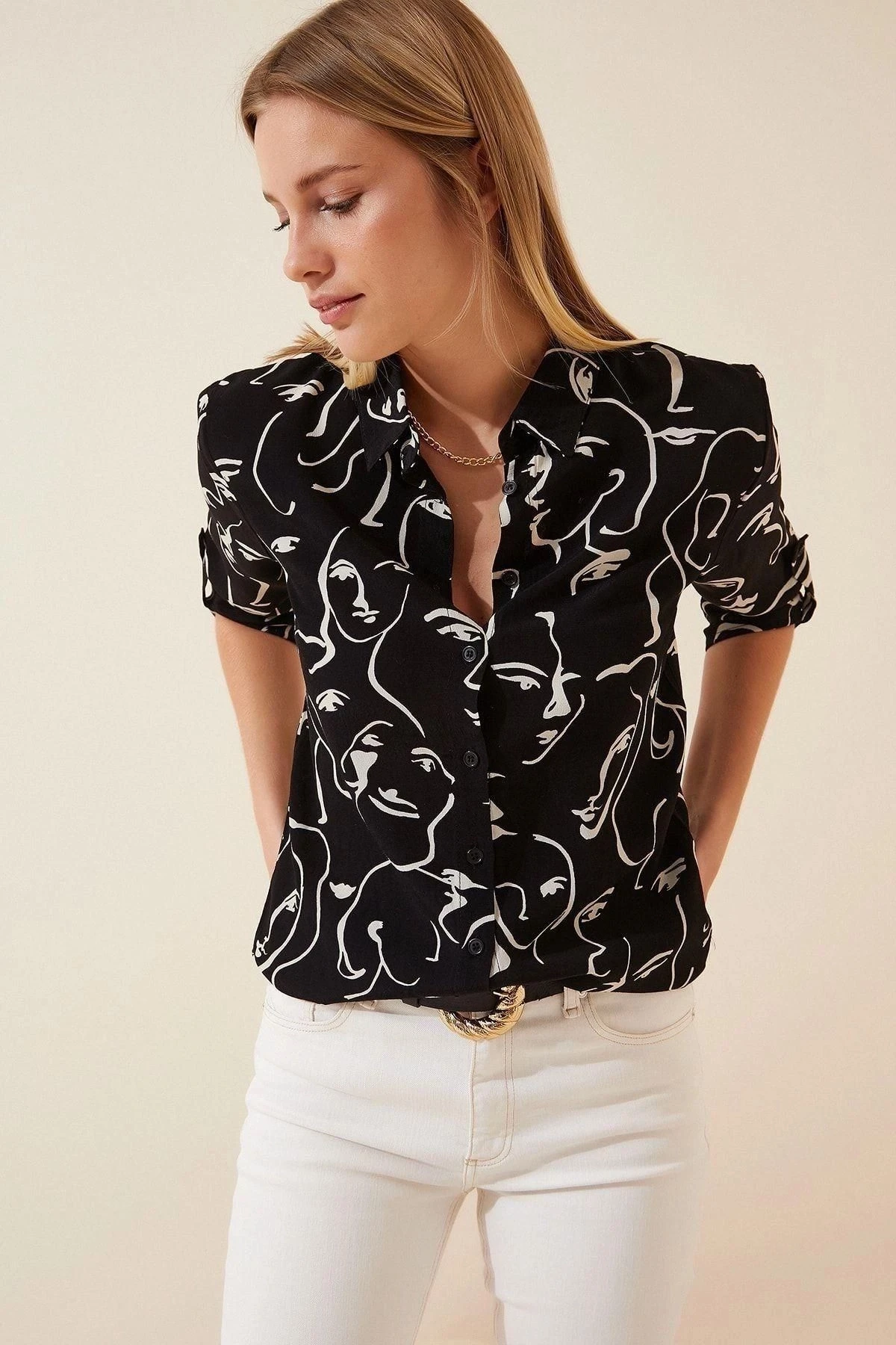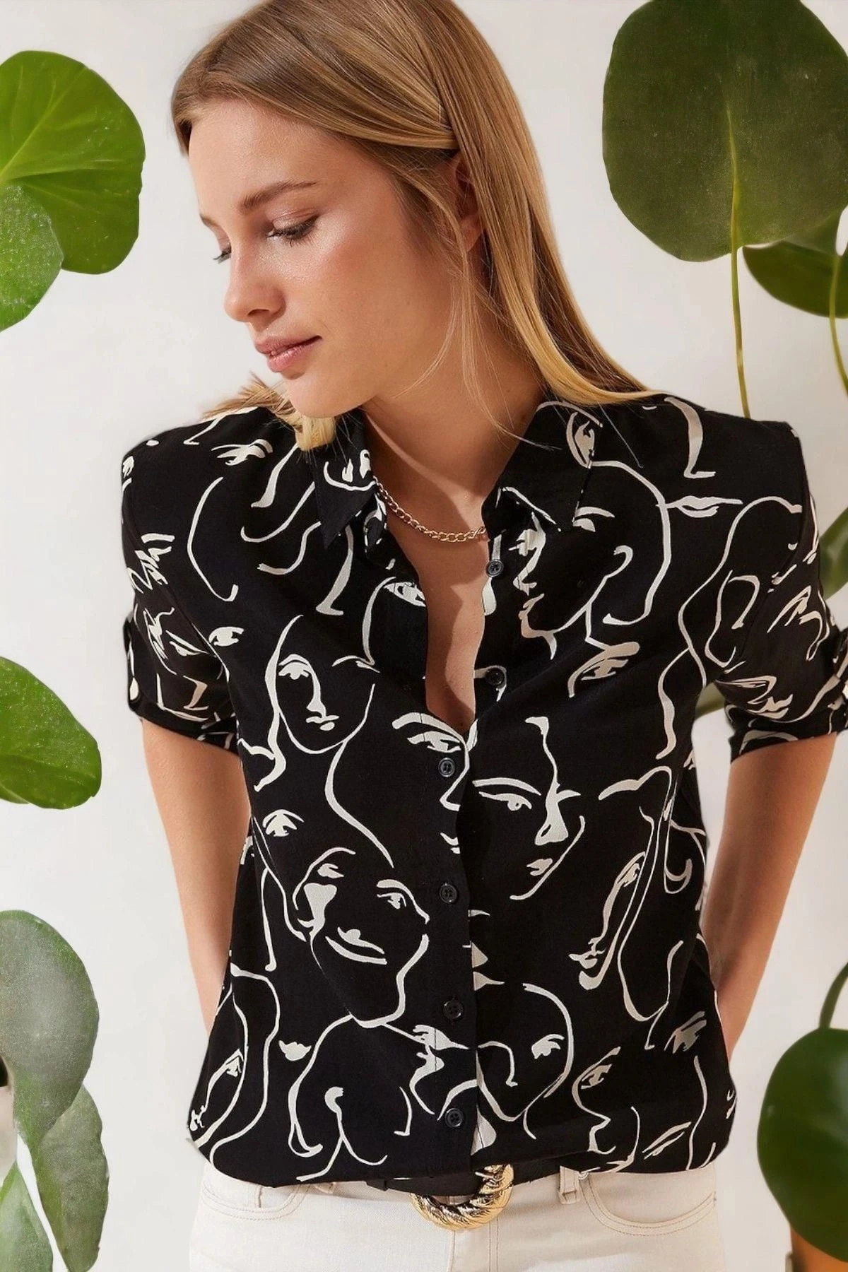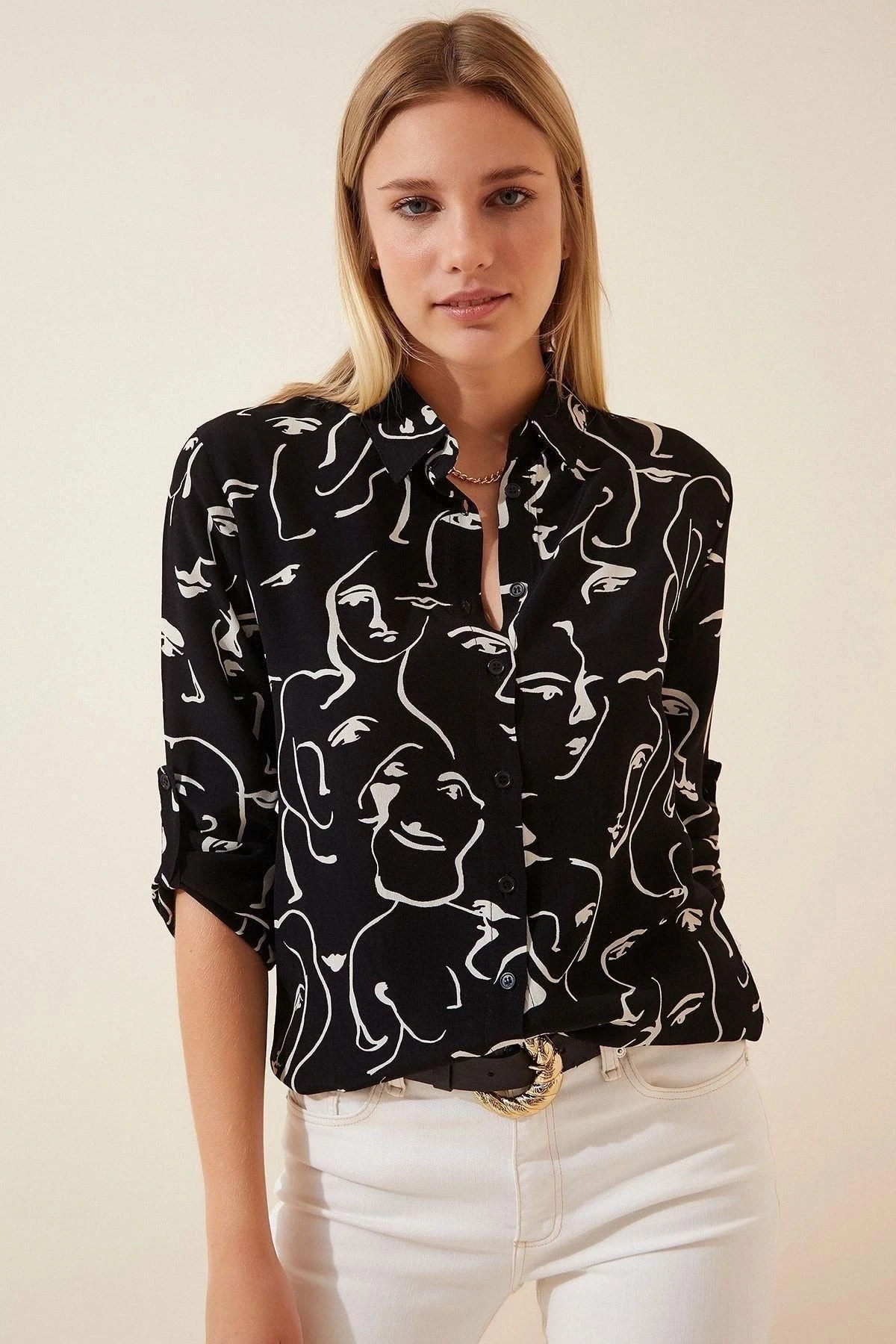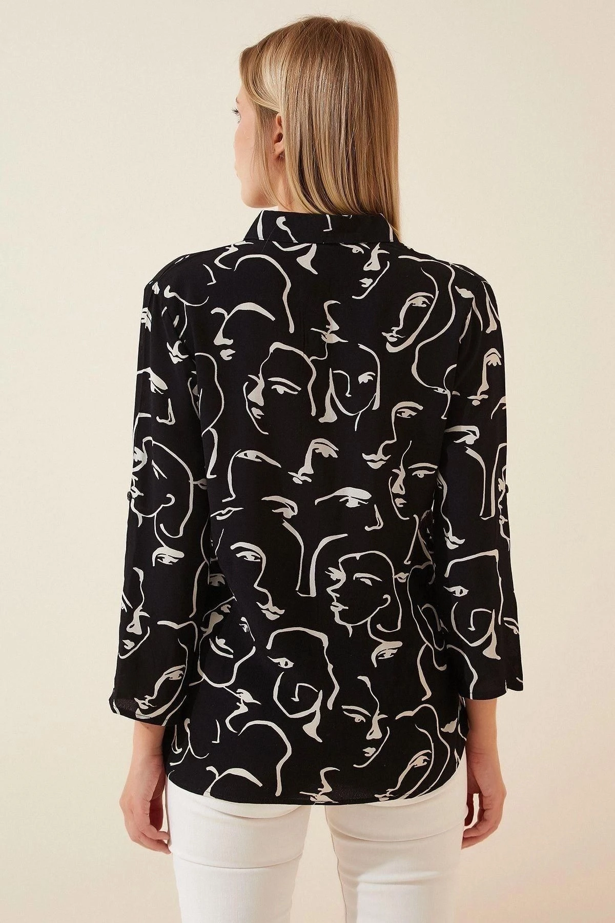 Kadın Siyah Klasik Yaka İki Renkli Desenli Uzun Kol Gömlek, Regular Kesim Standart Boy