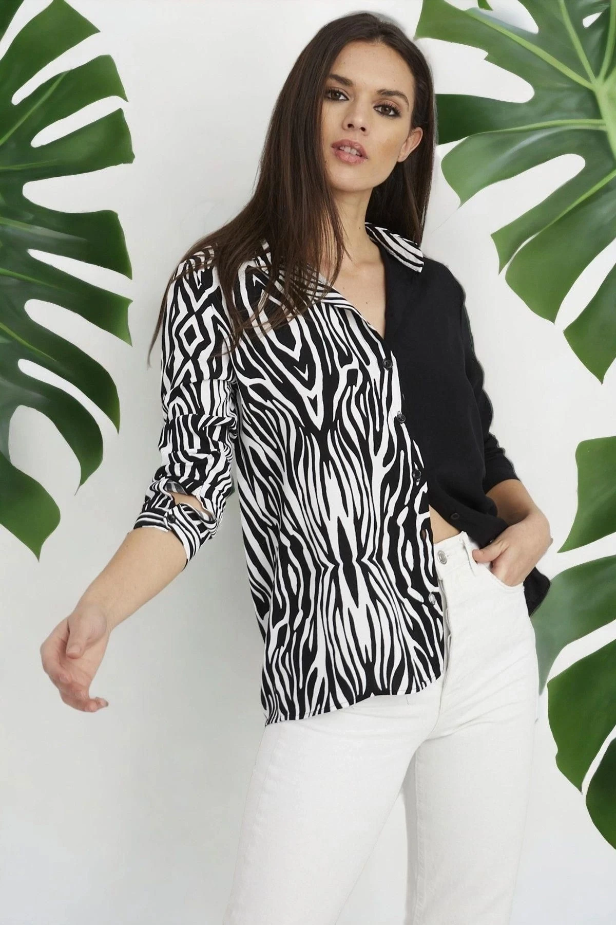 Kadın Siyah Klasik Yaka İki Renkli Zebra Desenli Uzun Kol Gömlek (Regular Kesim, Standart Boy)
