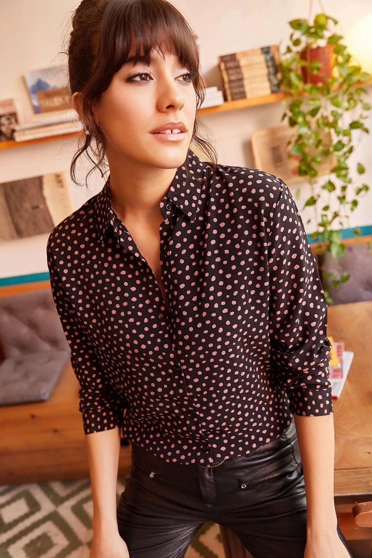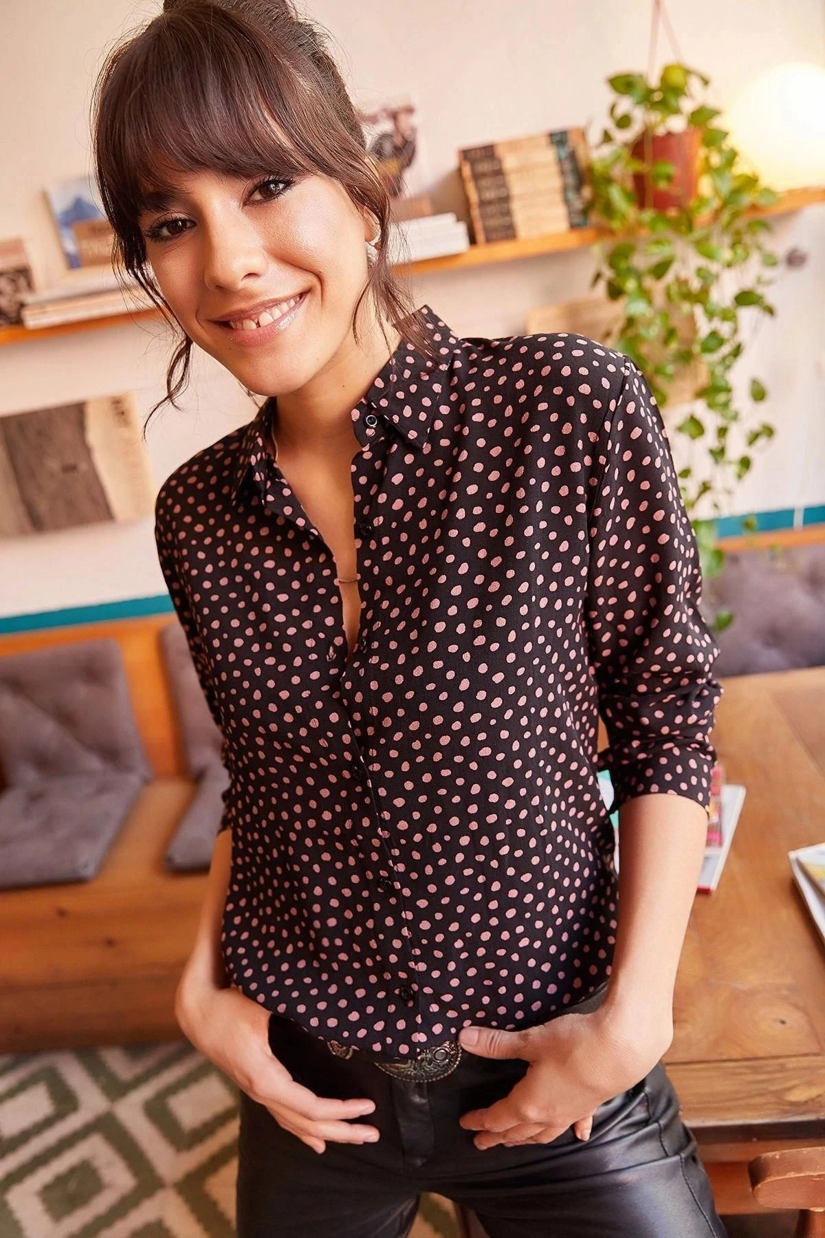 Bu klasik yaka puantiye detaylı gömlek, şık ve zamansız bir tarz sunmak için siyah renk seçeneğiyle tasarlandı.; Uzun kollu tasarımıyla, hem formel etkinliklerde hem de günlük giyimde rahatlıkla kullanabileceğiniz bir parça haline geliyor.; Bu gömleğin ana kumaşı %100 polyesterden oluşur.; Polyester, hafif ve dayanıklı bir malzemedir, bu nedenle giyimde rahatlık sağlar ve uzun süreli kullanımda dayanıklılığı garanti eder.; Ayrıca, kırışıklıklara karşı dirençli olması, kolayca ütülenebilmesi ve yıkamada renk solmasının önüne geçmesi gibi avantajları bulunmaktadır.; Siyah renk seçimi, gömleğe sofistike bir görünüm katarken aynı zamanda çok yönlülük sağlar.; Bu klasik renk, herhangi bir stil veya kombinle mükemmel bir şekilde uyum sağlar.; Gömleğin puantiye detayları ise cesur ve şık bir dokunuş ekler, tarzınıza canlılık katar.; Regular kesimi sayesinde, vücuda hoş bir şekilde oturur ve hareket özgürlüğü sağlar.; Standart boyu ise çoğu bedene uyum sağlar, böylece beden seçiminde daha kolaylık sağlar.; Bu gömlek, şık bir görünüm için idealdir.; Ofis ortamlarında, özel etkinliklerde veya günlük hayatta kullanabilirsiniz.; Klasik bir pantolon veya etekle kombinleyerek resmi bir tarz yakalayabilir veya daha rahat bir stil için kot pantolon ve sneaker'larla tamamlayabilirsiniz.; Bu gömlek, şıklığı ve konforu bir araya getiren mükemmel bir seçenektir.; Her mevsimde giyilebilecek ve gardırobunuzun vazgeçilmez bir parçası olacak.; Klasik ve şık bir tarz arayanlar için ideal bir tercihtir.