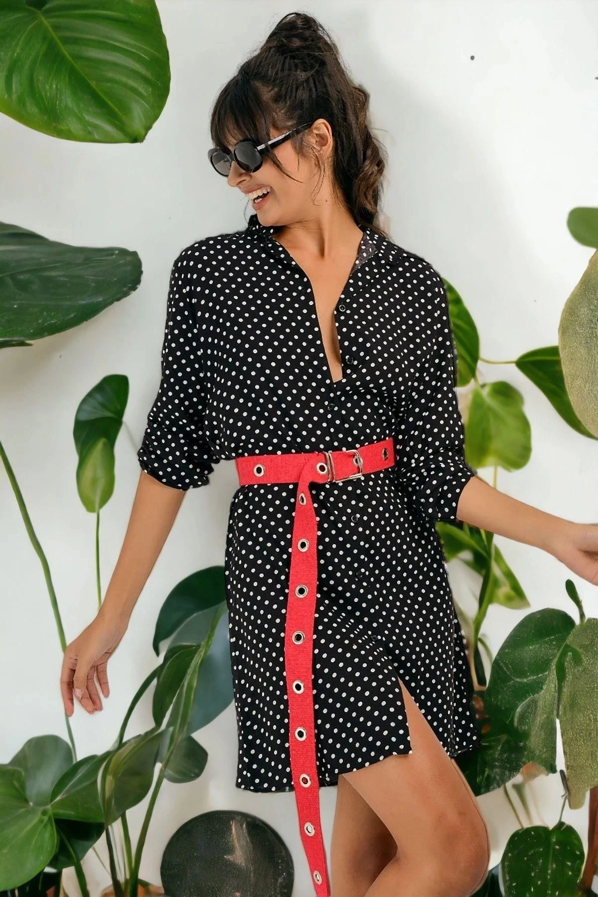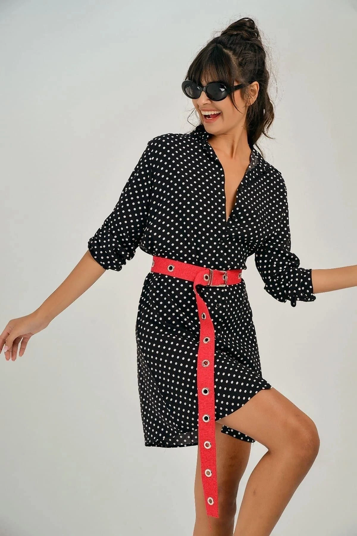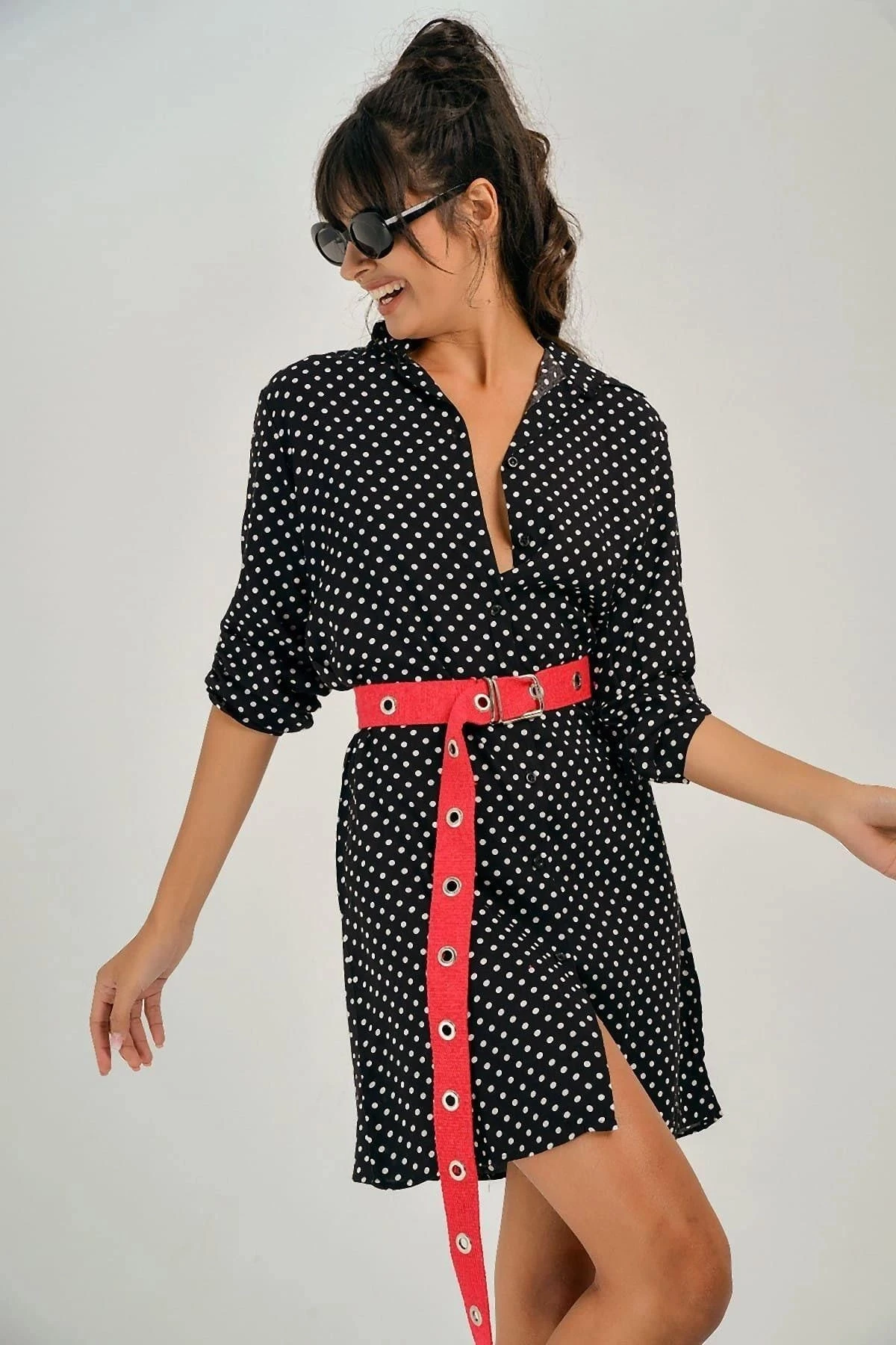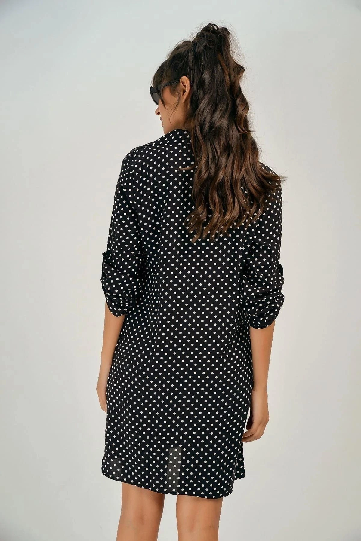 Bu şık ve şık Siyah Renk Klasik Yaka Puantiyeli Elbise, gardırobunuzun vazgeçilmez bir parçası olacak.; Uzun kollu ve midi boyuyla, herhangi bir ofis veya günlük aktivite için mükemmel bir seçimdir.; Bu elbisenin kumaş içeriği %95 Polyester ve %5 Elastane'dir, bu da ona rahatlık ve esneklik kazandırır.; Polyester, dayanıklı ve uzun ömürlü bir malzemedir, bu nedenle bu elbisenin size uzun süre eşlik edeceğinden emin olabilirsiniz.; Elastane ise elastiklik sağlar, böylece hareket özgürlüğünüzü kısıtlamadan rahatça hareket edebilirsiniz.; Siyah renk, her mevsime uyum sağlayan zamanlı bir seçimdir ve gardırobunuzdaki diğer parçalarla kolayca kombinlenebilir.; Klasik yaka tasarımı, zarafet ve sofistike bir hava katarken, puantiye deseni, elbiseye enerji ve canlılık katar.; Bu elbise, regular kesimi sayesinde her vücut tipine uyum sağlar ve şık bir siluet oluşturur.; Midi boyu, diz üstünde son derece şık ve zarif bir görünüm sunar.; Hem ofis ortamında profesyonel bir stil yaratmak için mükemmel bir tercih olan hem de günlük kullanıma uygun olan bu elbise, size çok yönlü bir giyim seçeneği sunar.; Siz de gardırobunuzdaki eksiksiz bir parça arıyorsanız, bu Siyah Renk Klasik Yaka Puantiyeli Elbise tam size göre.; İster iş ister günlük hayatta kullanın, tarzınızı ve zarafetinizi sergilemenin mükemmel bir yoludur.