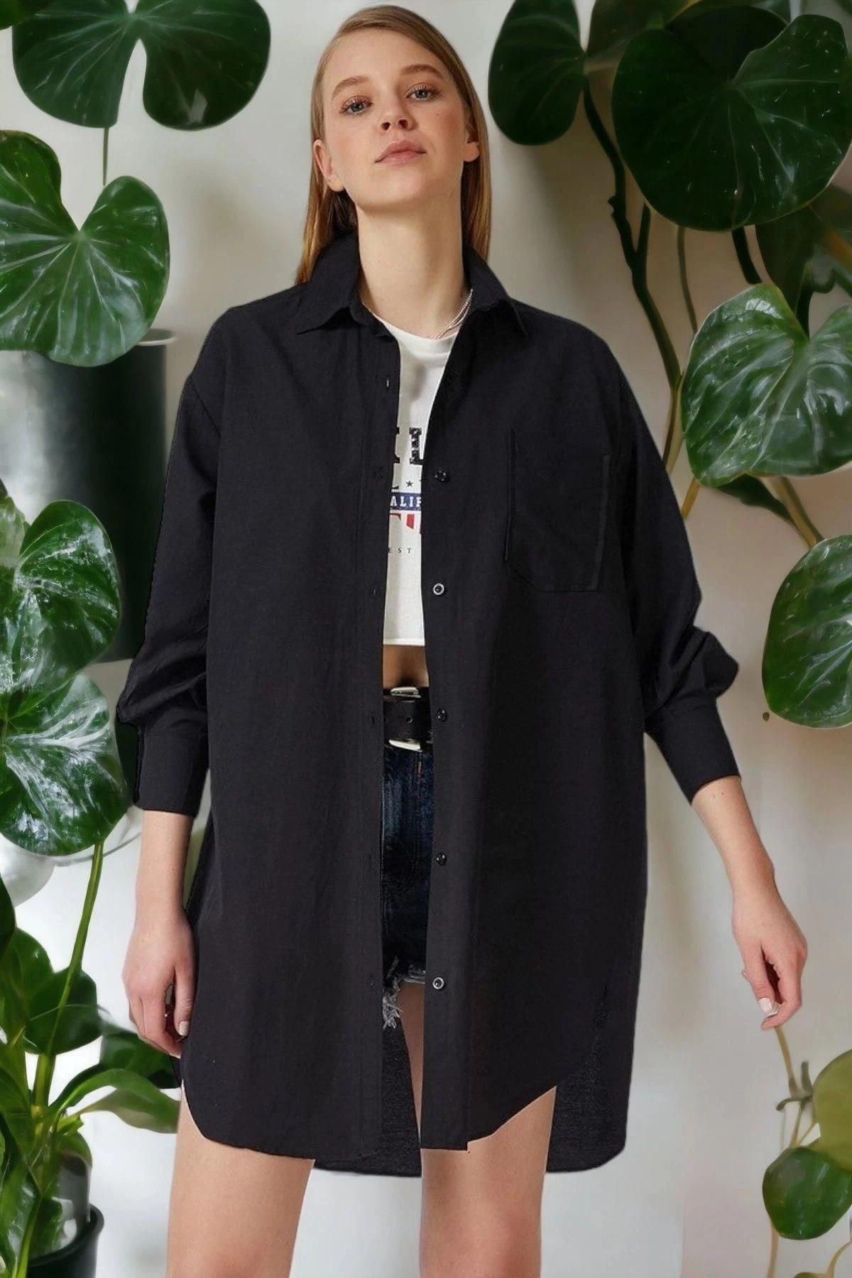 Bu şık ve modern Siyah Renk Klasik Yaka Uzun Kol Gömlek, gardırobunuzun vazgeçilmez bir parçası olacak.; Üstün kaliteli kumaşı ve dikkatlice tasarlanmış detaylarıyla öne çıkan bu gömlek, tarzınıza zarif bir dokunuş katacak.; Bu gömleğin ana kumaşı %95 pamuk ve %5 elastan içeriği ile mükemmel bir rahatlık sunar.; Pamuğun yumuşak dokusu, cildinizin nefes almasını sağlarken, elastan esnekliğiyle hareket özgürlüğü sunar.; Bu kombinasyon, gömleği gün boyu rahatlıkla giyebilmenizi sağlar.; Siyah renk, gömleği klasik ve şık bir görünüm kazandırırken aynı zamanda herhangi bir stil veya renk paletiyle kolayca uyum sağlar.; Gömleğin oversize kesimi, modern ve rahat bir tarz sunar.; Bu şekilde, vücut hatlarınızı sıkıştırmadan özgürce hareket etme imkanı bulursunuz.; Klasik yaka detayı, gömleğe sofistike bir hava katar ve herhangi bir ortama uyum sağlar.; Uzun kollu tasarımı, serin havalarda bile sizi sıcak tutar ve şıklığınızı tamamlar.; Cep detayları, kullanışlılık sunarken gömleğe ek bir stil öğesi katmaktadır.; Ayrıca, bu gömleğin yırtmaçlı maksi boy kesimi, hareket özgürlüğü sağlarken modern ve feminen bir görünüm elde etmenizi sağlar.; Kumaşın kaliteli yapısı, dayanıklılığını artırır ve gömleği uzun süre kullanmanızı sağlar.; Bu Siyah Renk Klasik Yaka Uzun Kol Gömlek, herhangi bir şıklık veya rahatlık arayan kişiye uygun bir seçenektir.; Herhangi bir mevsimde ve herhangi bir etkinlikte güvenle giyebilirsiniz.; Tarzınıza sofistike bir dokunuş katmak ve rahatlıktan ödün vermeden şık görünmek için bu gömleği tercih edebilirsiniz.
