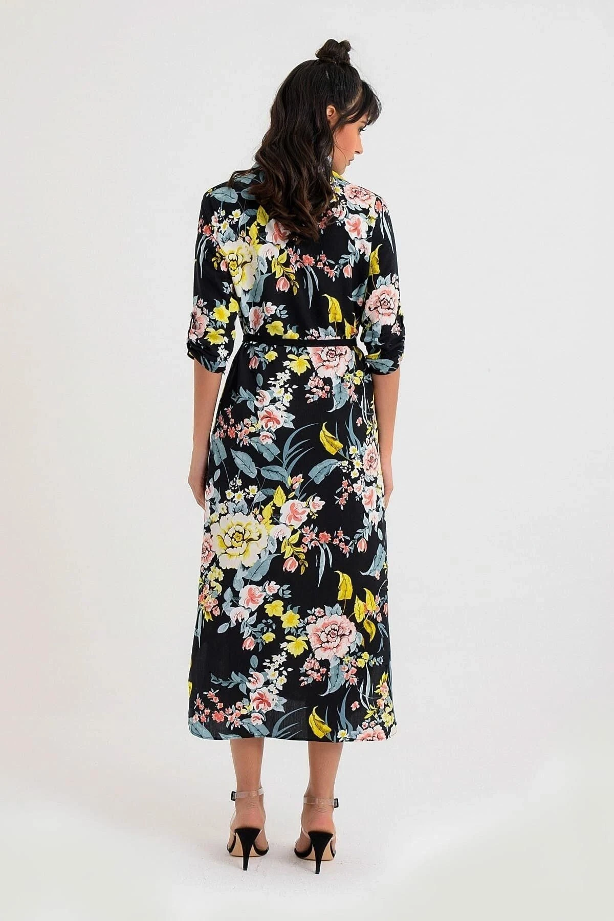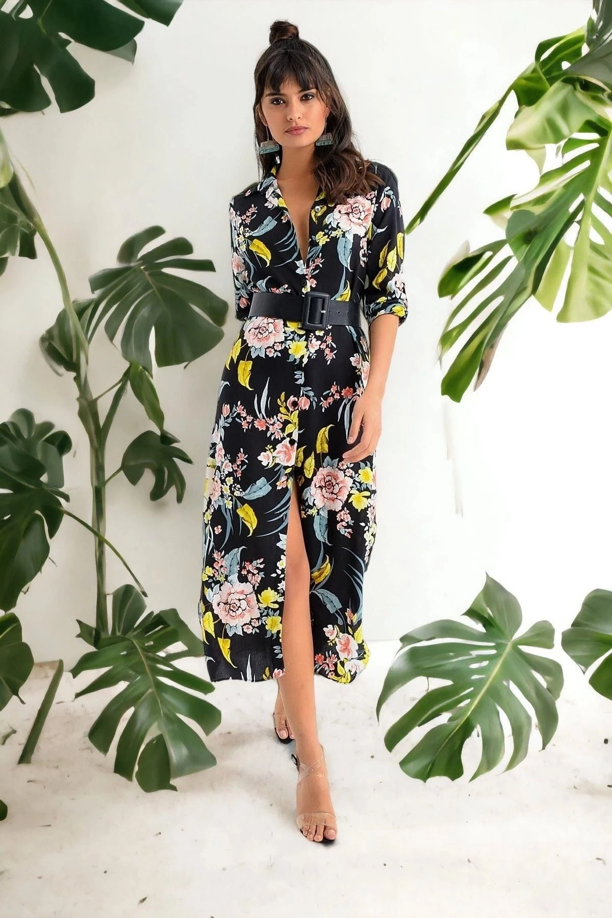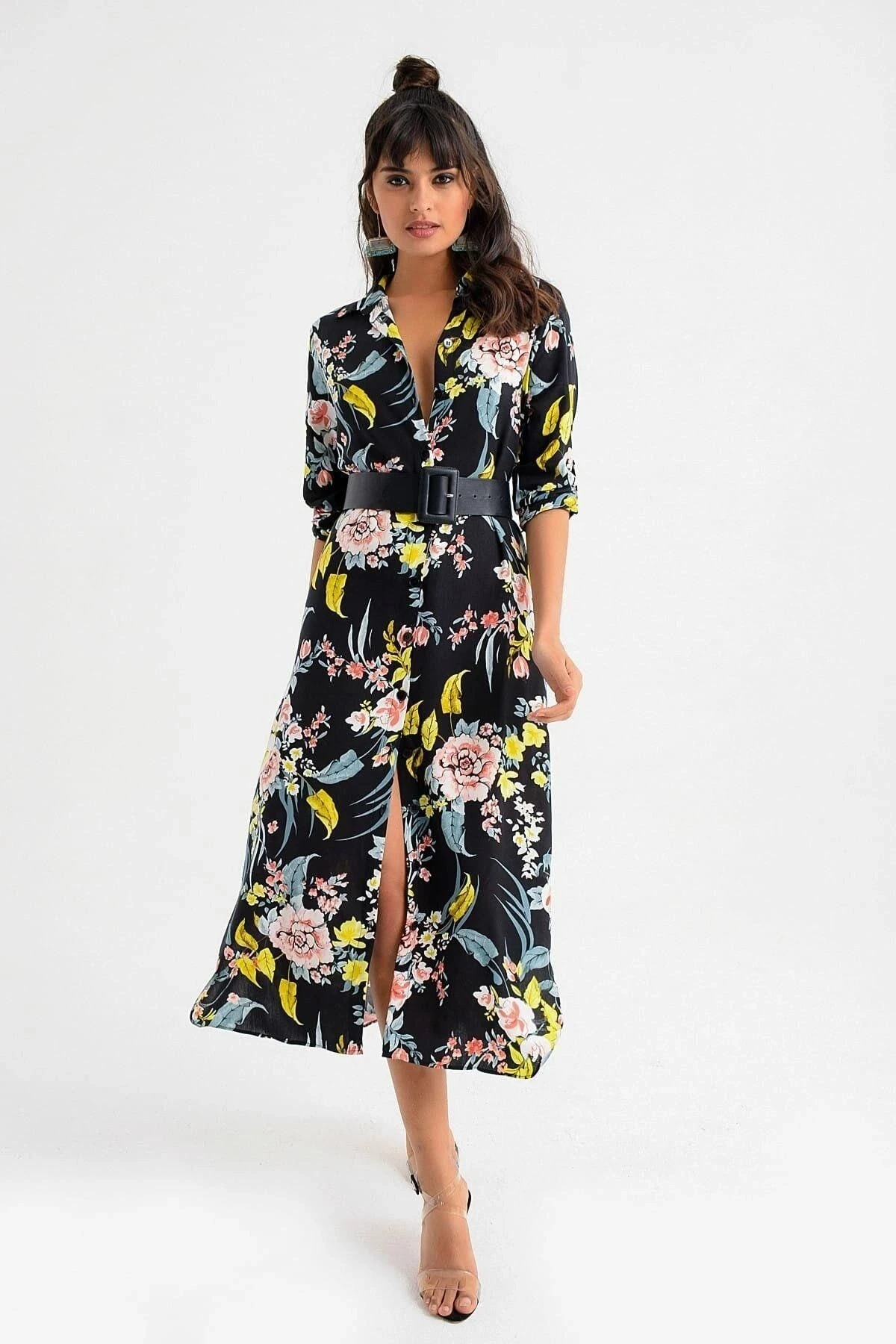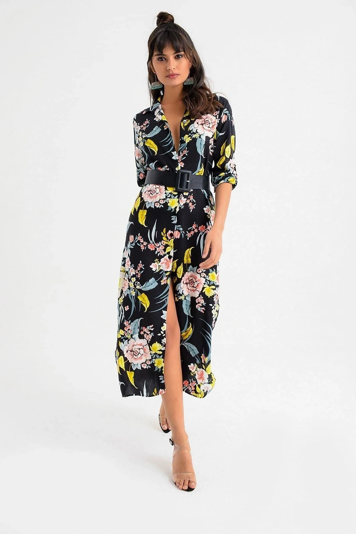 Kadın Siyah Klasik Yaka Uzun Kol Çiçek Desenli Kemer Detaylı Maksi Boy Uzun Rahat Ve Günlük Elbise
