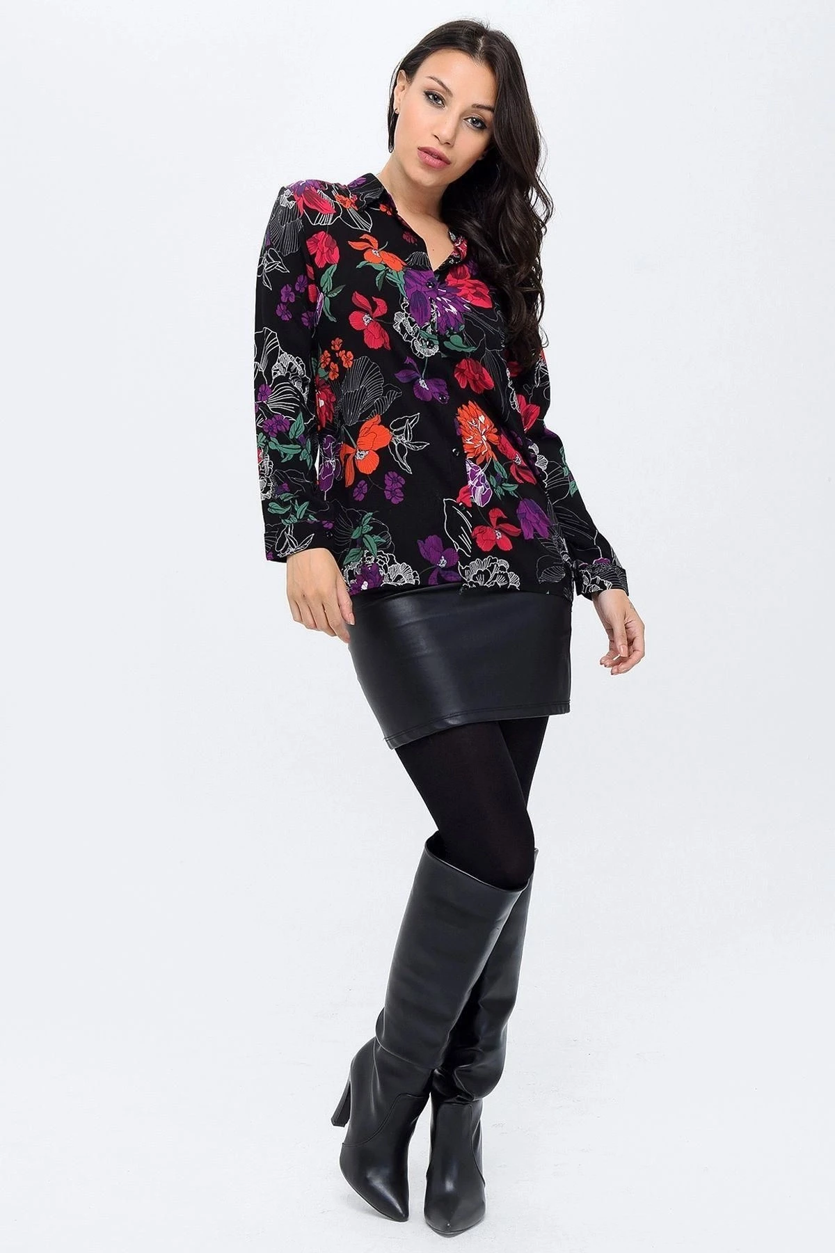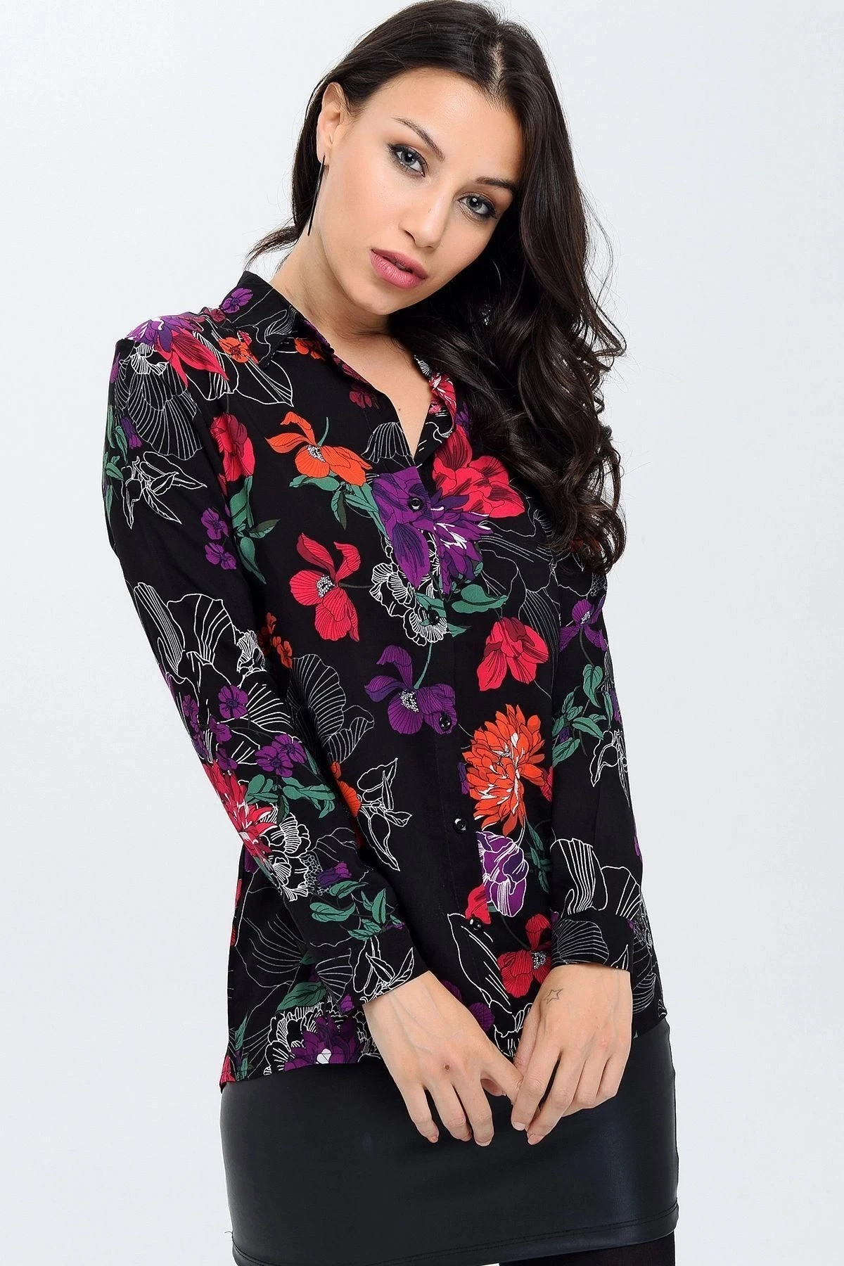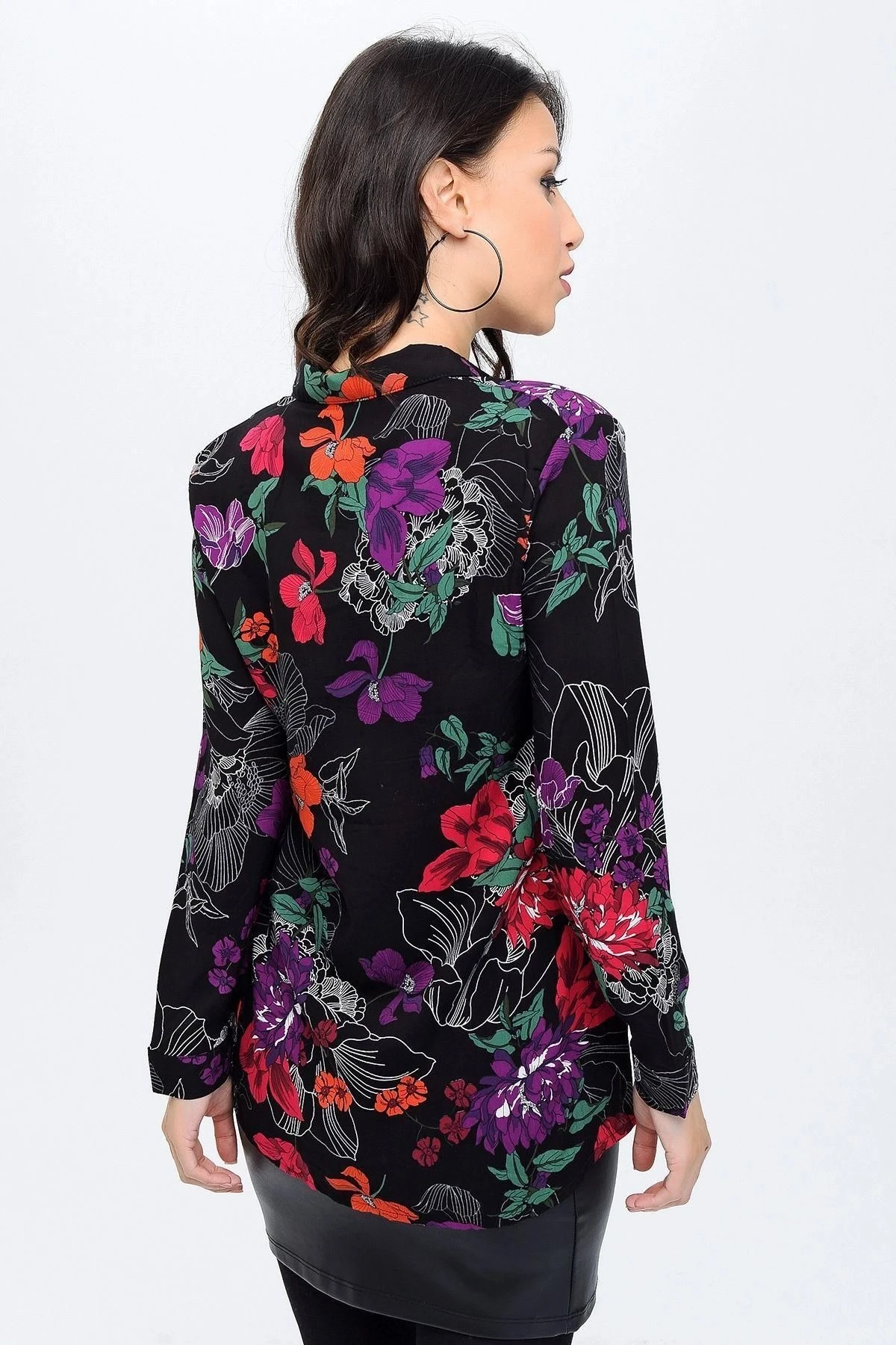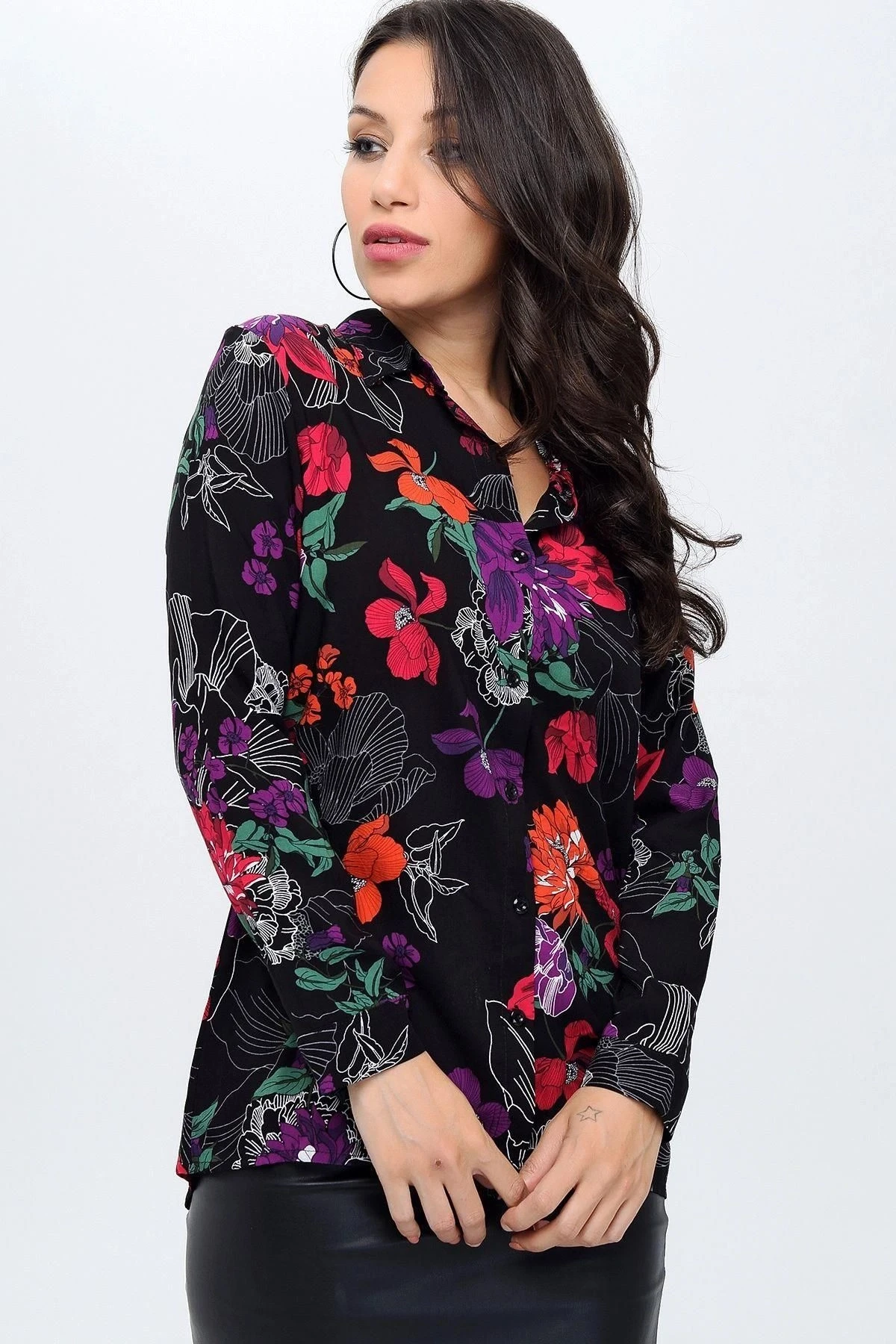 Bu çiçek desenli gömlek, klasik bir yaka tasarımına sahip olup, şık ve modern bir görünüm sunar.; Uzun kollu olması sayesinde hem yaz hem de kış aylarında rahatlıkla kullanabilirsiniz.; Gömleğin standart boyu, her bedene uyum sağlar.; Bu gömleğin ana malzemesi %100 viskoz kumaştan yapılmıştır.; Viskoz, yumuşak dokusuyla bilinen bir sentetik elyaf türüdür.; Bu kumaş türü, nefes alabilen ve hava geçirgenliği yüksek bir yapıya sahiptir, böylece size gün boyu rahatlık sağlar.; Aynı zamanda, gömleğin üzerindeki çiçek desenleri, göze hoş gelen bir görünüm sunar ve gömleği daha şık hale getirir.; Siyah renkli tasarımı, herhangi bir kıyafetle kolayca kombin yapabilmenizi sağlar.; Bu gömleği günlük yaşamda veya özel bir etkinlikte giyebilir, herhangi bir ortama zarafet katabilirsiniz.; Regular kesimi, vücudu sıkıca sarmadan rahat bir oturuş sağlar ve hareket özgürlüğünüzü kısıtlamaz.; Bu çiçek desenli gömlek, şıklığı ve konforu bir araya getiren mükemmel bir seçenektir.; İster günlük kullanım için ister özel bir etkinlikte giymek için olsun, bu gömlek size tarzınızı ifade etme imkanı sunar.
