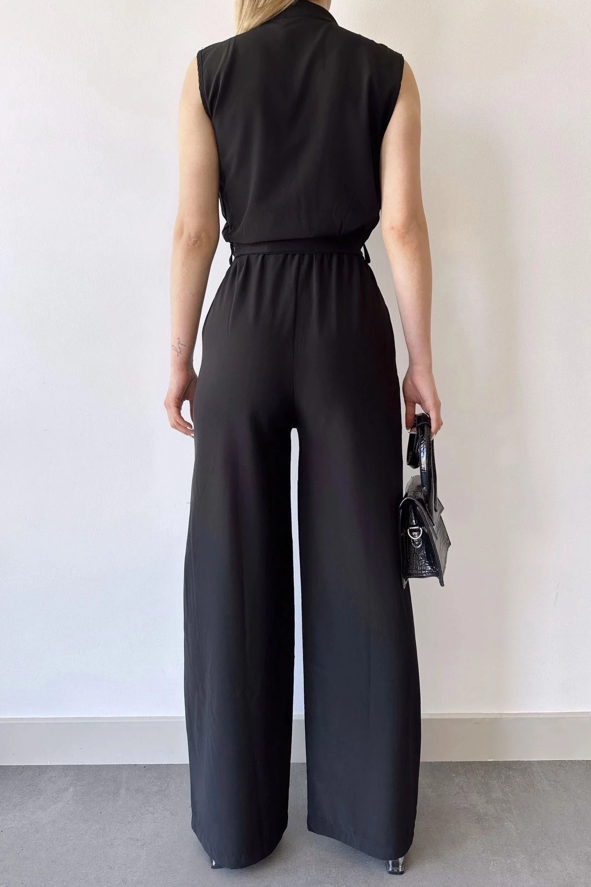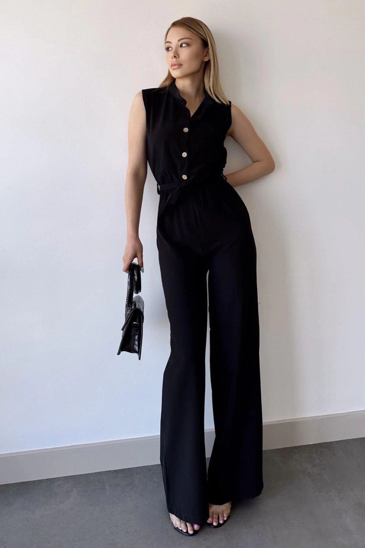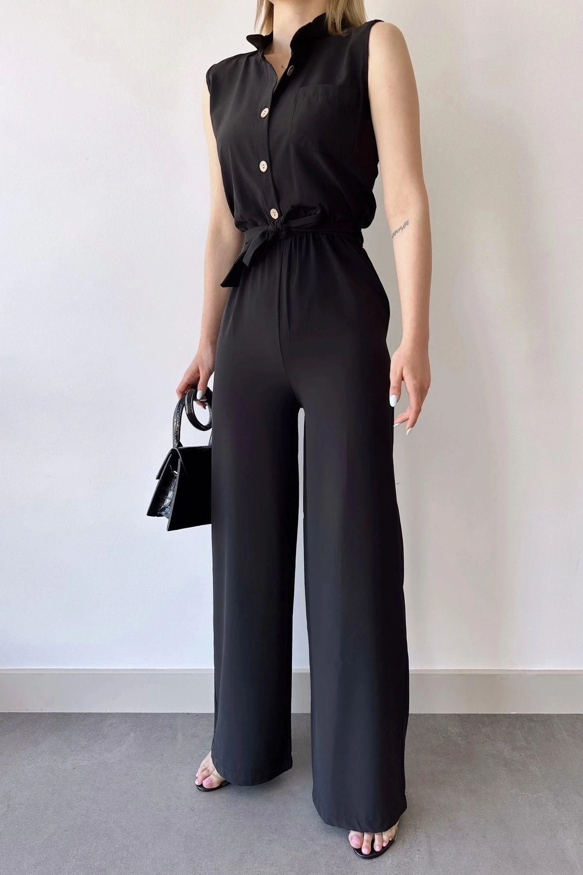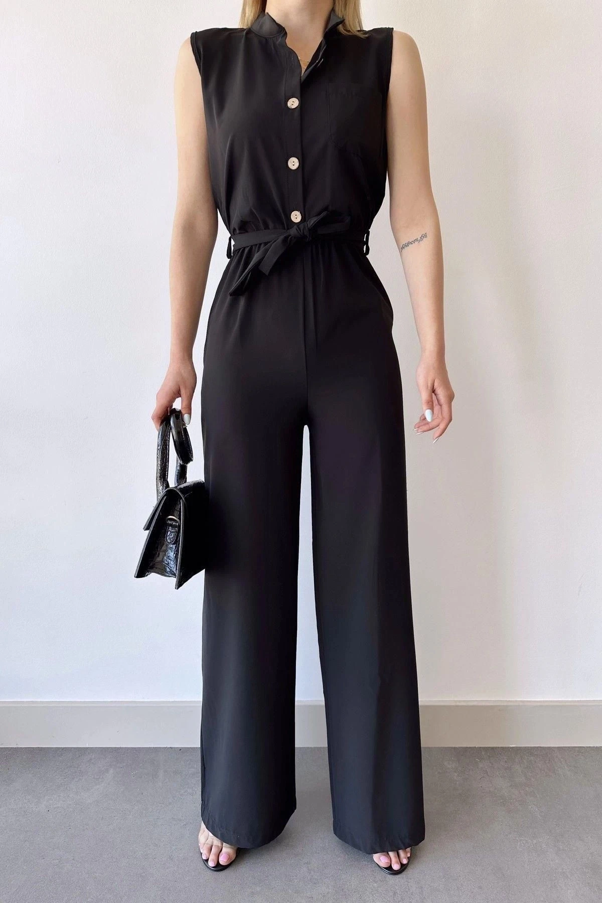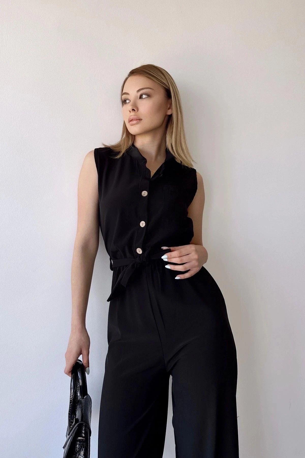 Bu kadın siyah kolsuz dik yaka kuşaklı uzun tulum, şıklık ve rahatlığı bir araya getiriyor.; Elbisenin kumaşı %95 polyester ve %5 elastan karışımından oluşur.; Bu karışım, elbisenin esneklik ve hareket özgürlüğü sağlarken aynı zamanda dayanıklılığını artırır.; Dik yaka tasarımı, elbiseye modern ve şık bir görünüm kazandırırken aynı zamanda boyun bölgesini güzel bir şekilde vurgular.; Düz deseni, sade ve minimalist bir tarzı yansıtır ve farklı aksesuarlarla kolayca kombinlenebilir.; Standart kalıp/kesimi, elbisenin vücuda uyumlu bir şekilde oturmasını sağlar ve rahat bir giyim deneyimi sunar.; Bu kesim, her bedene uygun bir tarzı temsil eder.; Aerobin kumaşı, hafif ve nefes alabilen bir yapıya sahiptir.; Bu sayede elbiseyi rahatlıkla giyebilir ve gün boyu ferahlığı hissedebilirsiniz.; Kuşak detayı, elbisenin bel bölgesinde yer alır ve vücuda şekil verir.; Bu detay, beli vurgular ve kadınsı bir siluet oluşturur.; Bu siyah kolsuz dik yaka düz desenli tek cepli aerobin kuşaklı uzun tulum, şıklık ve rahatlık arayan kadınlar için ideal bir seçenektir.; %95 polyester ve %5 elastan karışımıyla, elbise esneklik ve dayanıklılık sunar.; Dik yaka tasarımı, modern ve şık bir görünüm sağlar.; Düz deseni, sade ve minimalist bir tarzı yansıtır.; Standart kalıp/kesimi, vücuda uyumlu bir oturuş ve rahatlık sunar.; Aerobin kumaşı, hafif ve nefes alabilirlik özelliğiyle rahat bir giyim deneyimi sunar.; Kuşak detayı, beli vurgular ve kadınsı bir siluet oluşturur.; Bu uzun tulum, özel etkinliklerden günlük kullanıma kadar çeşitli durumlarda tarzınızı tamamlamak için mükemmel bir seçenektir.; Gardırobunuzun vazgeçilmez bir parçası olacak.