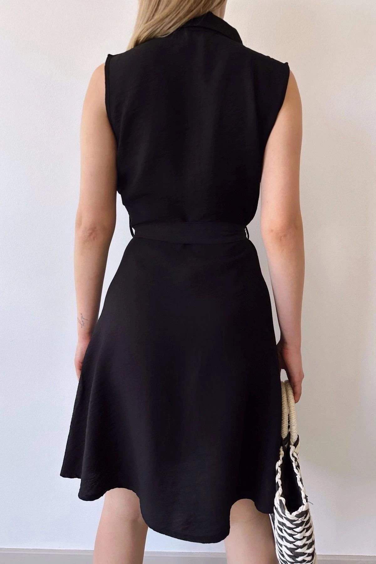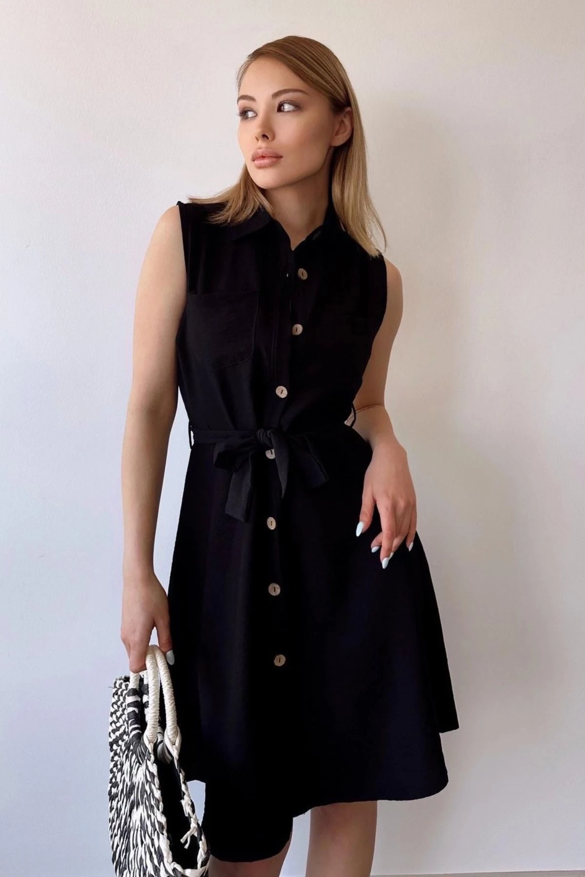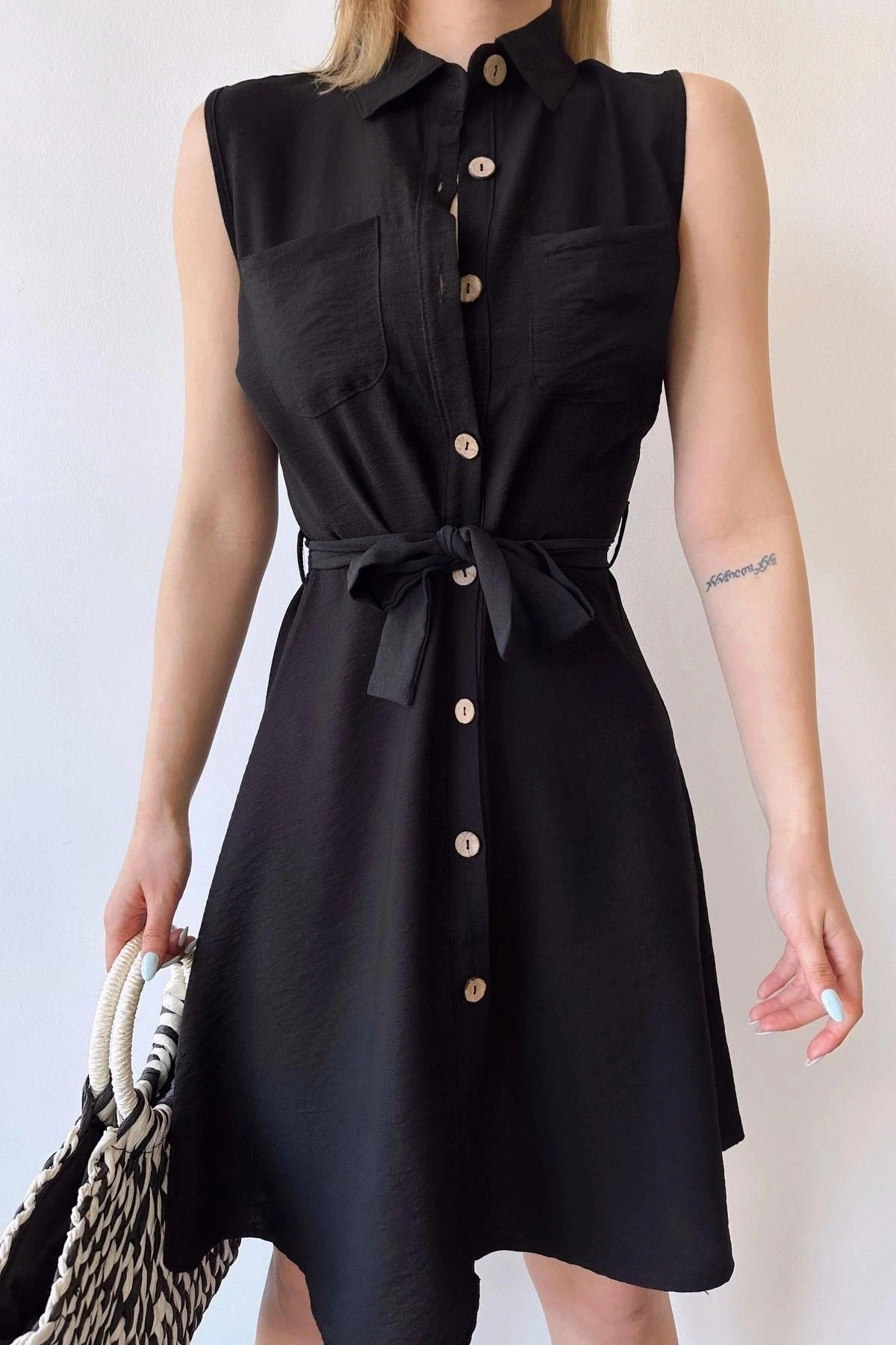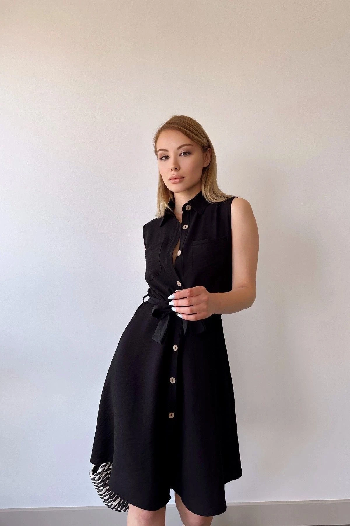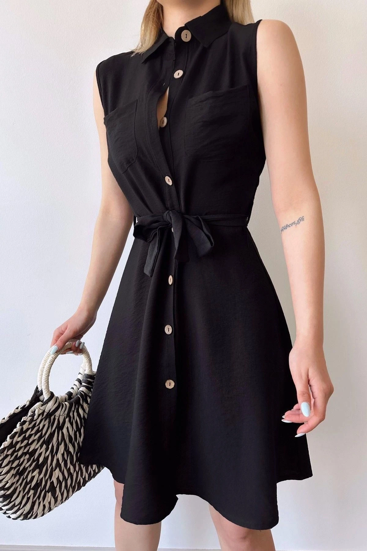 Bu kadın siyah kolsuz gömlek yaka düz renk desenli çift cepli midi elbise, rahatlık ve şıklığı bir araya getiriyor.; Elbisenin kumaşı %60 polyester ve %40 pamuk karışımından oluşur.; Bu karışım, elbisenin dayanıklılığını artırırken aynı zamanda hafif ve nefes alabilir bir yapı sağlar.; Gömlek yaka tasarımı, klasik ve zarif bir görünüm sunar.; Düz renk deseni, sade ve minimalist bir tarzı yansıtır ve farklı aksesuarlarla kolayca kombinlenebilir.; A-line kalıp/kesimi, elbisenin üst kısmından aşağı doğru genişleyen bir siluet oluşturur.; Bu kesim, vücut hatlarını güzel bir şekilde dengeleyerek feminen bir görünüm sağlar.; Elbisenin çift cepli detayları hem şıklık hem de işlevsellik sunar.; Bu cepler, elbiseye kullanışlı bir özellik katar ve aynı zamanda stile katkıda bulunur.; Aerobin kumaşı, hafif ve esnek bir yapıya sahiptir.; Bu sayede elbiseyi rahatlıkla giyebilir ve hareket özgürlüğüne sahip olabilirsiniz.; Kuşak detayı, elbisenin bel bölgesinde yer alır ve vücuda şekil verir.; Bu detay, beli vurgular ve kadınsı bir siluet oluşturur.; Bu siyah kolsuz gömlek yaka düz renk desenli çift cepli aerobin kumaşlı kuşaklı midi elbise, şıklık ve rahatlık arayan kadınlar için mükemmel bir seçenektir.; %60 polyester ve %40 pamuk karışımıyla, elbise dayanıklılık ve nefes alabilirlik sunar.; Gömlek yaka tasarımı, klasik ve zarif bir görünüm sağlar.; Düz renk deseni, sade ve minimalist bir tarzı yansıtır.; A-line kalıp/kesimi, feminen bir siluet oluşturur ve vücuda denge sağlar.; Çift cepli detaylar hem şıklık hem de kullanışlılık sunar.; Aerobin kumaşı, hafif ve esnek bir yapıya sahiptir.; Kuşak detayı ise beli vurgular ve kadınsı bir siluet oluşturur.; Bu midi elbise, özel etkinliklerden günlük kullanıma kadar çeşitli durumlarda tarzınızı tamamlamak için idealdir.; Gardırobunuzun vazgeçilmez bir parçası olacak.