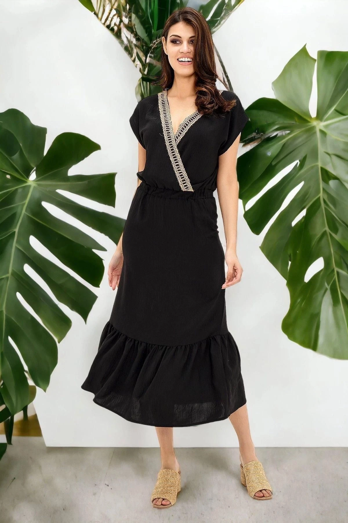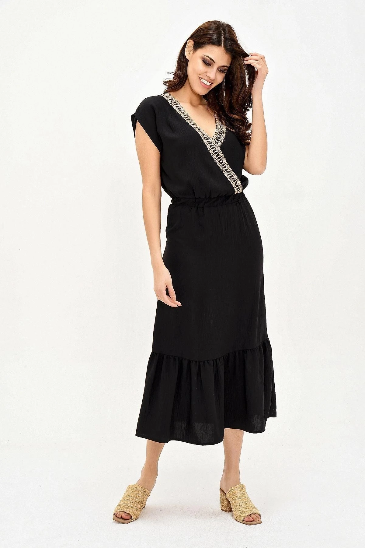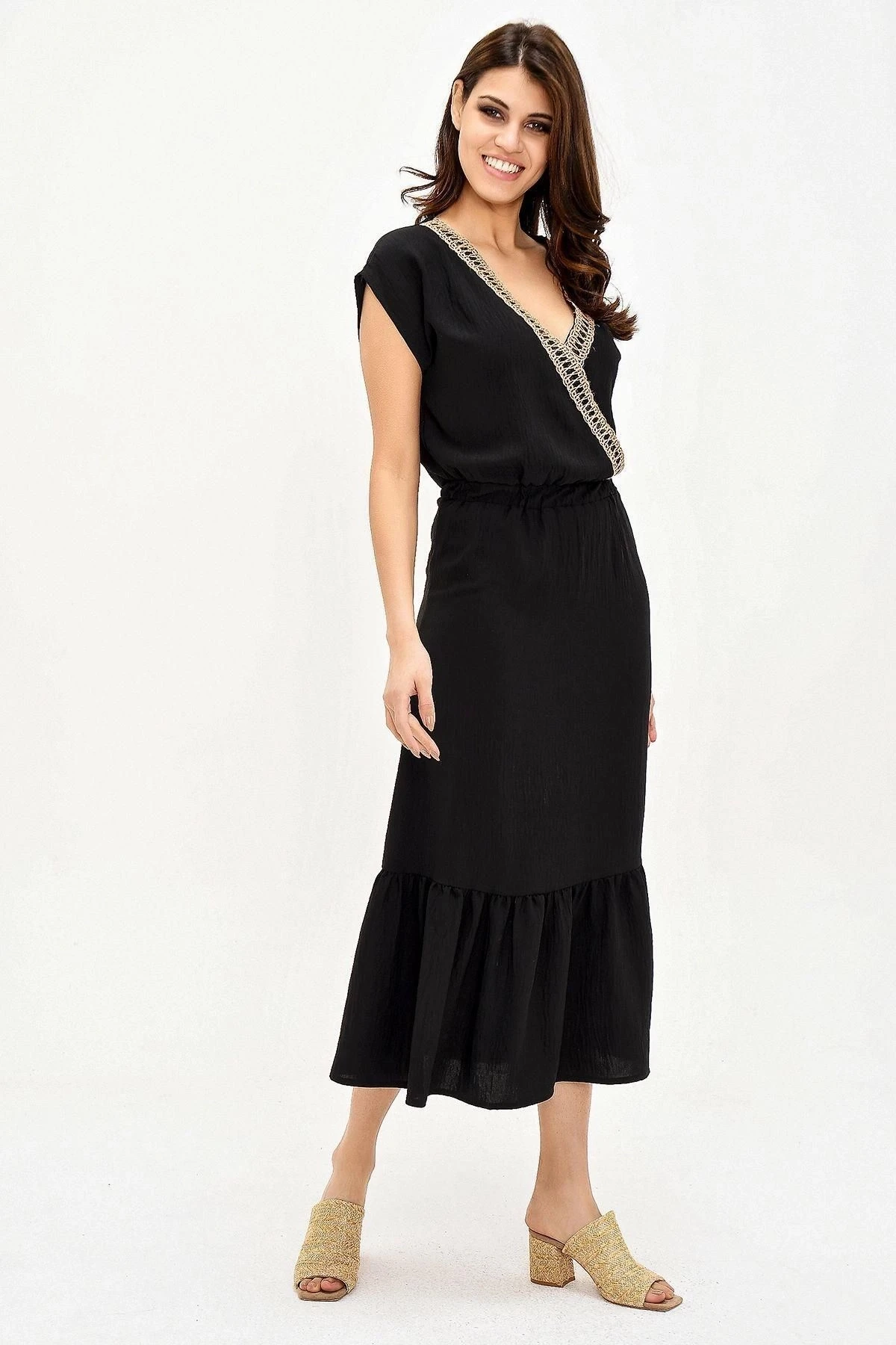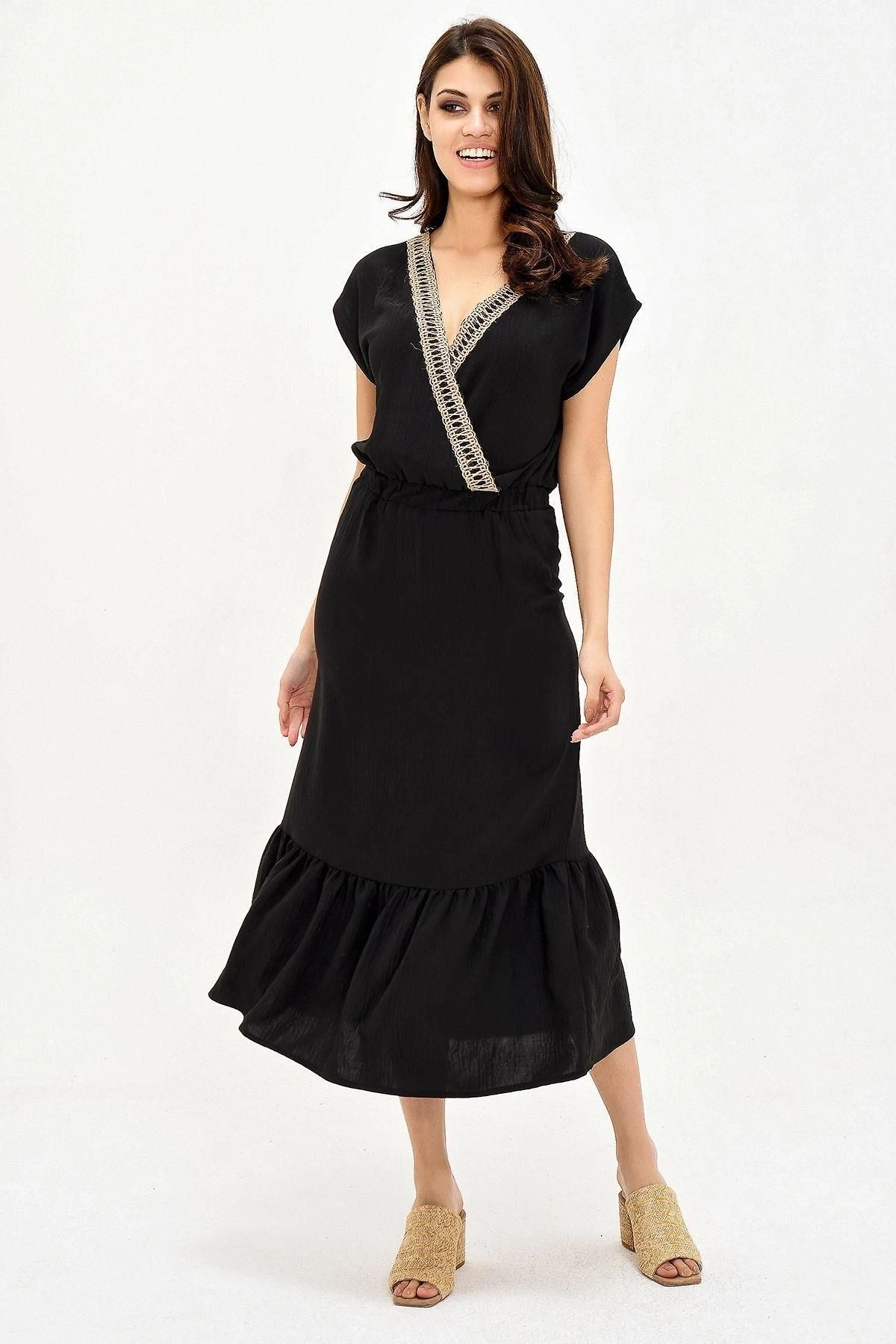 Bu siyah renkli kruvaze hasır detaylı kısa kollu maksi elbise, rahatlık ve şıklığı bir araya getiren harika bir seçenektir.; Elbisenin tasarımı, modern ve zarif detaylarla zenginleştirilmiştir.; Kumaş içeriği %60 polyester ve %40 pamuktan oluşur, bu da elbisenin hem dayanıklı hem de nefes alabilen bir yapıya sahip olduğunu gösterir.; Polyester, elbisenin uzun süre formunu korumasını sağlar, aynı zamanda kolay bakımıyla da dikkat çeker.; Pamuk ise yumuşaklık ve konfor sağlar, cildinizin rahat nefes almasını sağlar.; Bu elbisenin maksi boyu, modern ve zarif bir görünüm sunar.; Uzun kesimi sayesinde her beden tipine uyum sağlar ve vücut hatlarını kusursuz bir şekilde vurgular.; Kruvaze detayları, elbiseye ekstra bir cazibe katarken, hasır detaylar da bohem bir hava yaratır.; Siyah renk, her mevsimde ve her durumda şıklığı garantiler.; Klasik ve zamansız bir seçim olan siyah, her türlü kombinle mükemmel bir şekilde uyum sağlar.; Bu elbiseyi iş yerinde, arkadaş buluşmalarında veya özel etkinliklerde rahatlıkla giyebilirsiniz.; Bu maksi elbise, günlük kullanım için idealdir.; Rahat ve şık bir tarz yaratırken hareket özgürlüğünü de korur.; Hem şıklığından hem de konforundan ödün vermek istemeyenler için mükemmel bir seçenektir.; Bu siyah renkli kruvaze hasır detaylı kısa kollu maksi elbise, stil sahibi kadınlar için mükemmel bir tercih olacaktır.; Kumaş kalitesi, renk seçimi ve tasarım detaylarıyla sizi etkileyecek ve şıklığınızı ön plana çıkaracaktır.