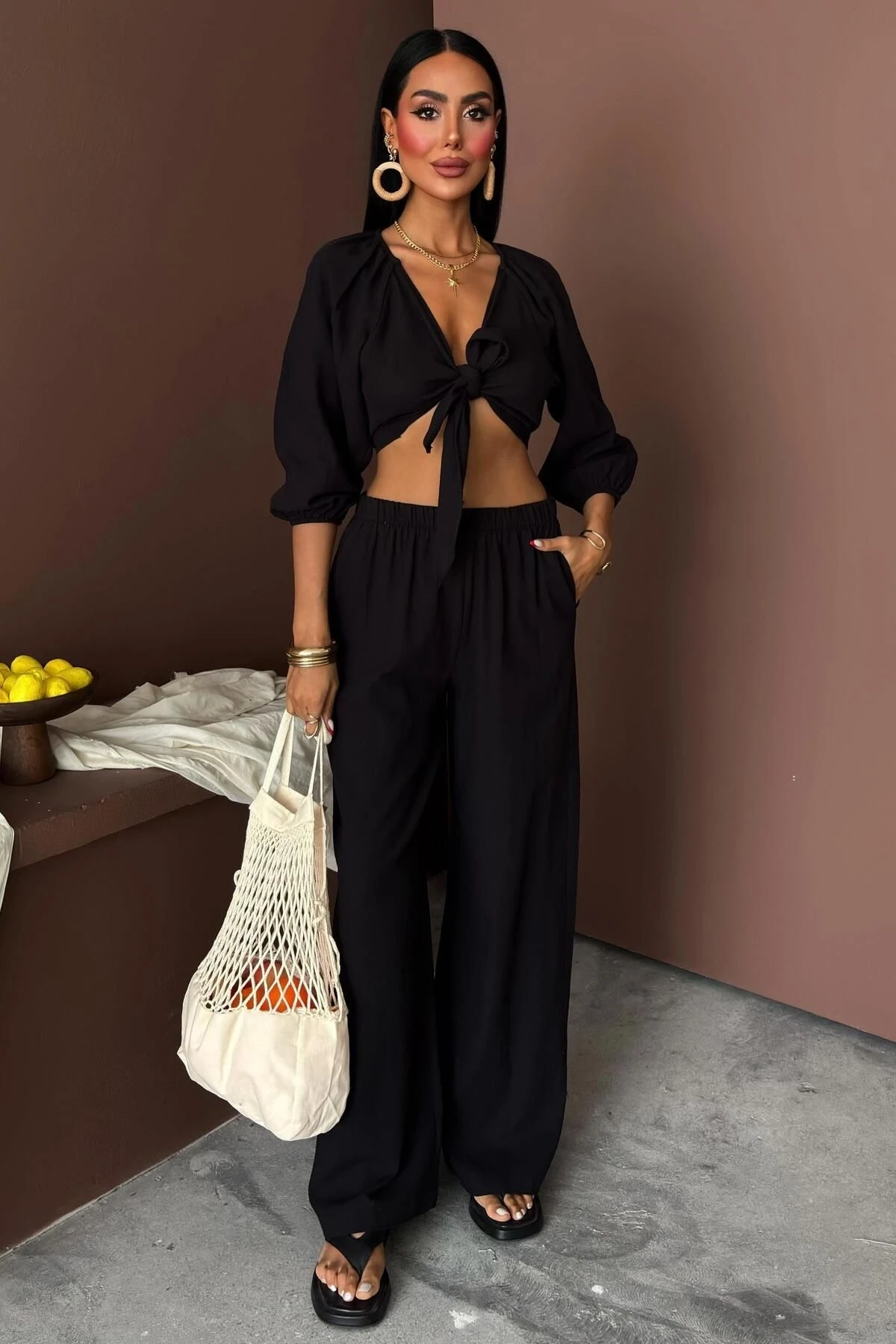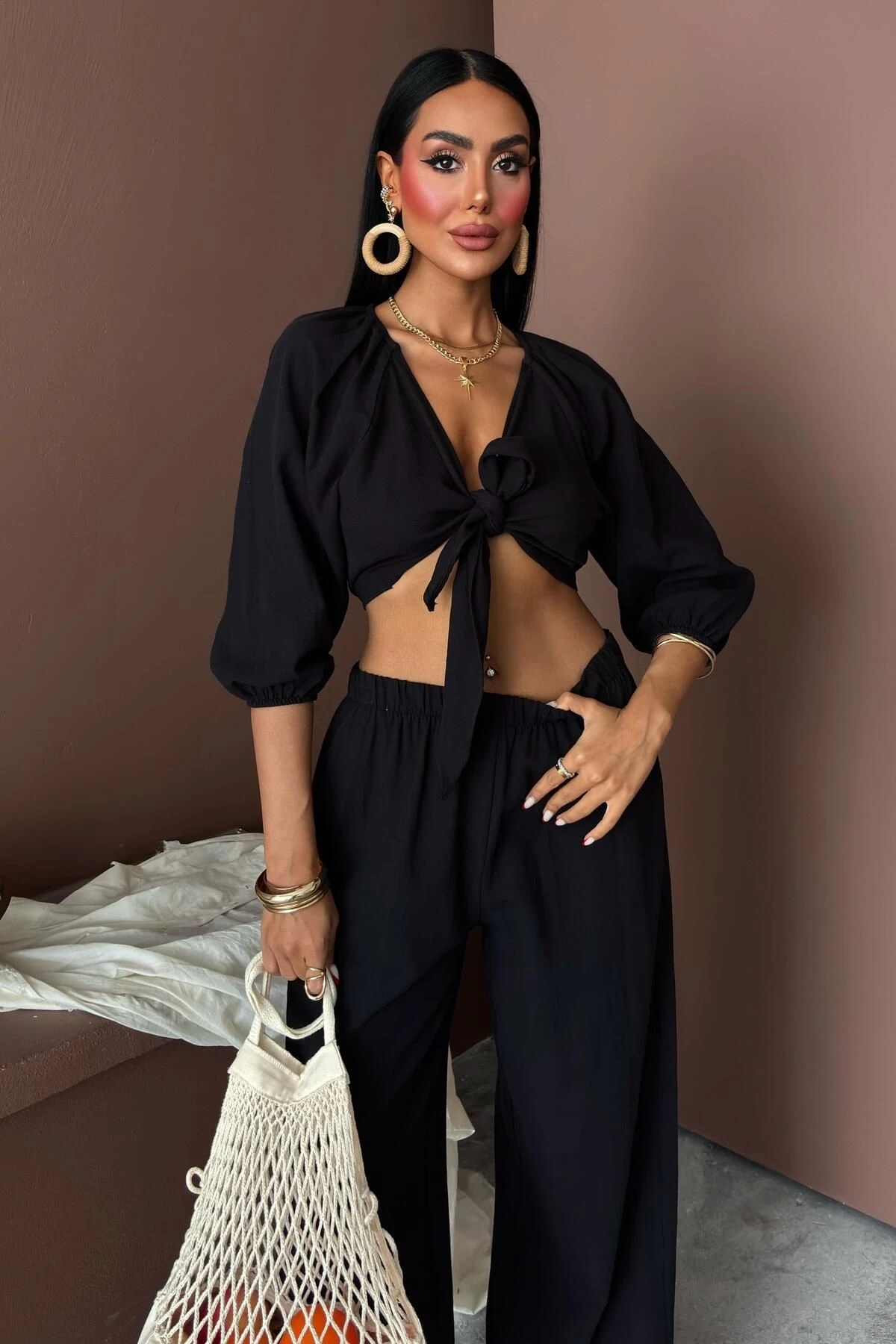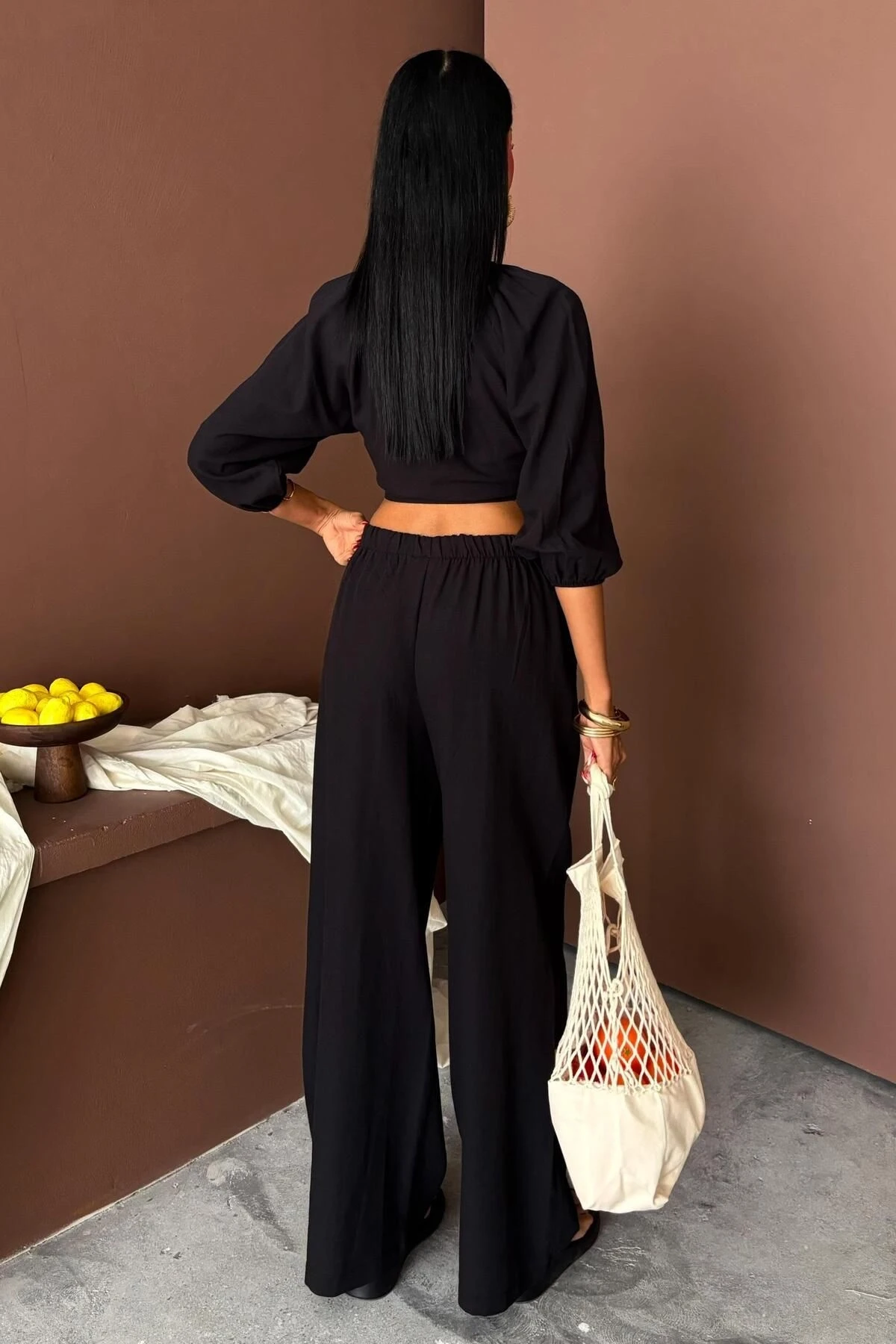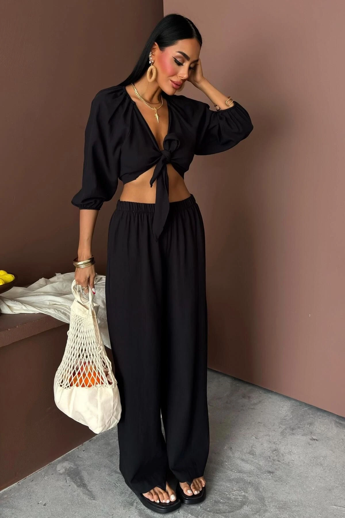 Kadın Siyah Kruvaze Keten Balon Kollu Uzun Takım