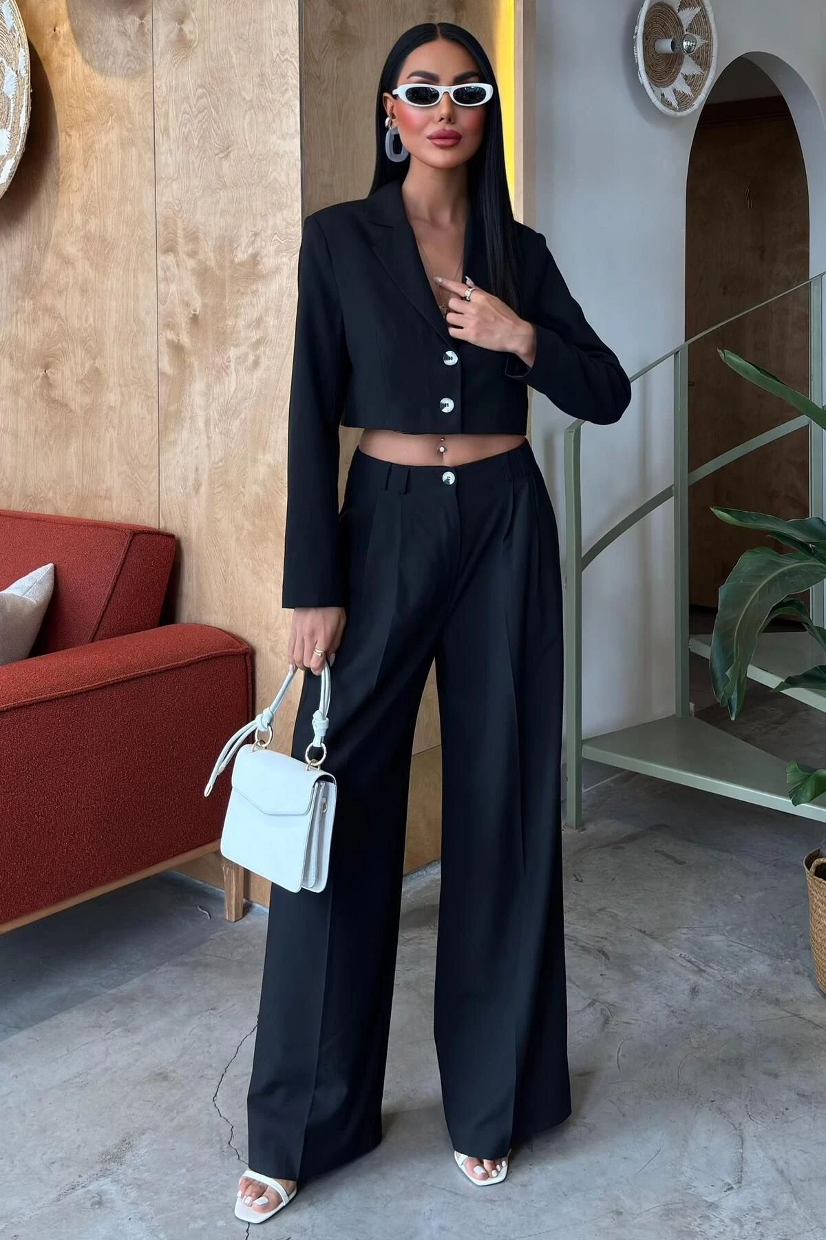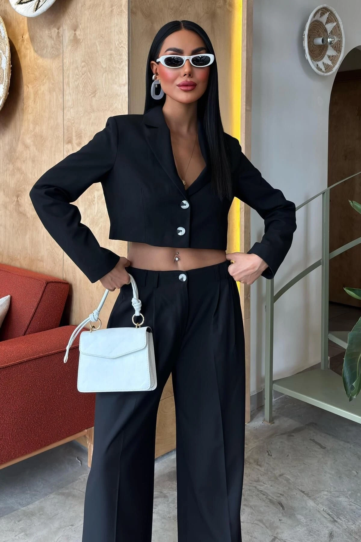 Kadın Siyah Kruvaze Pes Dokuma Crop Takım