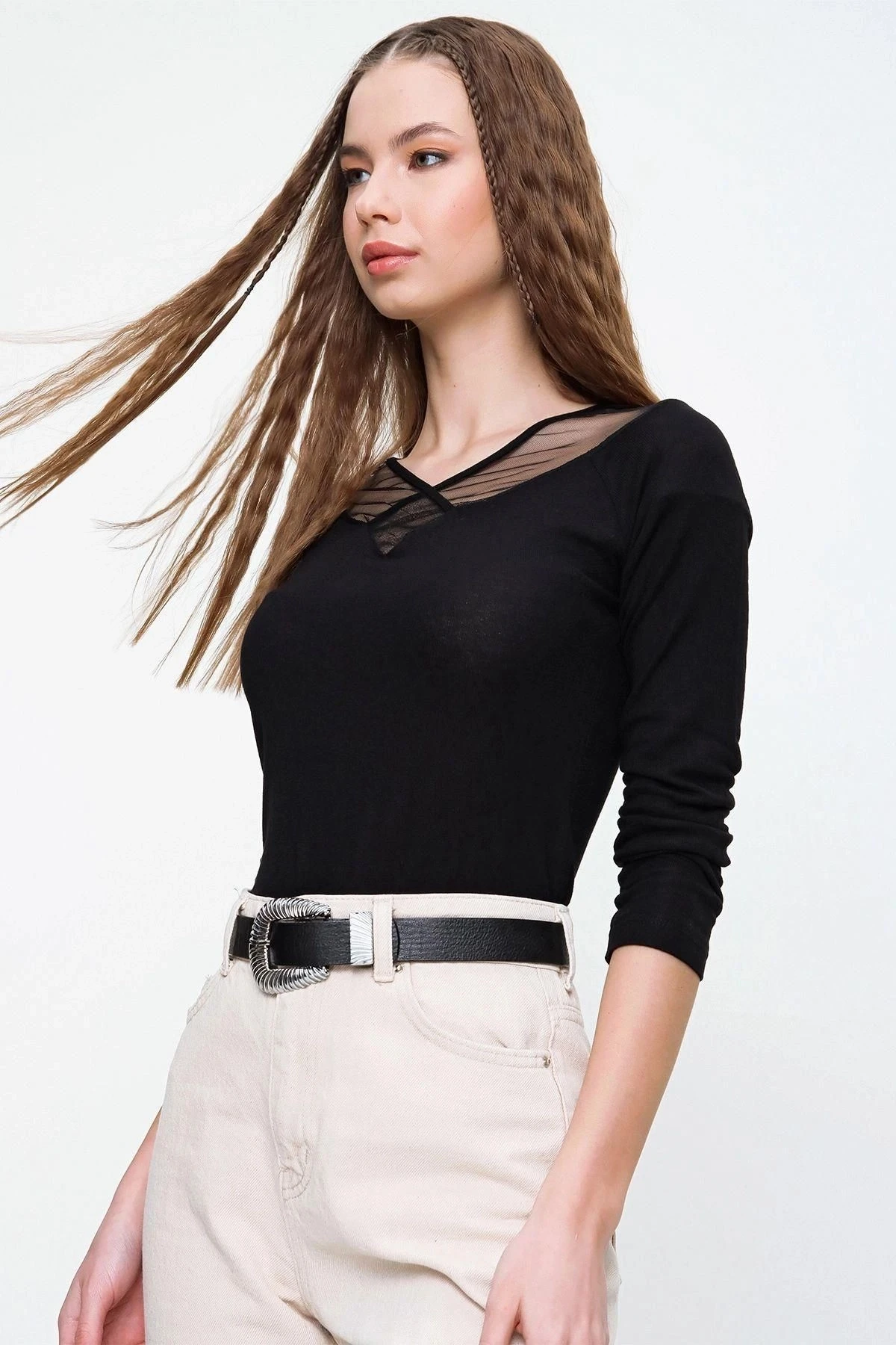 Kadın Siyah Kruvaze Tül Detaylı Bluz Uzun Kol Tül Dantel Garnili Regular Kesim V Yaka Yakası