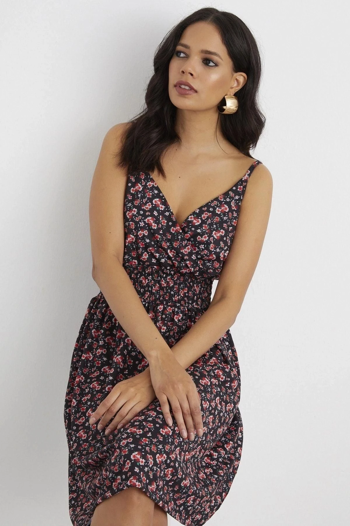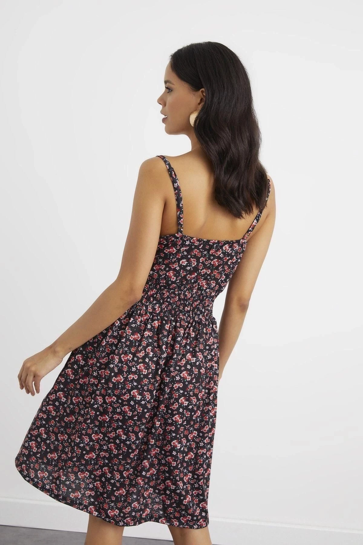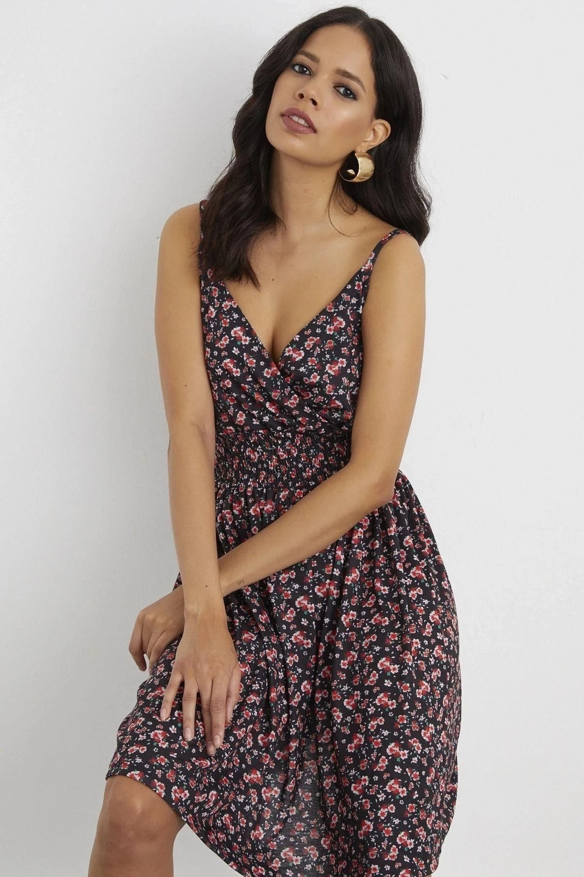Kadın Siyah Kruvaze Yaka Askılı Kol Çiçek Desenli Pili Detaylı A Kesim Midi Boy Diz üstü Elbise